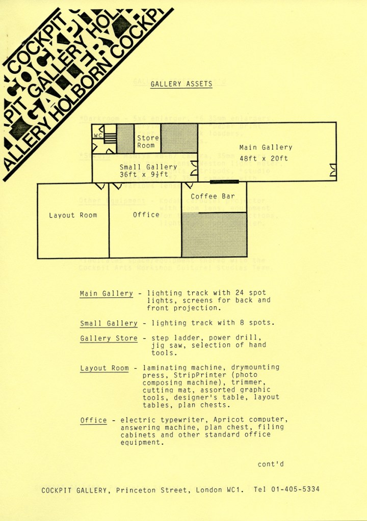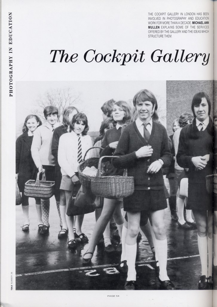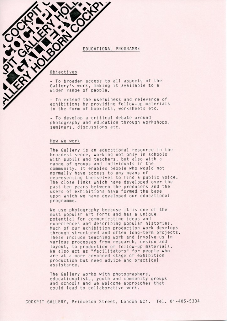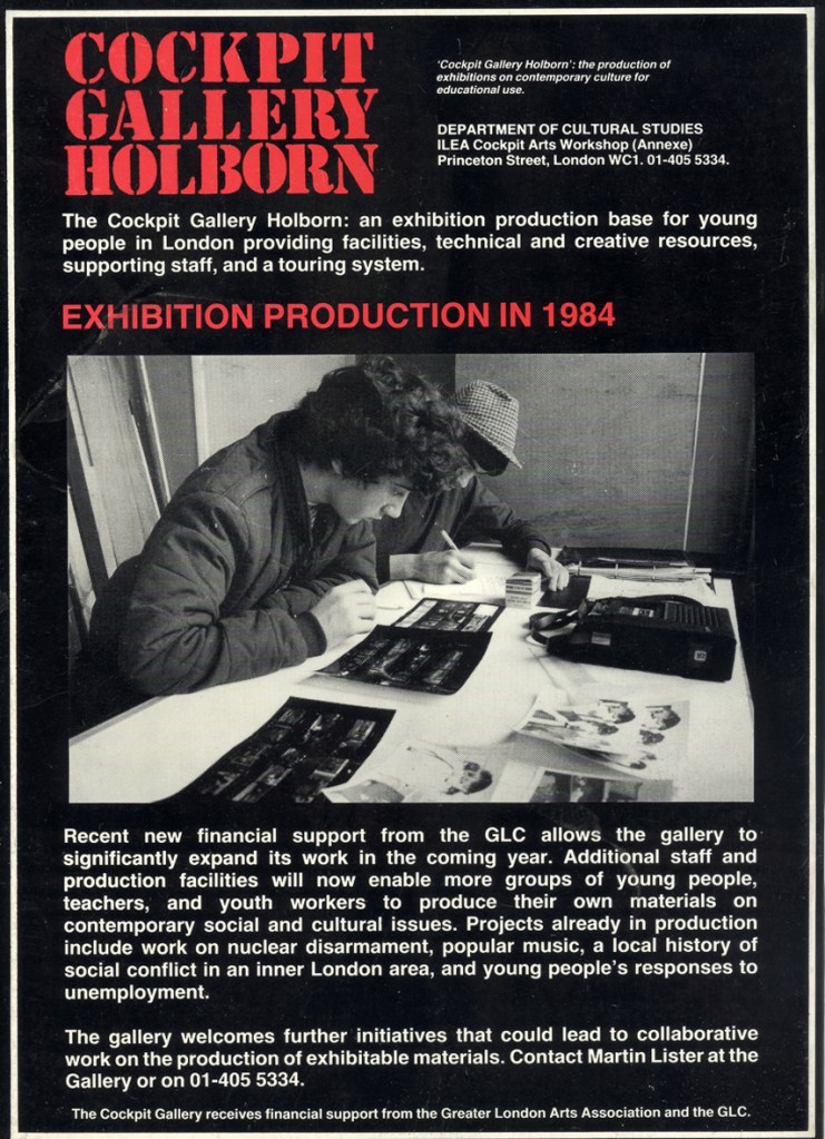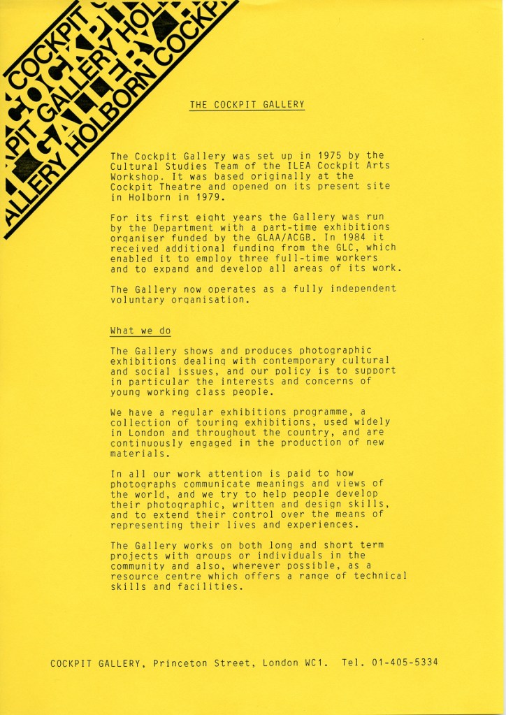 The Cockpit Gallery was set up in 1975 by the Cultural Studies Department of the Inner London Education Authority, Cockpit Arts Workshop. Based originally at the Cockpit Theatre in Gateforth Street, it opened at Princeton Street in Holborn, London in 1979. The gallery showed and produced photographic exhibitions dealing with contemporary cultural and social issues, and their policy was to privilege the interests and concerns of young working-class people. Each year during school terms they had approximately 8 exhibitions on display. Entrance was free and school groups were encouraged to visit. They also organised meetings related to the work on display and ran courses and workshops.