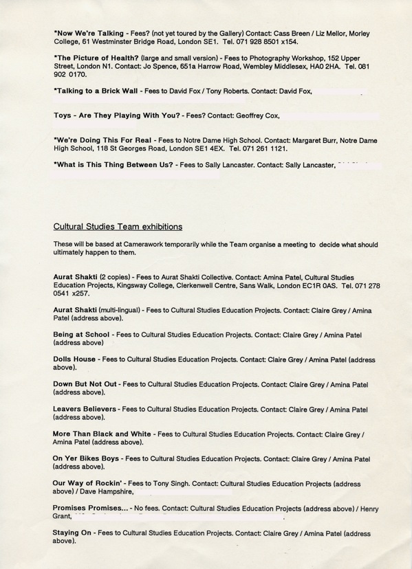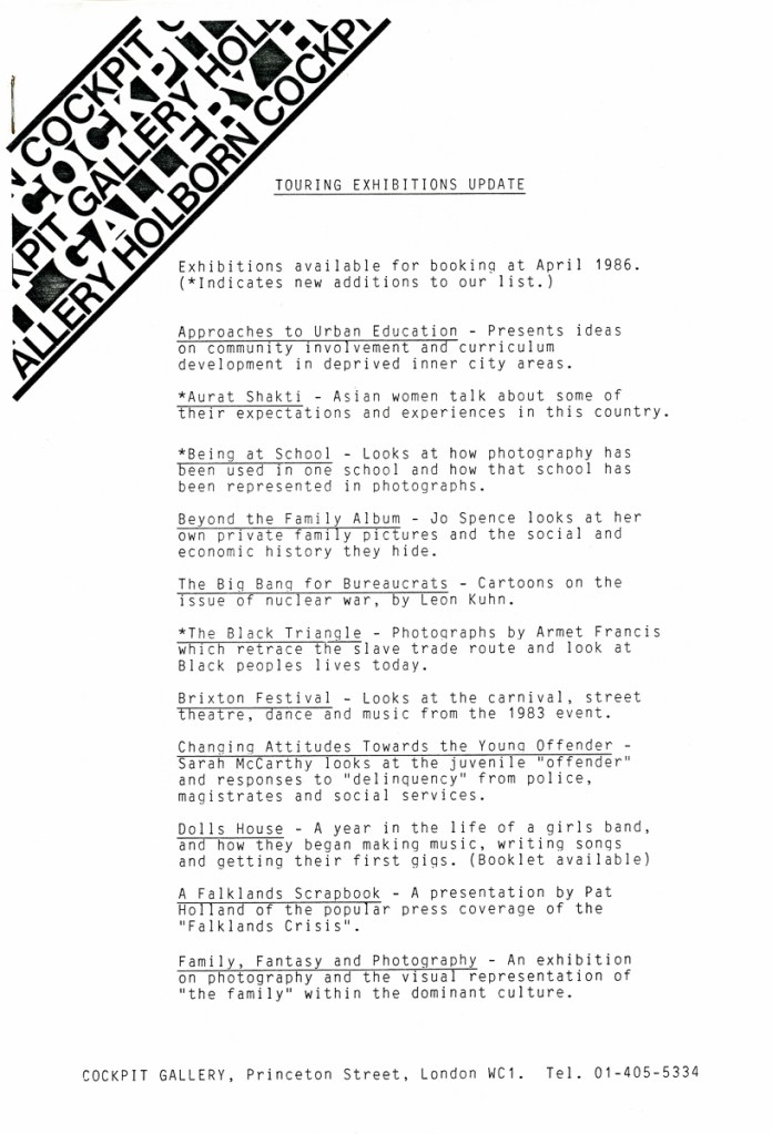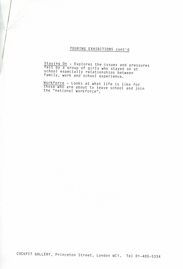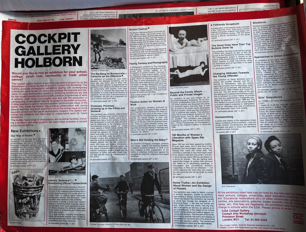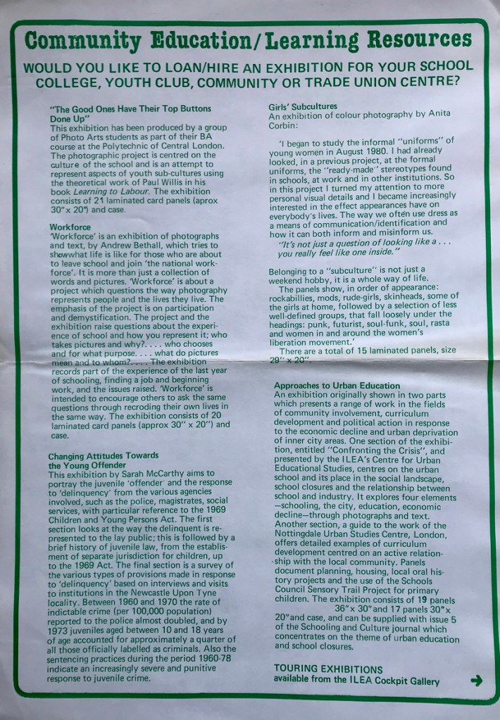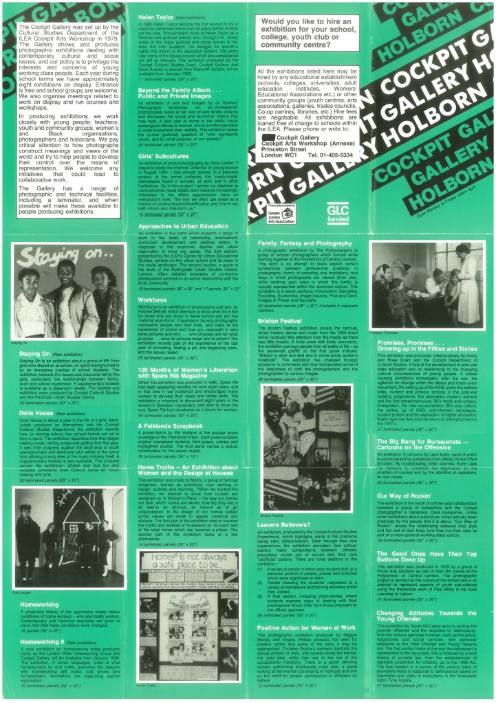 In producing hand-printed photographs and text laminated into portable exhibitions, they worked closely with young people, teachers, youth and community groups, women’s and black organisations, photographers and historians. They paid critical attention to how photographs constructed meanings and views of the world. (At a time when access to making photographs was both more expensive and difficult to do, they) tried to help people develop their control over the means of representation. They welcomed any initiatives that would lead to future collaborations. The Gallery had a range of photographic and technical facilities, including a laminating machine, making them available to people producing exhibitions.