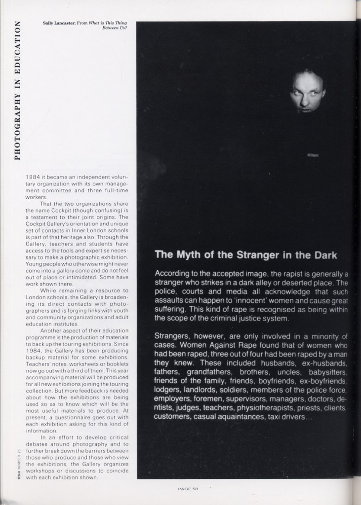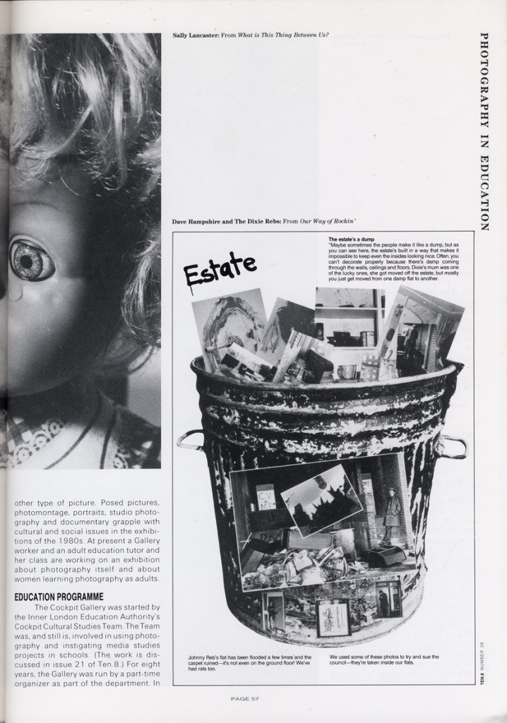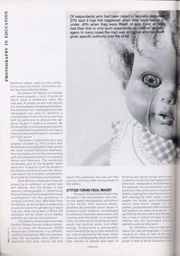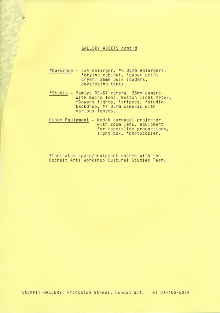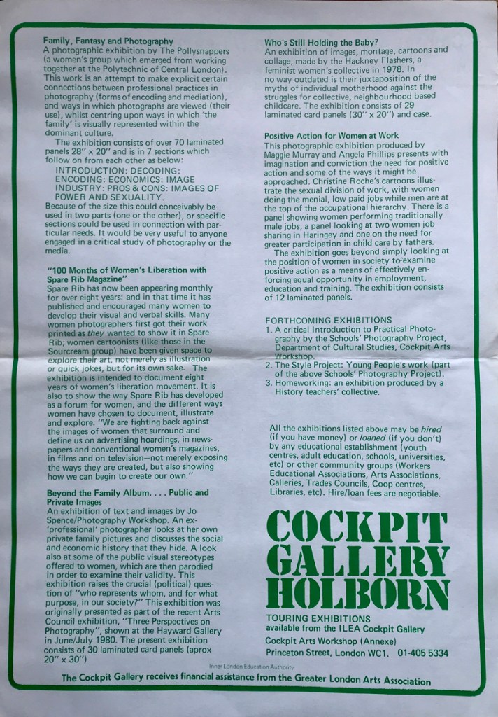 In producing hand-printed photographs and text laminated into portable exhibitions, they worked closely with young people, teachers, youth and community groups, women’s and black organisations, photographers and historians. They paid critical attention to how photographs constructed meanings and views of the world. (At a time when access to making photographs was both more expensive and difficult to do, they) tried to help people develop their control over the means of representation. They welcomed any initiatives that would lead to future collaborations. The Gallery had a range of photographic and technical facilities, including a laminating machine, making them available to people producing exhibitions.