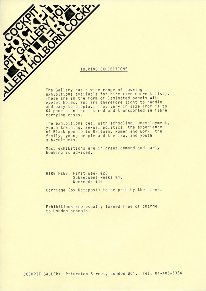 Some of the exhibitions were shown once in the Gallery. Some were exhibited and then made available for hire to educational establishments. (Schools, colleges, universities, adult education institutes, workers educational associations etc) or other community groups, (youth centres, art associations, galleries, trades councils, co-op centres, libraries, etc.) Hire fees were negotiable. They were all free of charge to schools within the Inner London Education Authority area.