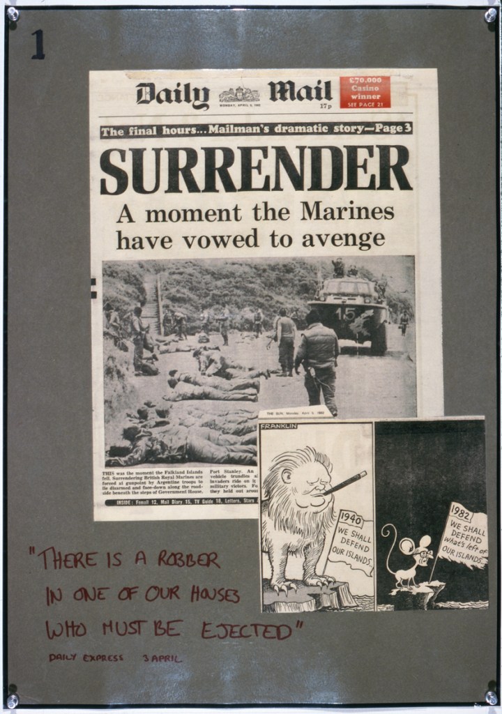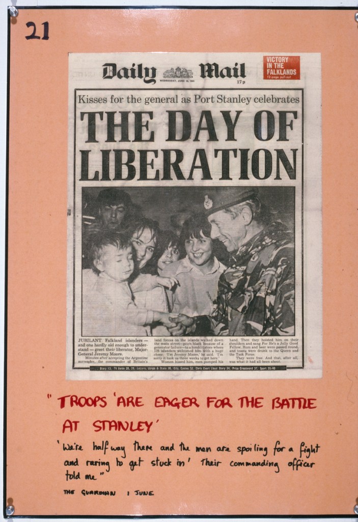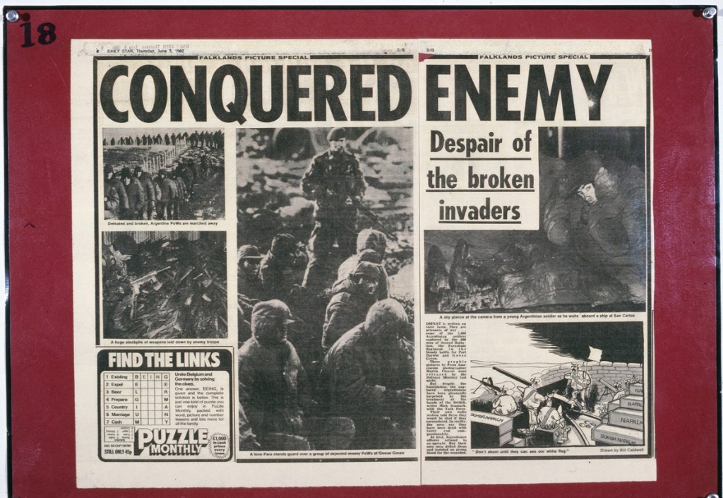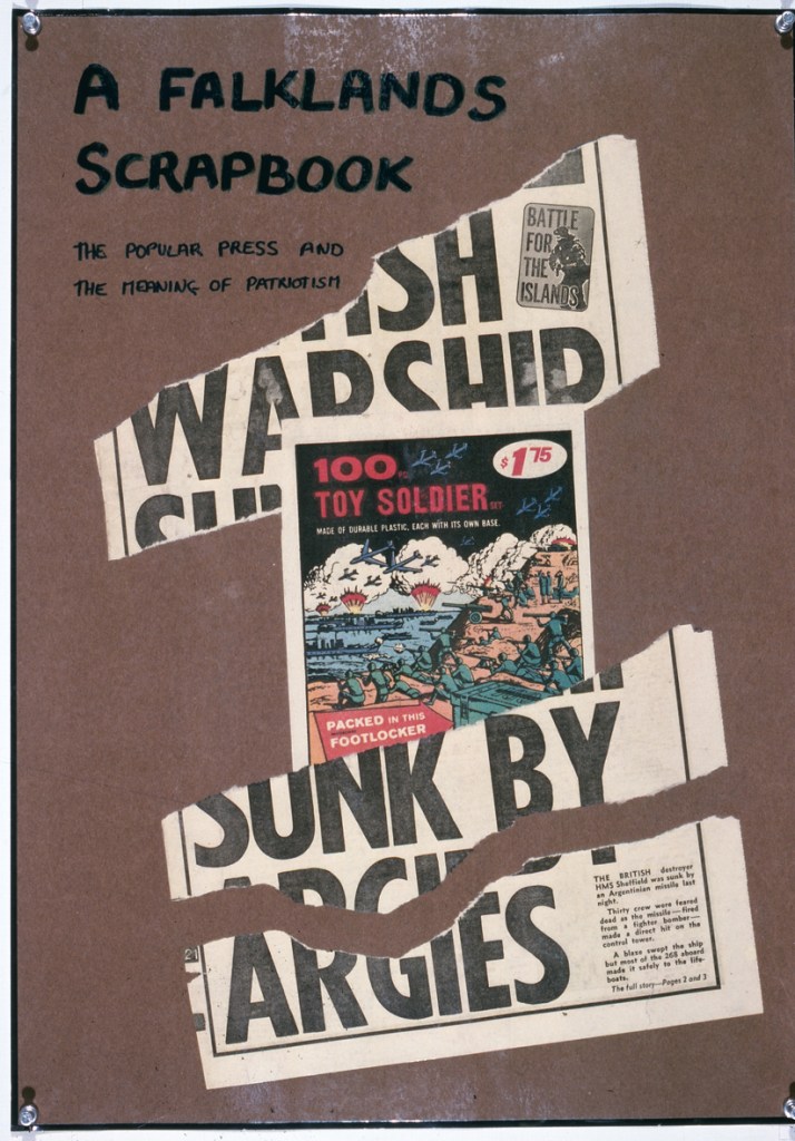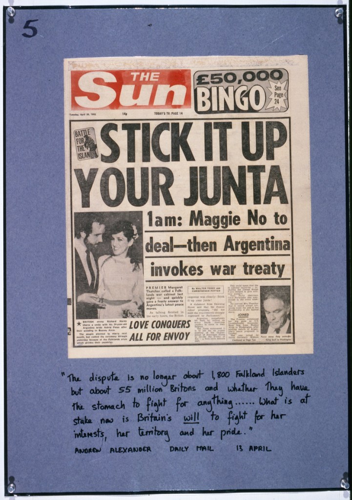 A presentation of the popular press coverage of the ‘Falklands Crisis’. Each panel contains original newspaper material, front pages, articles, and highlighted quotes. The final panel carries a textual commentary on the issues raised.