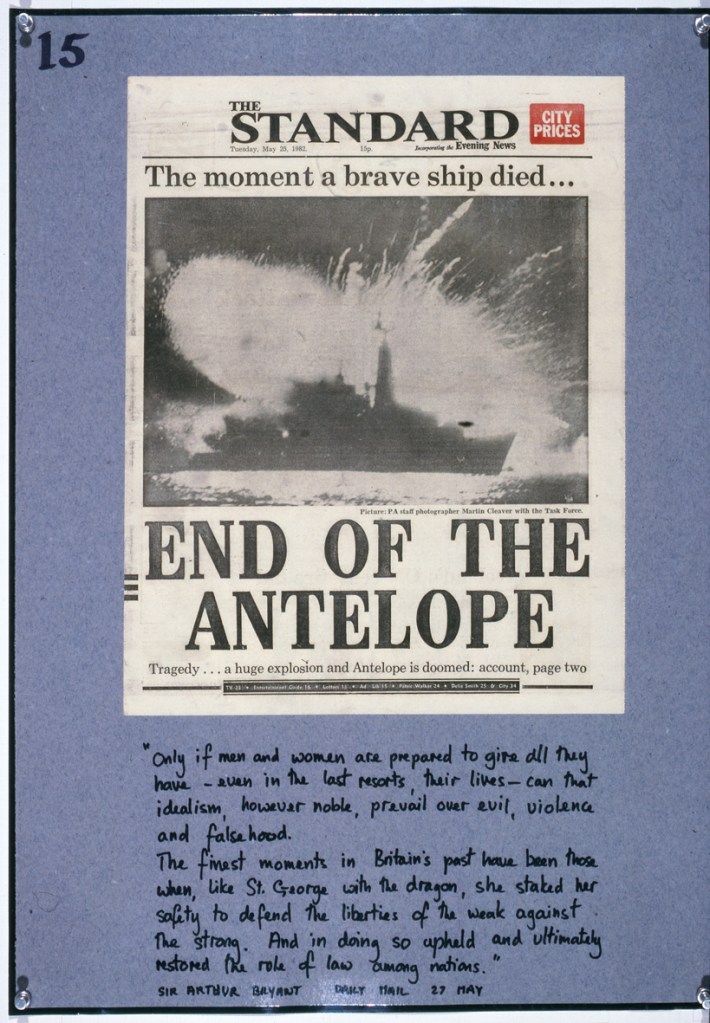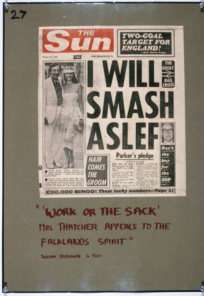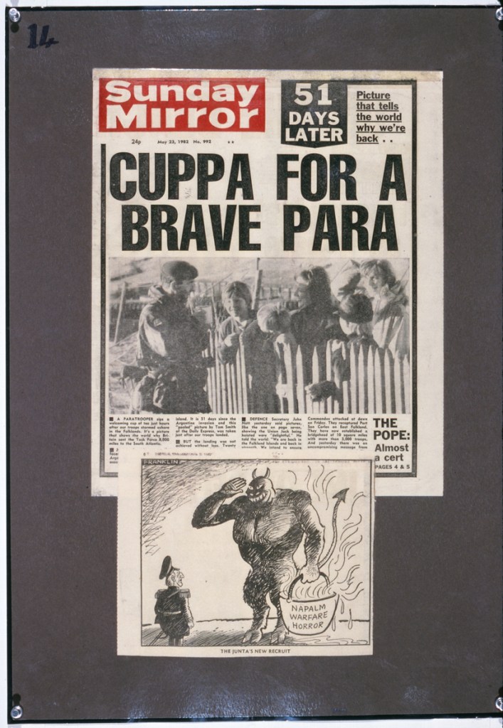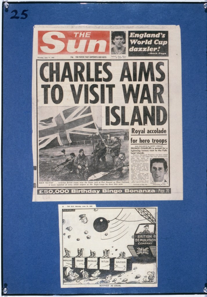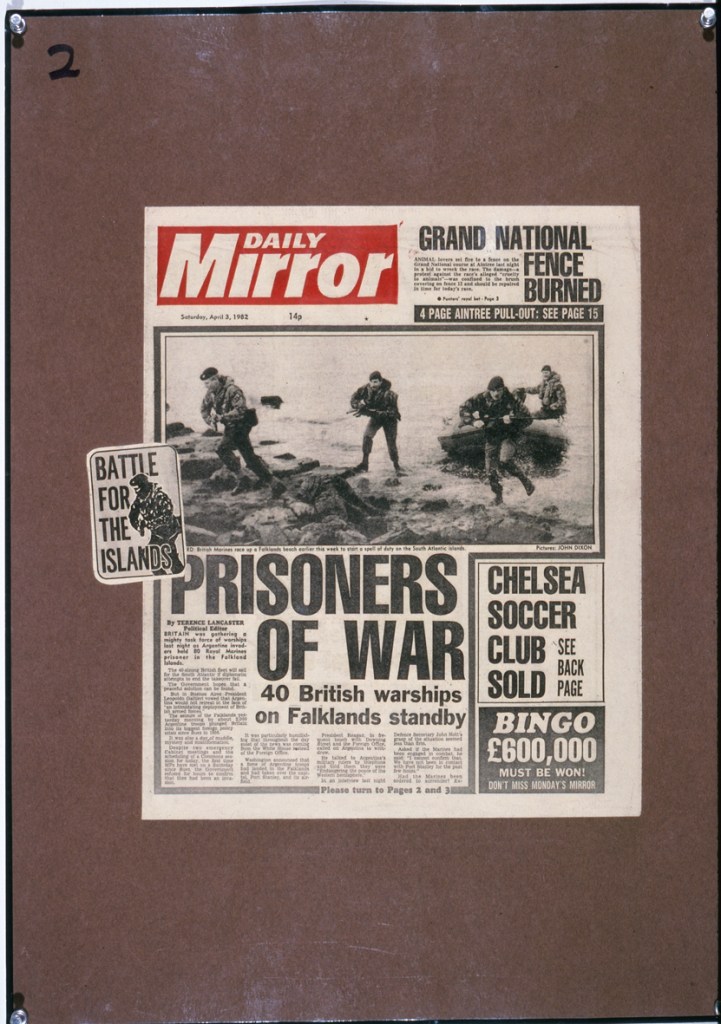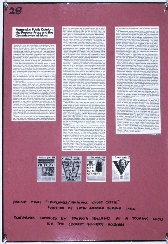 A presentation of the popular press coverage of the ‘Falklands Crisis’. Each panel contains original newspaper material, front pages, articles, and highlighted quotes. The final panel carries a textual commentary on the issues raised.