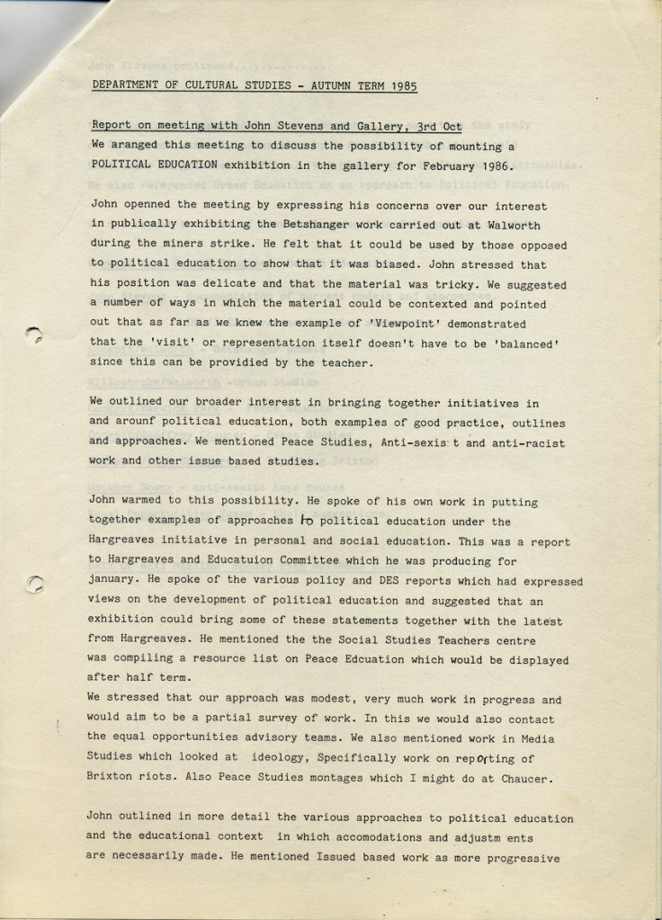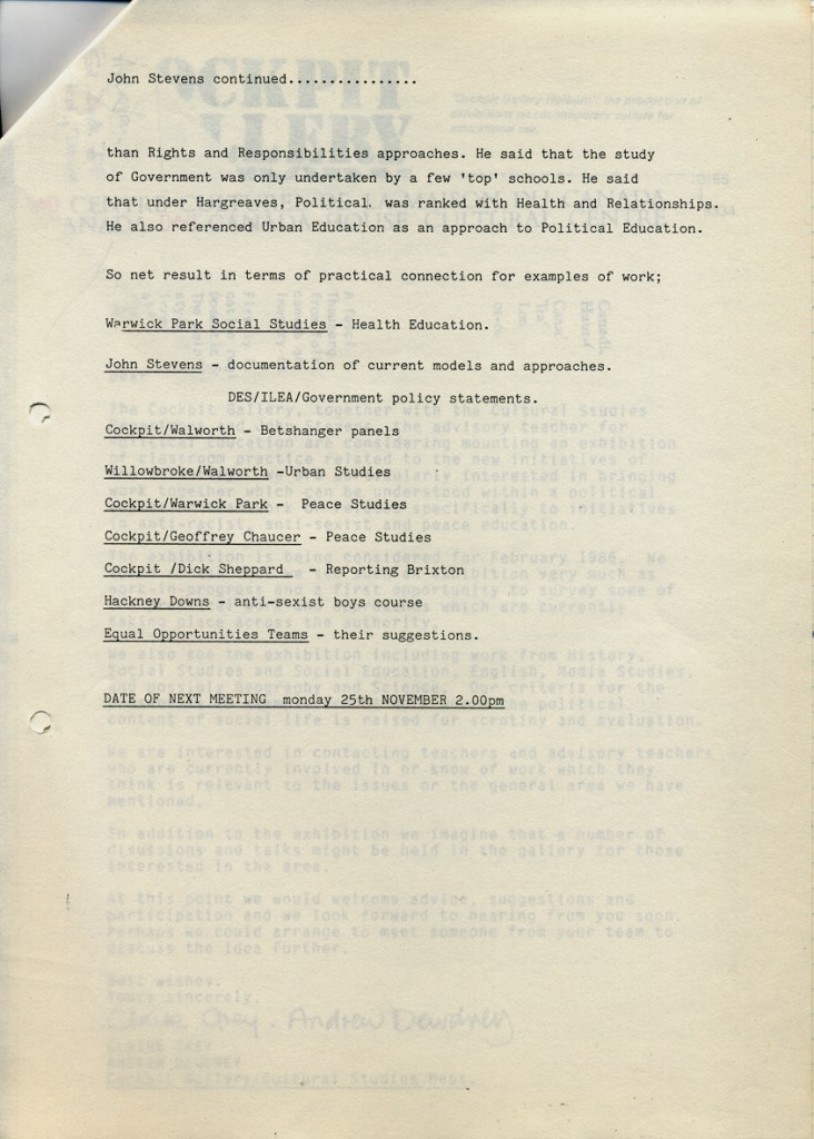 The ILEA inspectorate had concerns about the Cockpit’s intention to mount an exhibition on Political Education.
