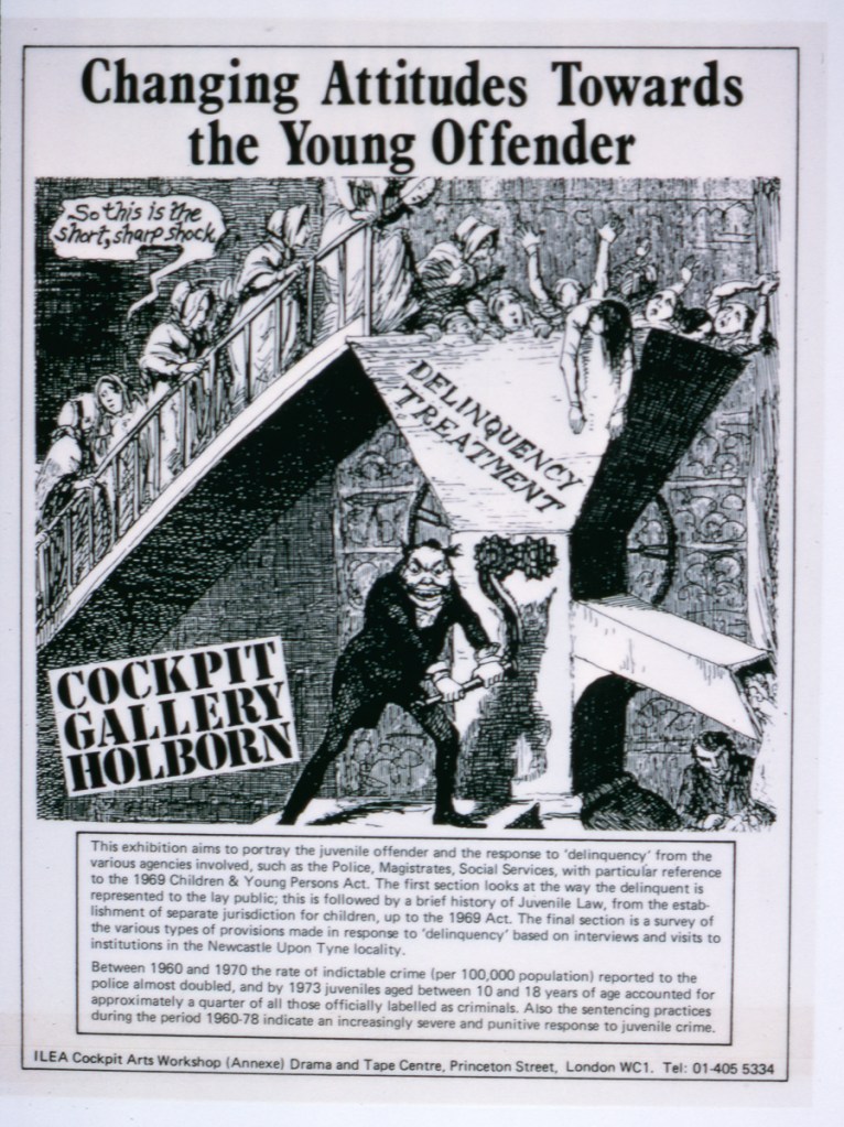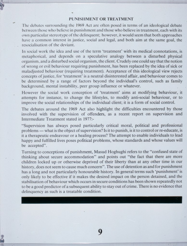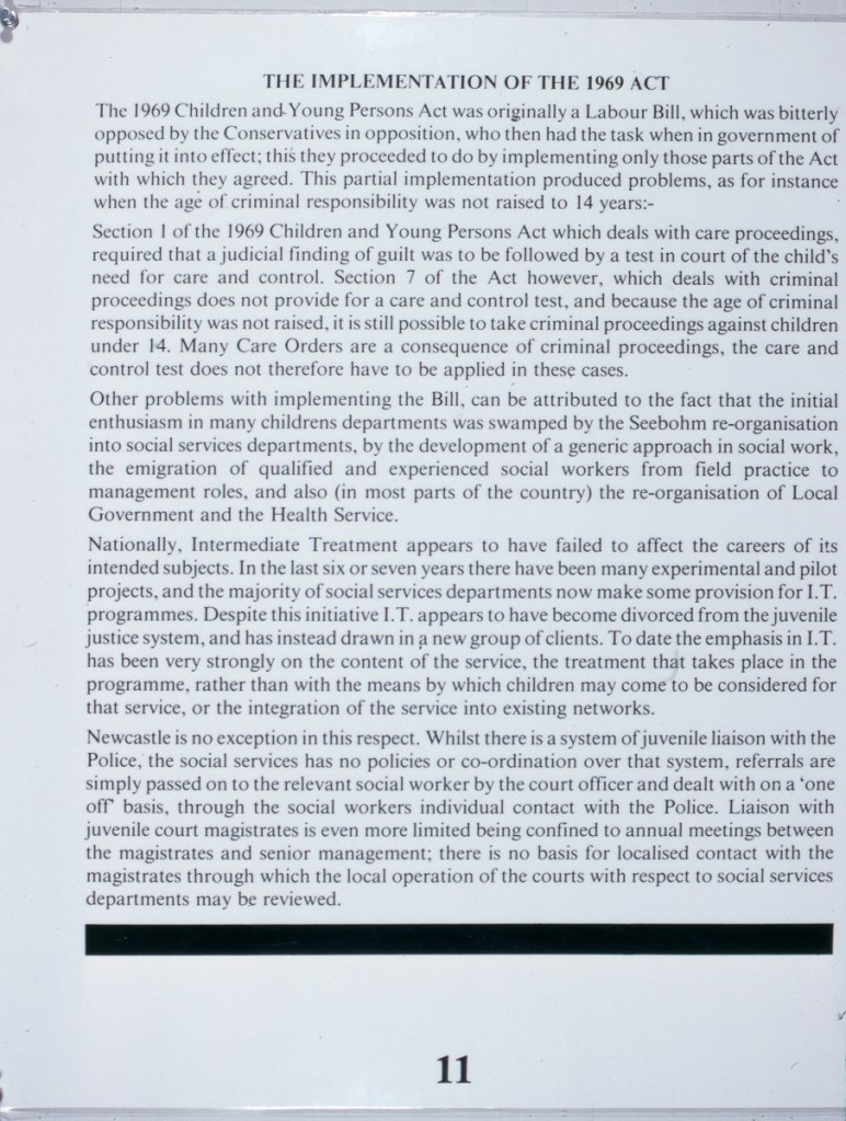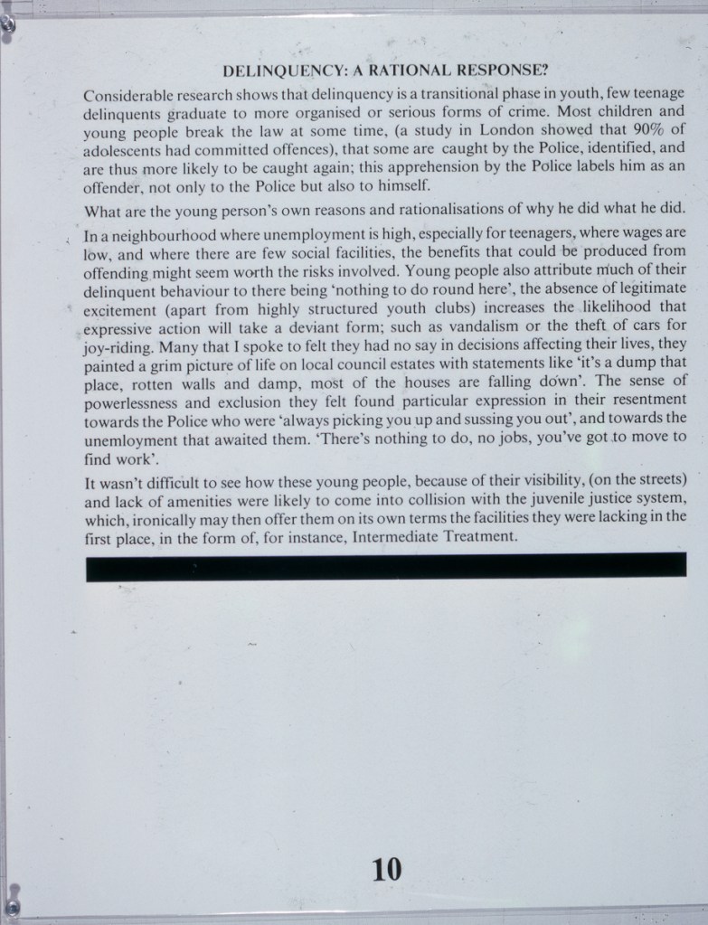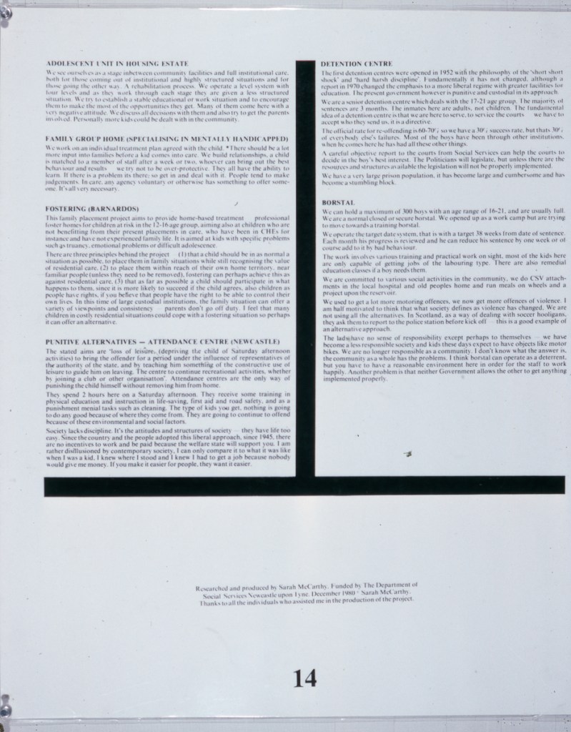This exhibition by Sarah McCarthy aims to portray the juvenile ‘offender’ and the response to ‘delinquency’ from the various agencies involved, such as the police, magistrates, and social services, with particular reference to the 1969 Children and Young Persons Act. The first section looks at the way the delinquent is represented to the lay public; this is followed by a brief history of juvenile law, from the establishment of separate jurisdiction for children, up to the 1969 Act. The final section is a survey of the various types of provisions made in response to ‘delinquency’ based on interviews and visits to institutions in the Newcastle Upon Tyne locality.