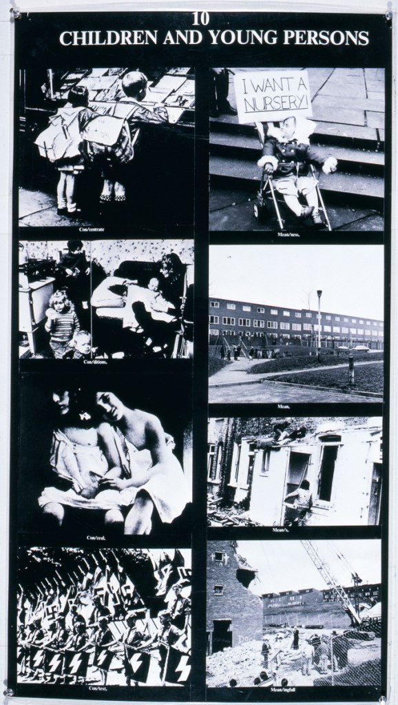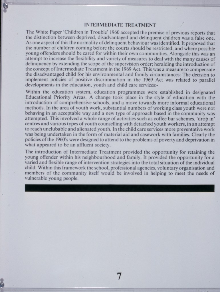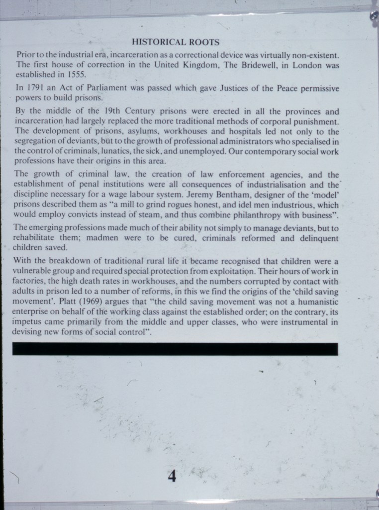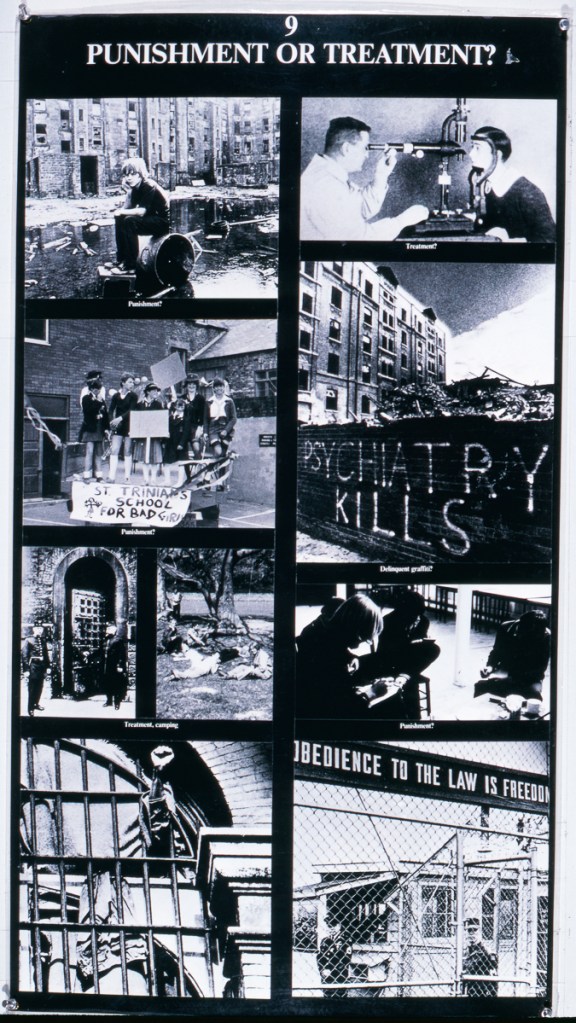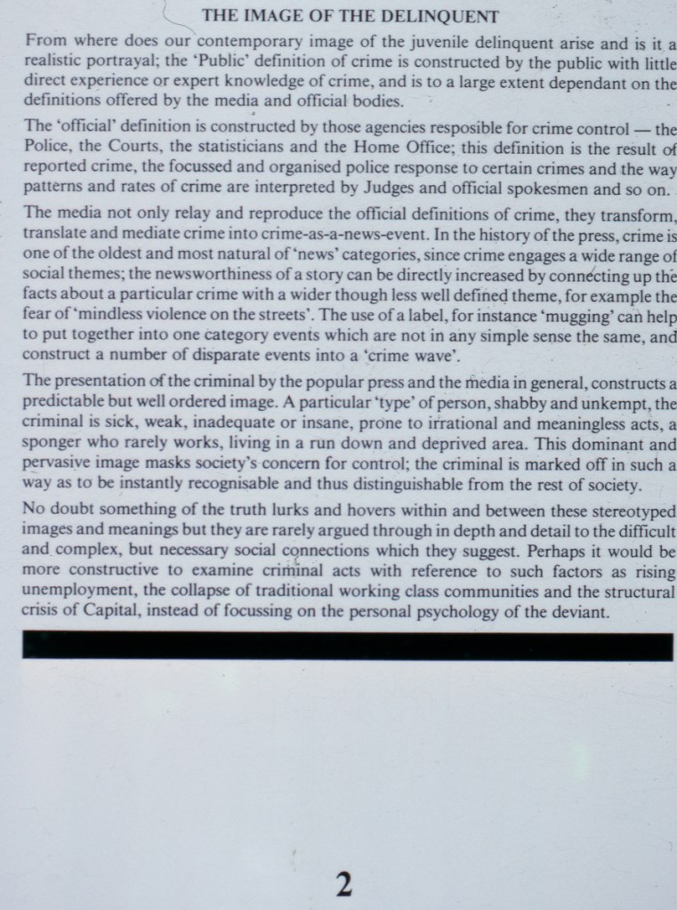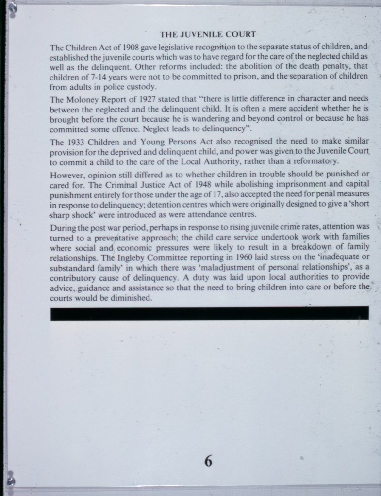 This exhibition by Sarah McCarthy aims to portray the juvenile ‘offender’ and the response to ‘delinquency’ from the various agencies involved, such as the police, magistrates, and social services, with particular reference to the 1969 Children and Young Persons Act. The first section looks at the way the delinquent is represented to the lay public; this is followed by a brief history of juvenile law, from the establishment of separate jurisdiction for children, up to the 1969 Act. The final section is a survey of the various types of provisions made in response to ‘delinquency’ based on interviews and visits to institutions in the Newcastle Upon Tyne locality.