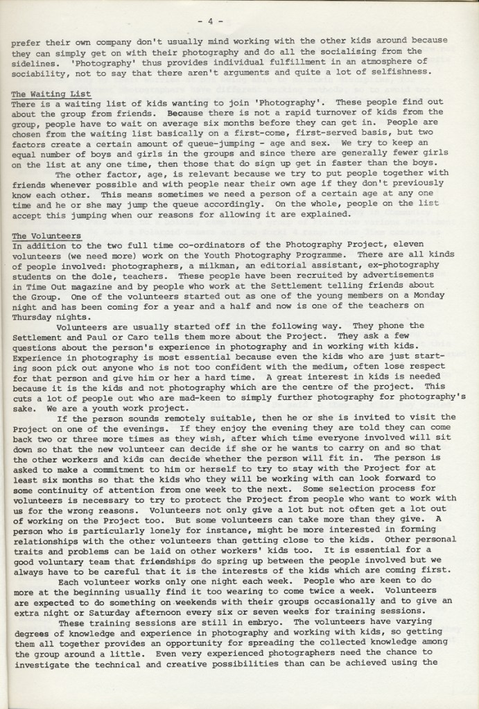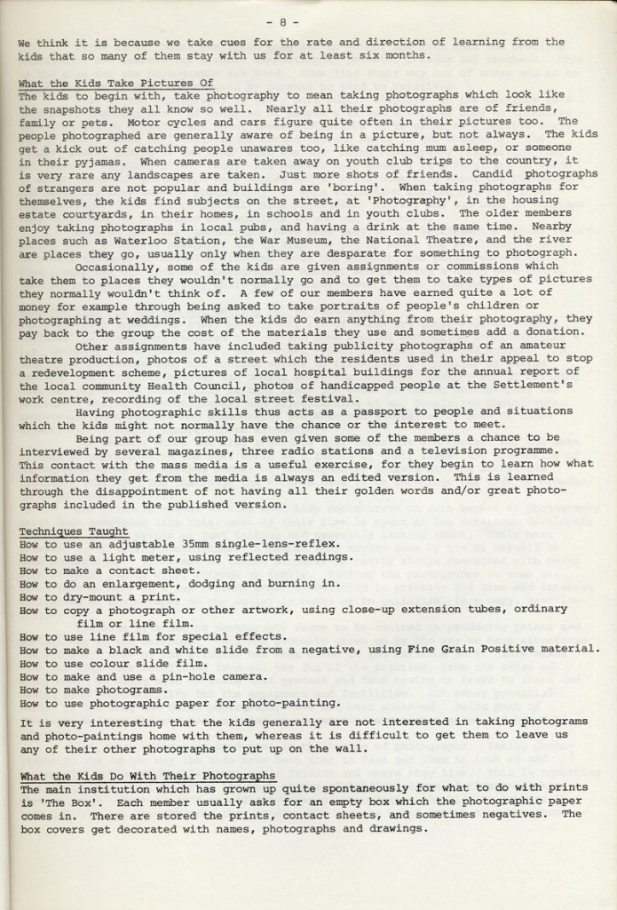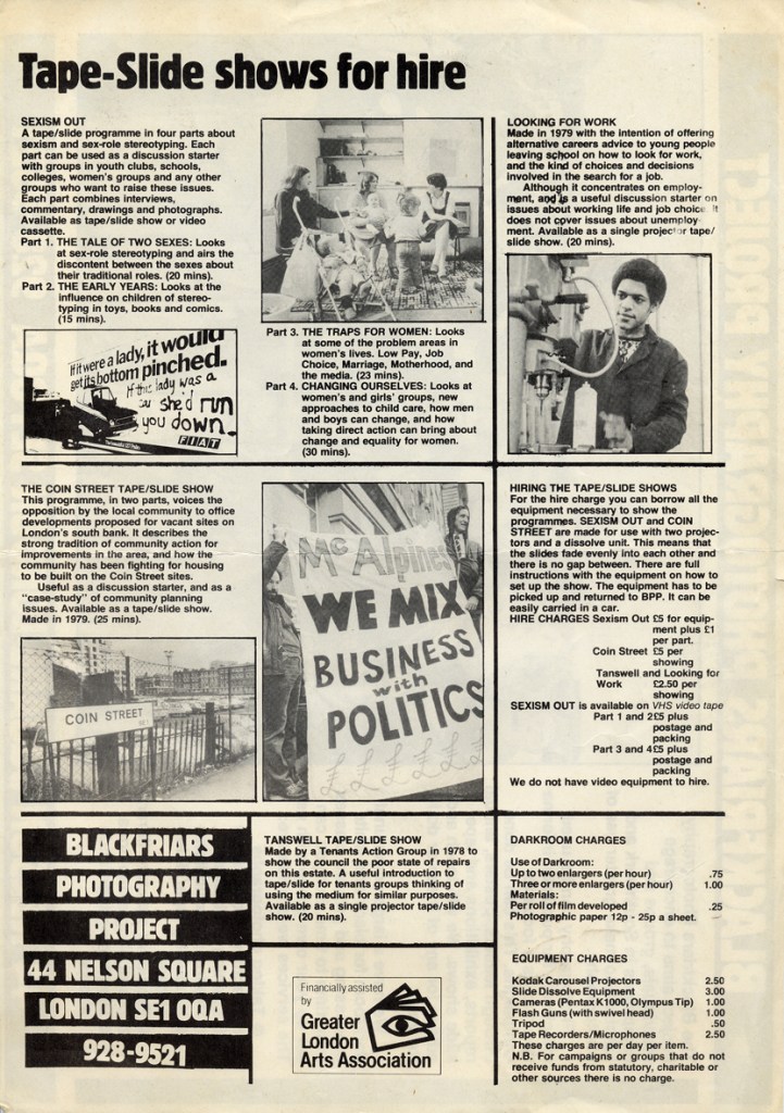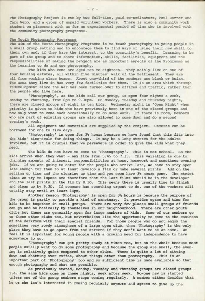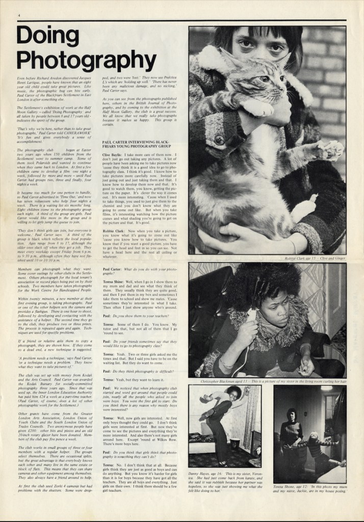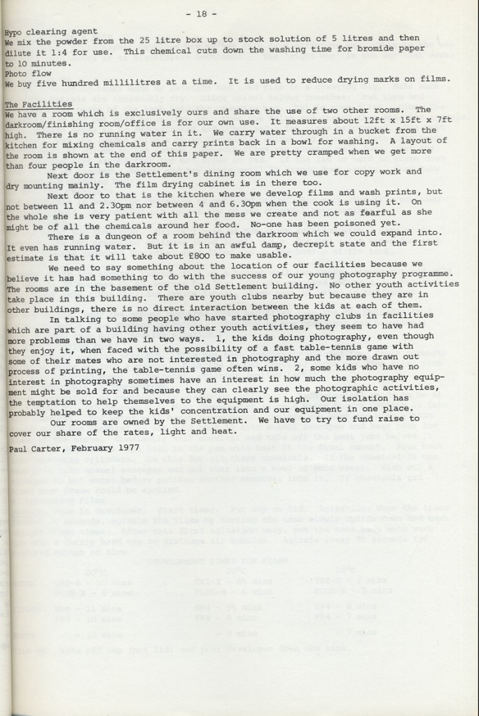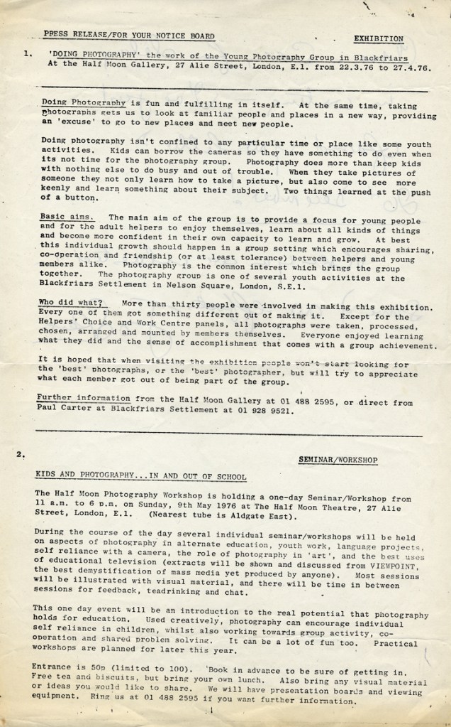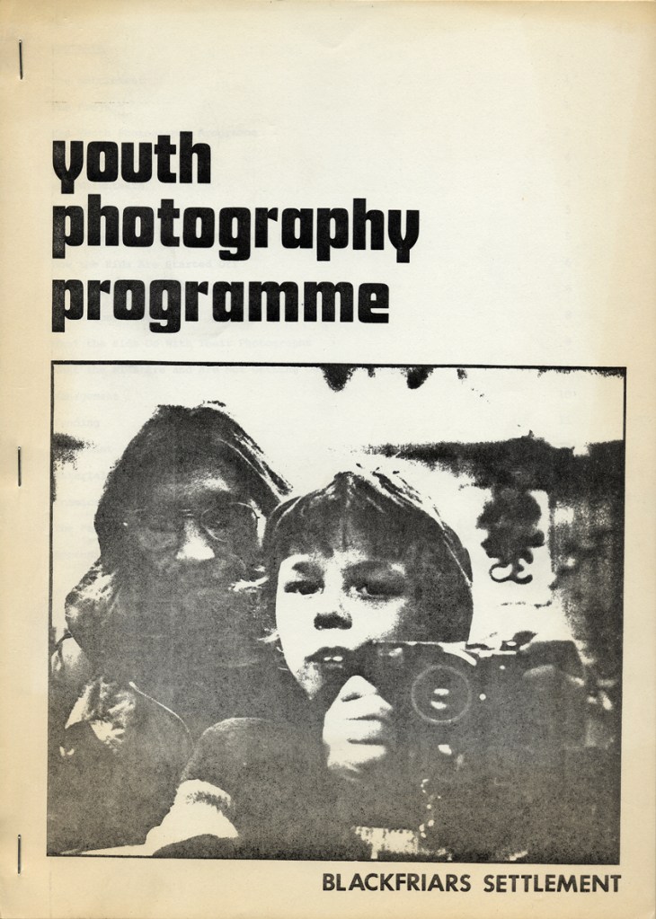 Paul Carter produced a guide to the photography at Blackfriars Settlement in 1977. It was distributed by Photography Workshop as part of a “Jackdaw” folder after their Workshop: Kids and Photography In and out of school