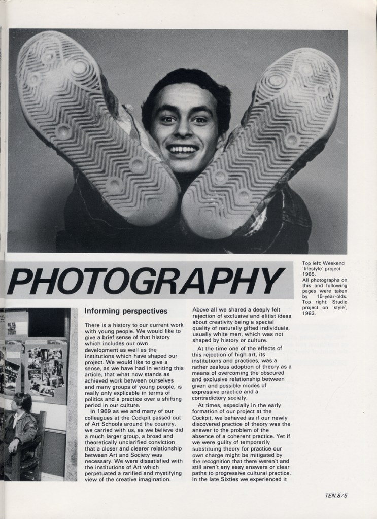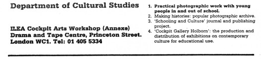 Between 1975 and 79 the Cockpit Art Department redefined itself as the Department of Cultural Studies and moved to the ILEA Drama and Tape Centre in Holborn. At Holborn they set up a photographic studio, teaching darkroom and relaunched the Gateforth Street Theatre Foyer Gallery as the Cockpit Gallery Holborn, with a regular exhibition programme for and about young people. The Department was significantly influenced by the research work and working papers of The Centre for Contemporary Cultural Studies at Birmingham University. They were developing curriculum ideas from the work of Raymond Williams, Richard Hoggart and Stuart Hall.