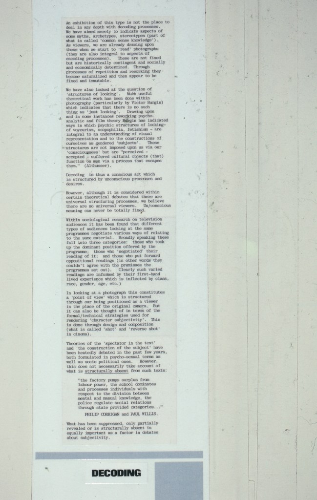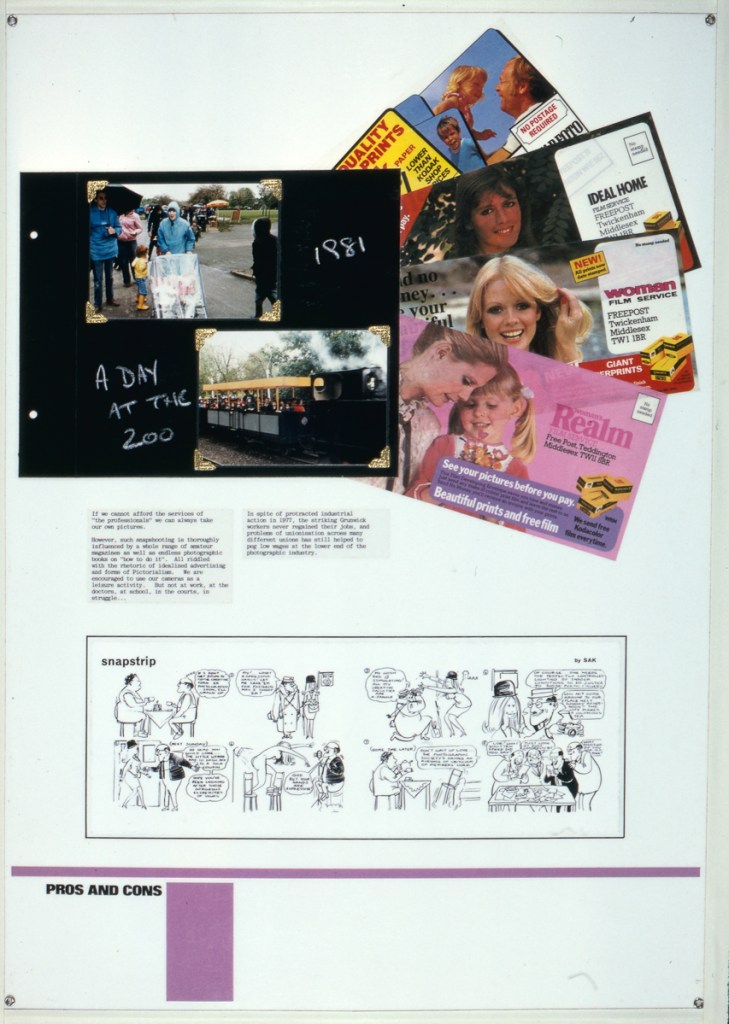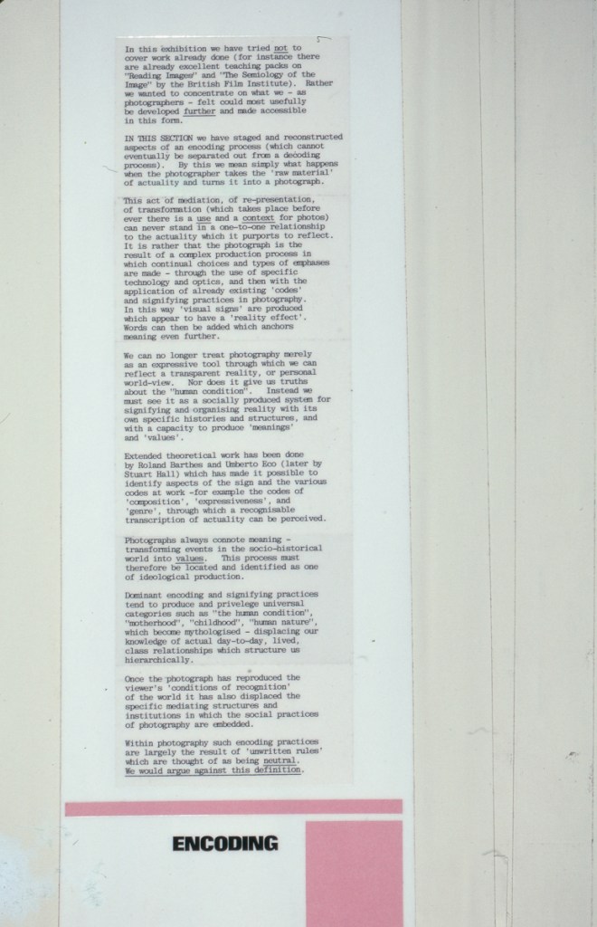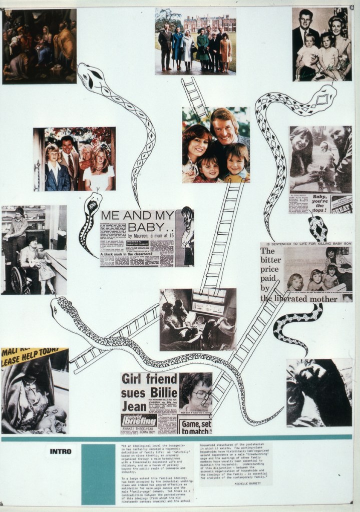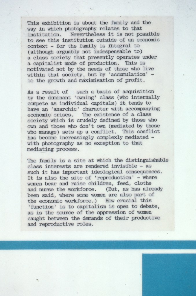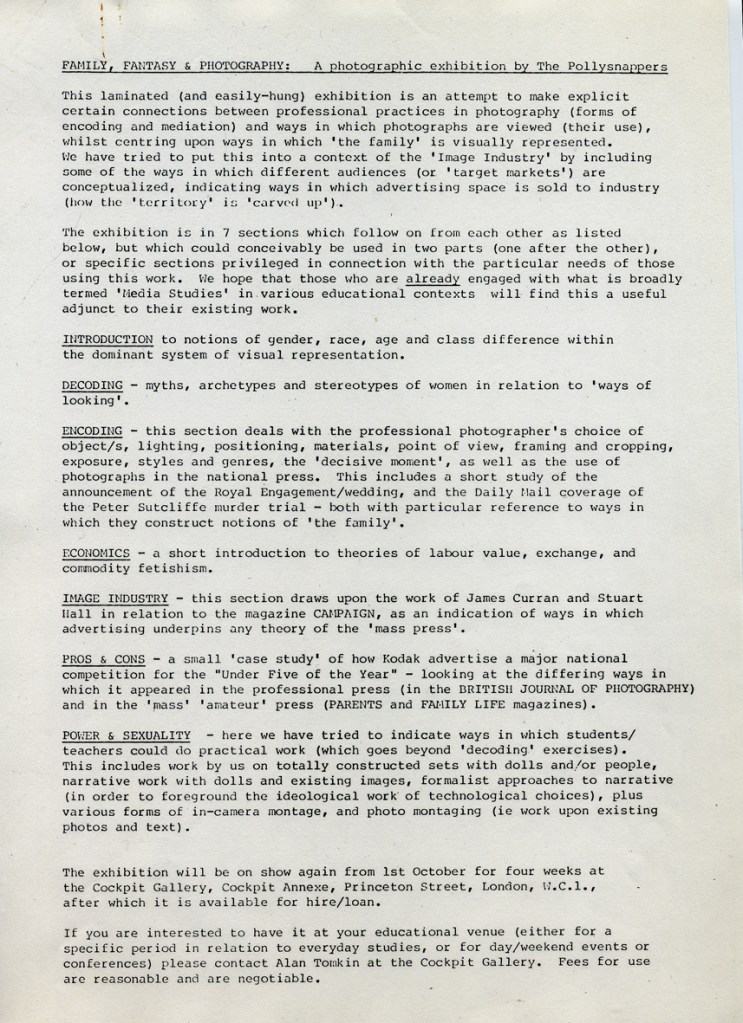 A photographic exhibition by the Pollysnappers (a women’s group at the Polytechnic of Central London). This work makes connections between professional practices in photography (forms of encoding and mediation), and ways in which photographs are viewed (their use), whilst centring upon ways in which ‘the family’ is visually represented within the dominant culture.