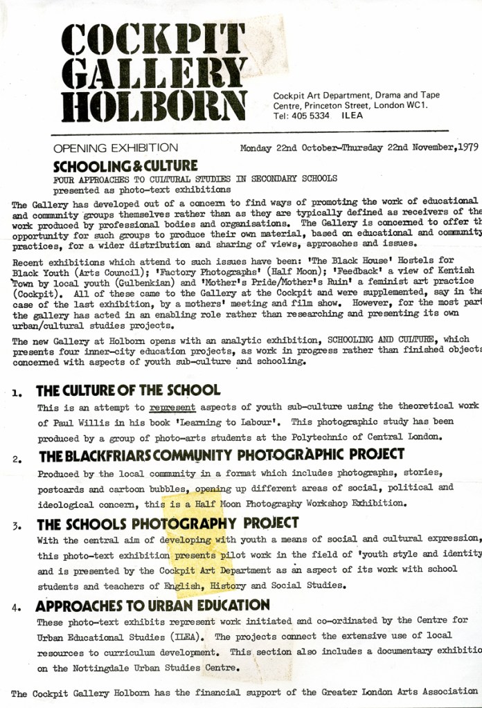 Schooling and Culture– Four Approaches to Cultural Studies in Secondary Schools- (22 Oct-22 Nov 1979) The opening exhibition at the Holborn Gallery consisted of 4 pieces of work. The Culture of the School would become The Good Ones Have their Top Buttons Done Up which was later a touring show, Using Photography by Paul Carter at Blackfriars Community Photography Project was hired from the Half Moon Photography Workshop, the Cockpit’s own Style exhibition was one of the first in their Schools Photography Project and Approaches to Urban Education from CUES which would also became a Cockpit touring show.