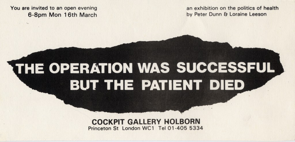 The Operation was Successful but the Patient Died – posters and photomontages by Lorraine Leeson & Peter Dunn. Work began in 1978 as part of the Bethnal Green Hospital Campaign. East London Health Project (4 Mar – 8 April)