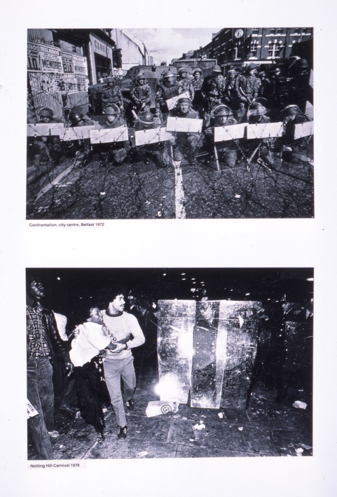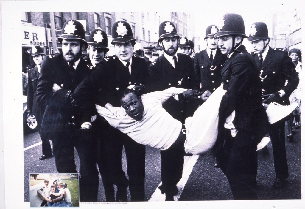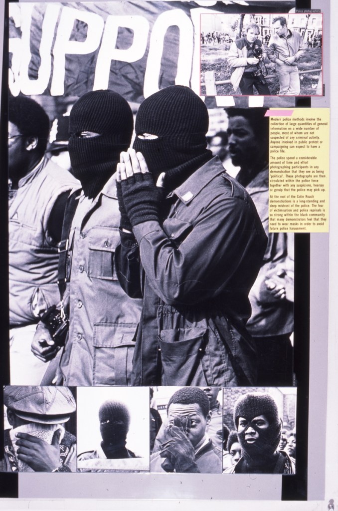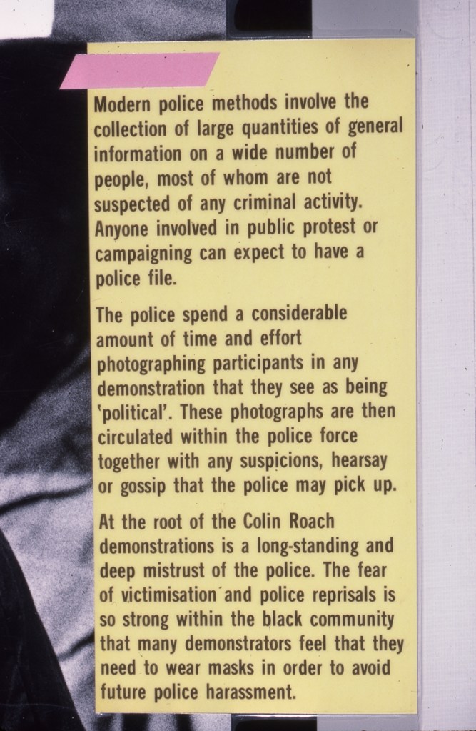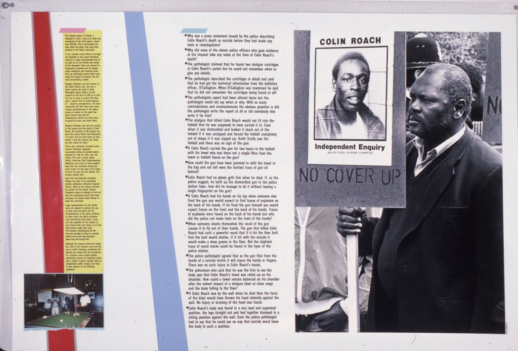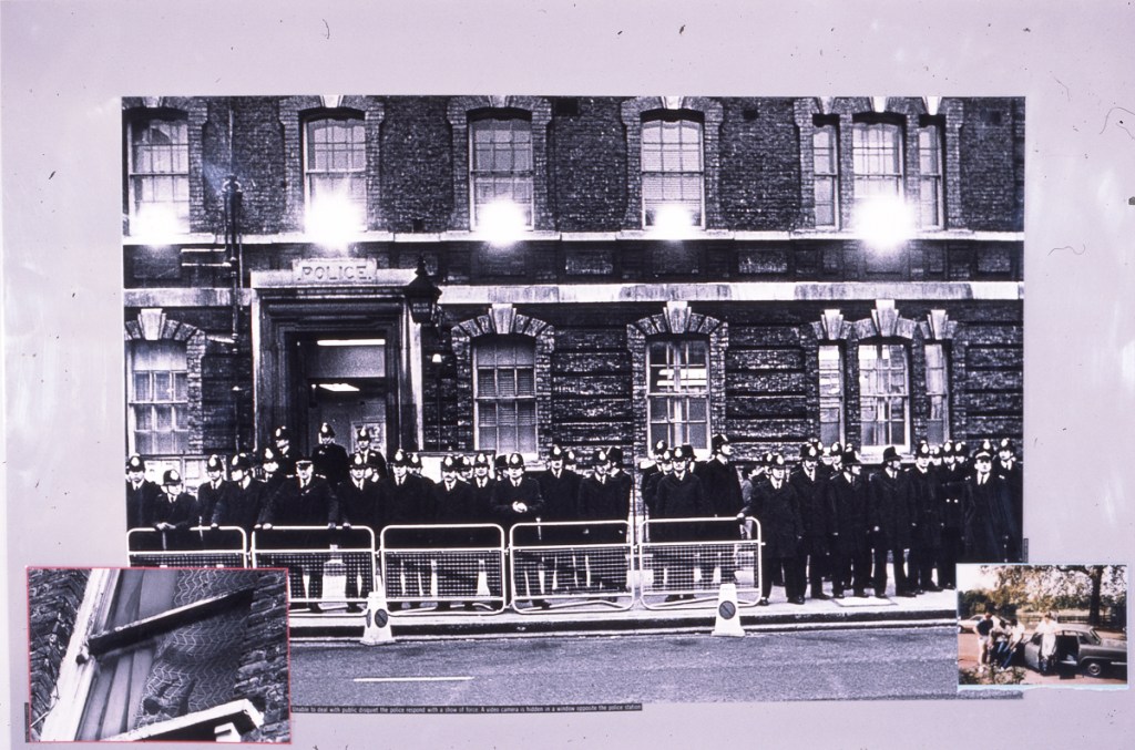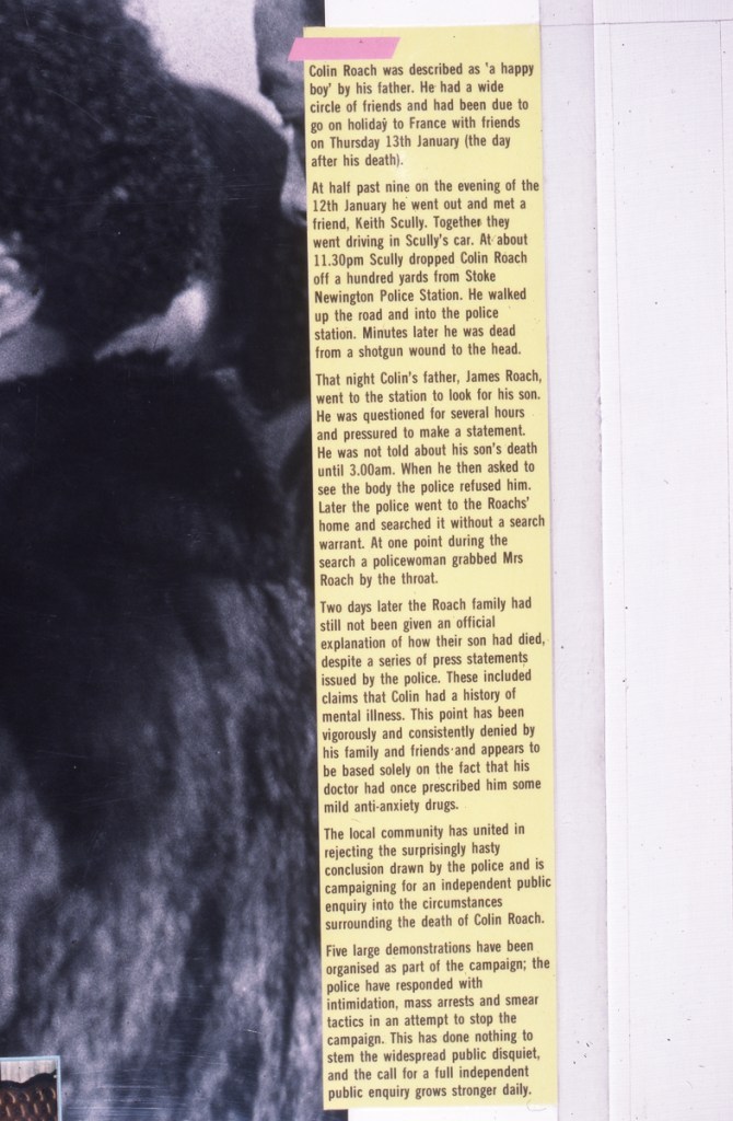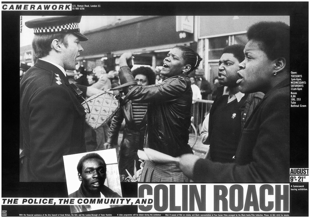 SYNOPSIS: Photographs by freelance photographers taken during protests over the unexplained death of Colin Roach in Stoke Newington police station in January 1983. Part of the campaign to make the police accountable for their actions, it gave a wider, deeper view of events than that found in the media, which only looked at one incident at a time and did not provide a context. Exhibited first at Camerawork and then toured galleries, youth clubs and community groups.