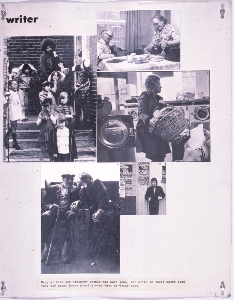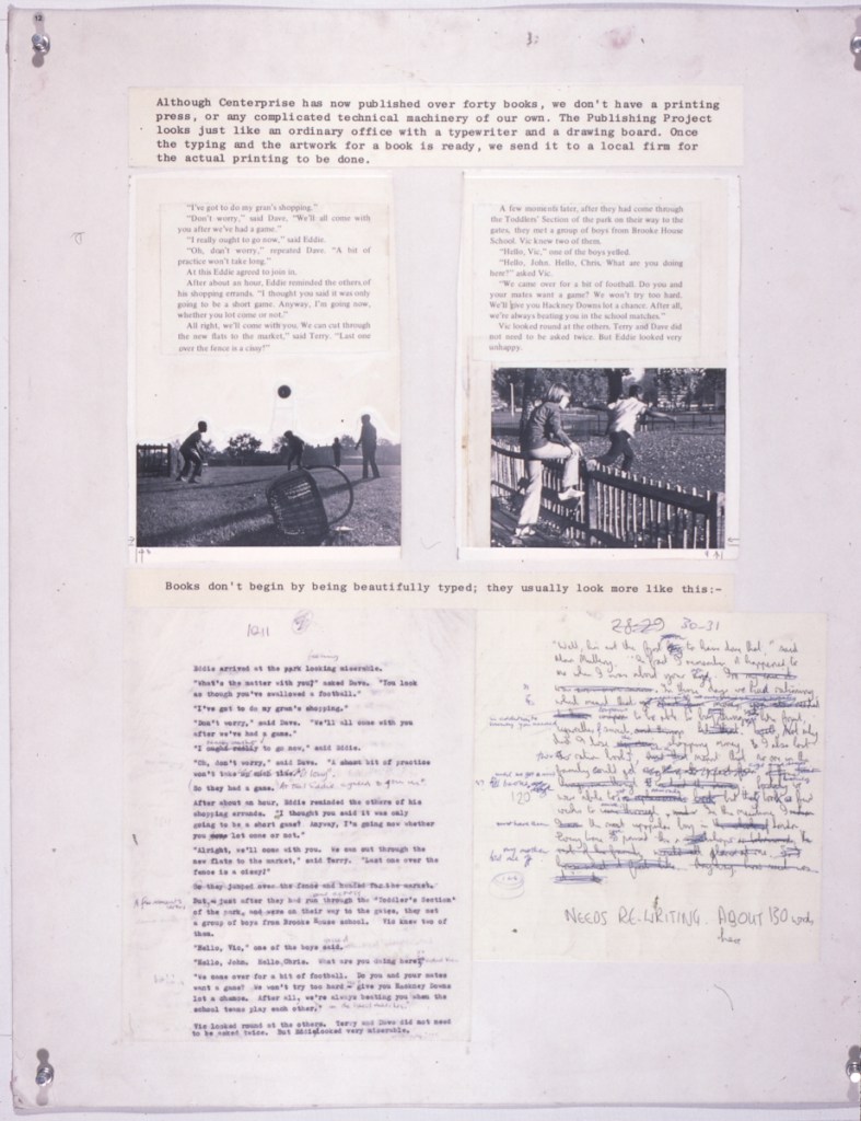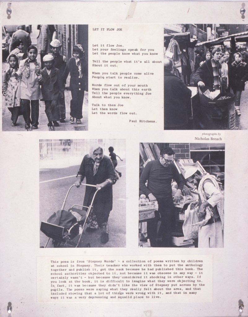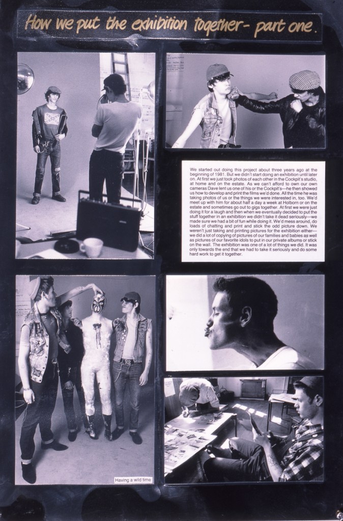 SYNOPSIS: The photography project at Blackfriars included a programme to teach photography to young people. The kids were aged between 10 and 18 and lived on local housing estates. The project ran four nights a week with groups of 8 to 10 kids each night. It aimed to give young people a new skill and enable them to find ways of using it for their own and the community’s benefit. Twenty-six members of the group were given a 21″ x 24″ card on which to mount whatever photographs they wanted; they were also asked to write something about the photographs and why they came to do photography. The exhibition was first displayed locally and then in a variety of locations both in and out of London.