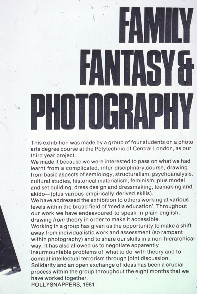 SYNOPSIS: “The exhibition engages with the issues of personal and sexual politics. I have used phototherapy techniques, which Jo Spence and I have developed together to examine our self-identity. I have replaced myself within the Family Album, taking up the positions of my mother, my father and myself as a young child. I have examined the unnatural and extraordinary process of growing up as a young heterosexual woman (circa 1962). I have transformed archetypes of the victim and the heroine and reconstructed stereotypes as a means of challenging the fixity of social and sexual roles. There is no ‘real me’, only the fragments and contradictions that have formed me. I cannot be held or represented by any one image, and phototherapy is the process that Jo and I have developed to explore and make visible the many, many parts of which we are formed”