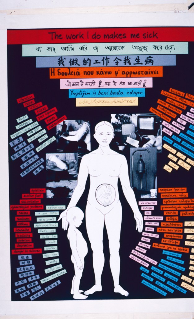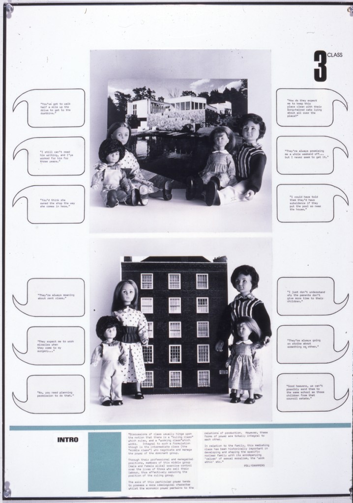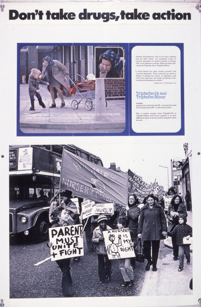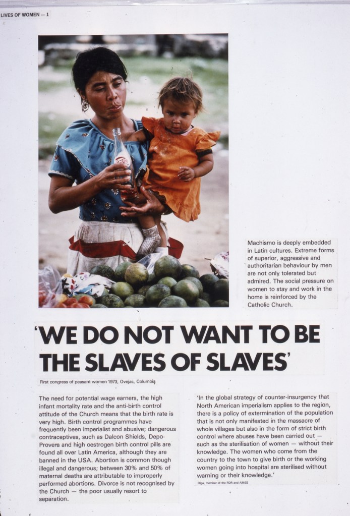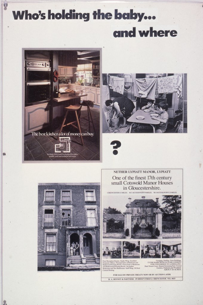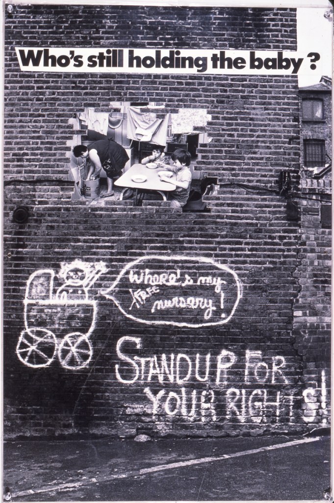 Who’s Still Holding the Baby? took two years to complete. “The limitations of documentary photography became apparent with the completion of the ‘Women and Work’ exhibition. The photographs assumed a ‘window on the world’ through the camera and failed to question the notion of reality rooted in appearances. The photographs were positive and promoted self-recognition but could not expose the complex social and economic relationships within which women’s subordination is maintained. We began to juxtapose our naturalistic photographs with media images to point to the contradictions between women’s experience and how it is represented in the media. We wanted to raise the question of class, so much obscured in the representation of women’s experience as universal.”