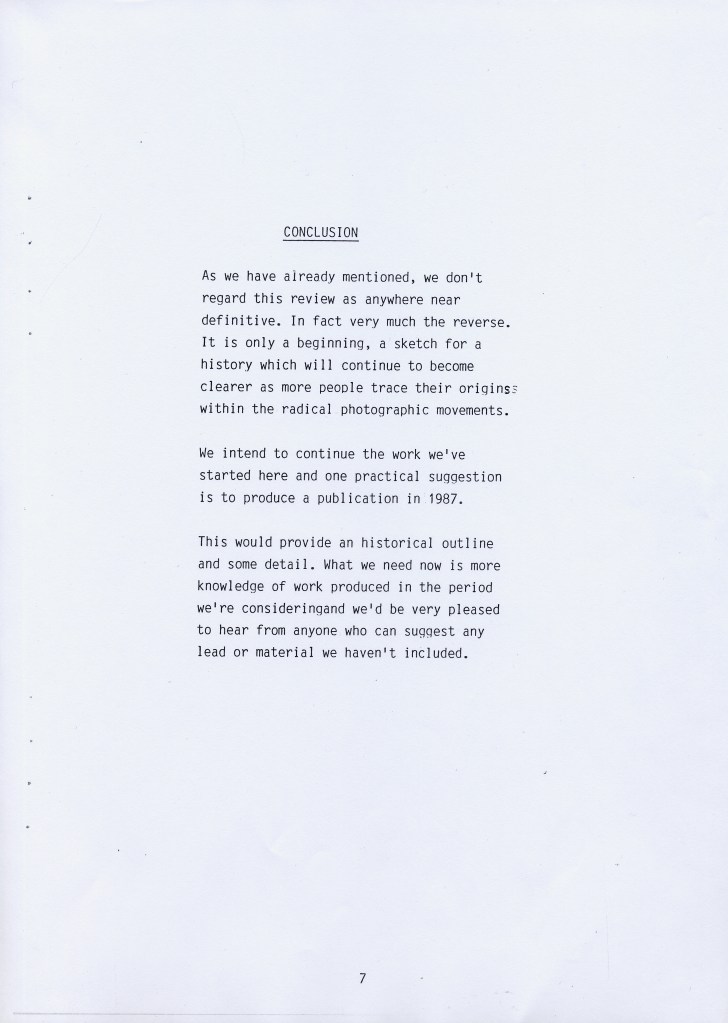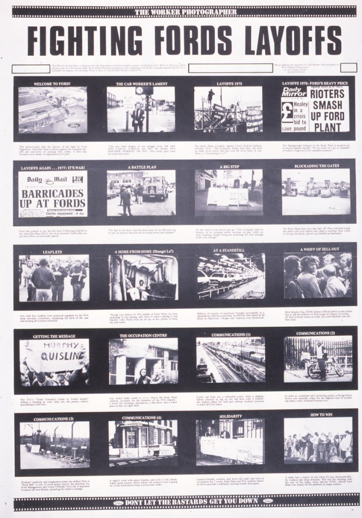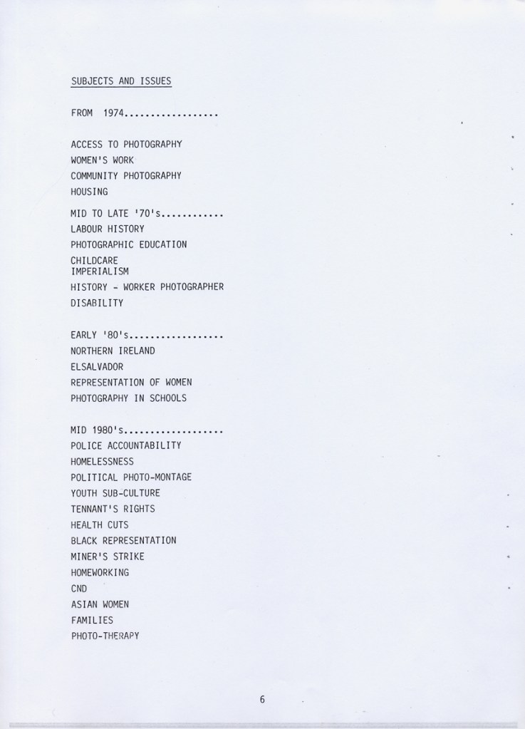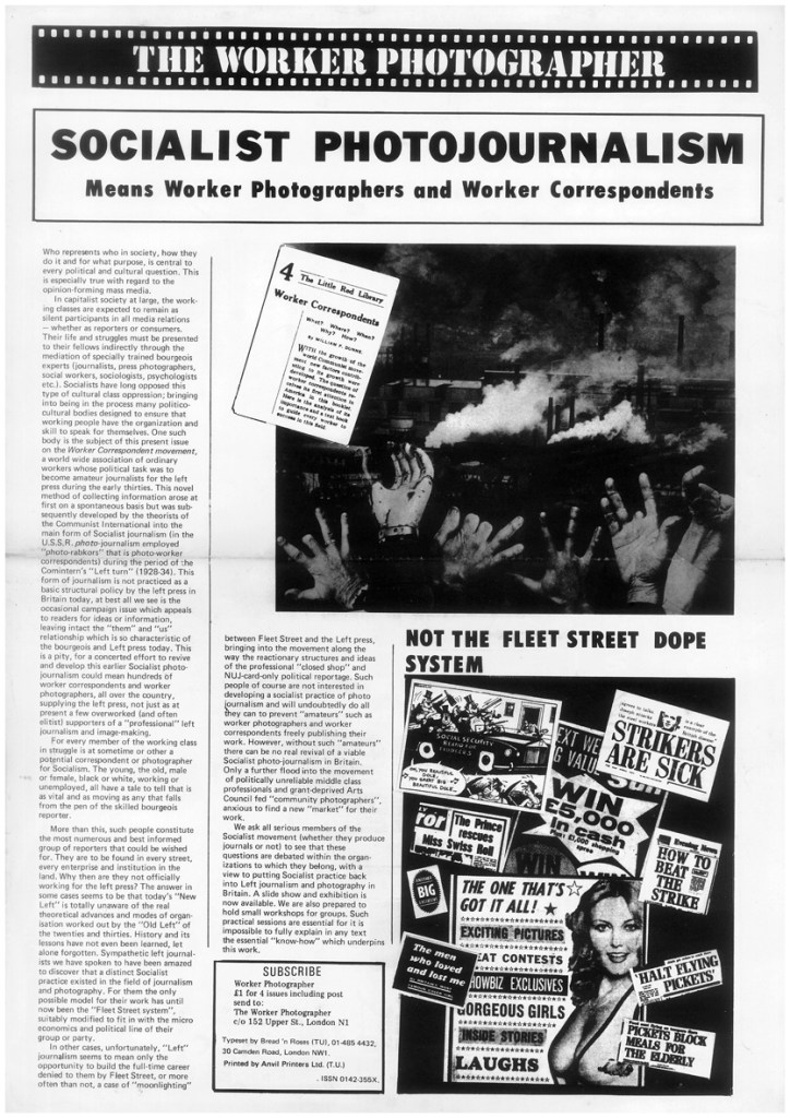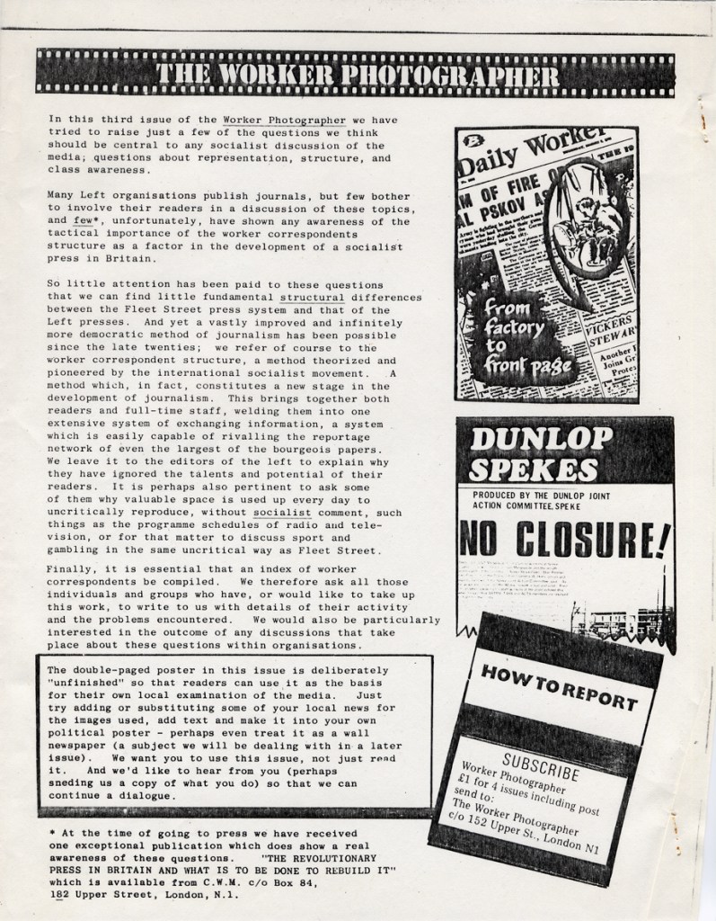 The idea was to take photography to the labour movement. The group had photographic skills and would invite other grassroots groups in the labour movement to work around an issue and leave these groups with photographic skills and understanding of how photography worked. “It was an attempt to open up once again discussions started within the socialist movement of the 1920’s and 1930’s about the class nature of photography and its specific forms and importance as a weapon of cultural struggle. It had some success in showing the ‘hidden story’ of labour photography and journalism exemplified by the concepts of the amateur ‘worker photographer’ and ‘worker correspondent and was responsible for the re-introduction of these concepts back into the language of the radical movement in Britain. On a practical level, however, it was a premature experiment from which no further journals or stable groupings developed, to our knowledge.”