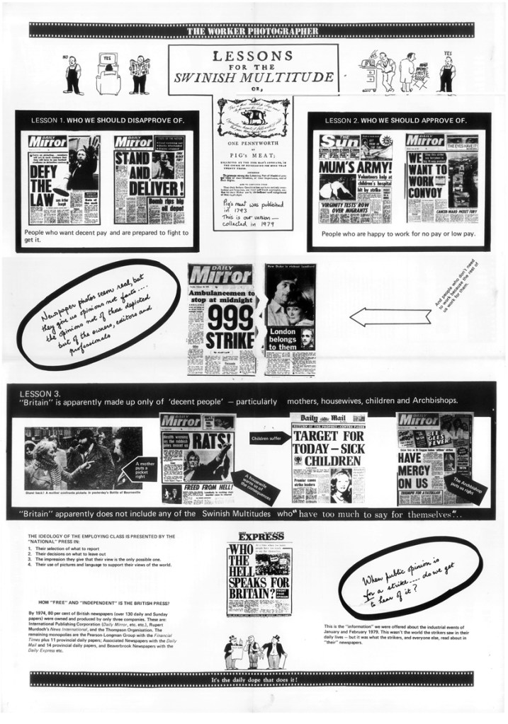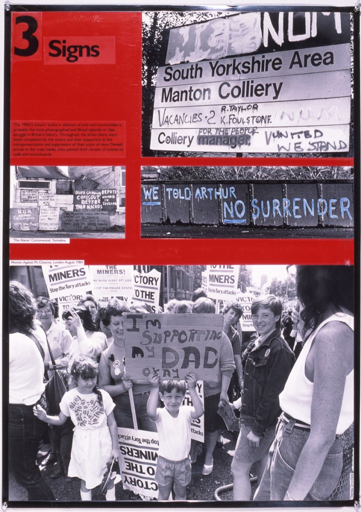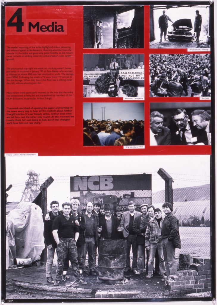 The exhibition was conceived as a campaign aid but was incomplete at the end of the strike, so the text shifted towards analysis. It was aimed at the general public and people with a general concern about the strike and its media coverage.