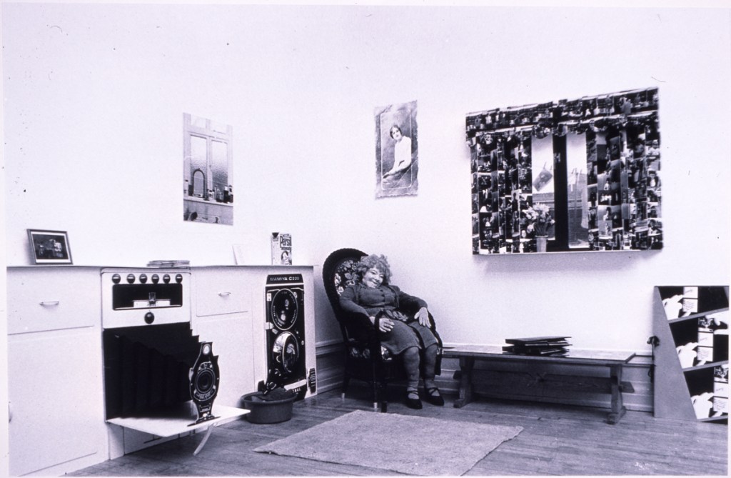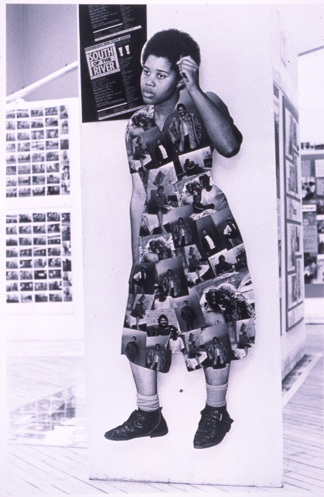 SYNOPSIS: We recently produced a series of images and constructions entitled ‘The Camera as a Domestic Item’, as Monocrone’s contribution to an exhibition of community photography called ‘South of the River’, in South London. We created a domestic corner where photographic equipment and materials are substituted for domestic appliances, and photography and film are turned into the actual fabric and furniture of home life: curtains and coffee tables are made of photographs: rolls of film knitted into a woollen picture: films and prints hang on the washing line: chemicals sit on the bathroom shelf: the oven and washing machine are actual cameras, with a lens becoming the front-loading door. The ideas behind these creations emerged more in the making of them than in the planning – it felt like an exhibition from the gut. We wanted, as we articulated afterwards, to acknowledge the energy that many women – who are still expected to carry responsibility for domestic life, whatever else they do – put into the home. We wanted the realities of this life to be seen more in the photographs that we take. We wanted to celebrate the value of the photographs that are already found in our homes, and we wanted to challenge the way that our creative and technical work in the home is undervalued, by drawing visual parallels with photography where those same skills, applied by men, are given status. Elsewhere in the exhibition, another stereotype is challenged: a life-size black woman photographed in black and white wears a dress of colour photographs of other black women. Turning the negative notion of the ‘black woman who is aggressive and wears a loud dress’ on its head, she becomes an expression and celebration in herself of the individuality of black women.