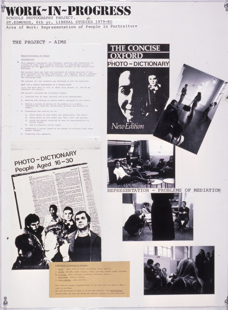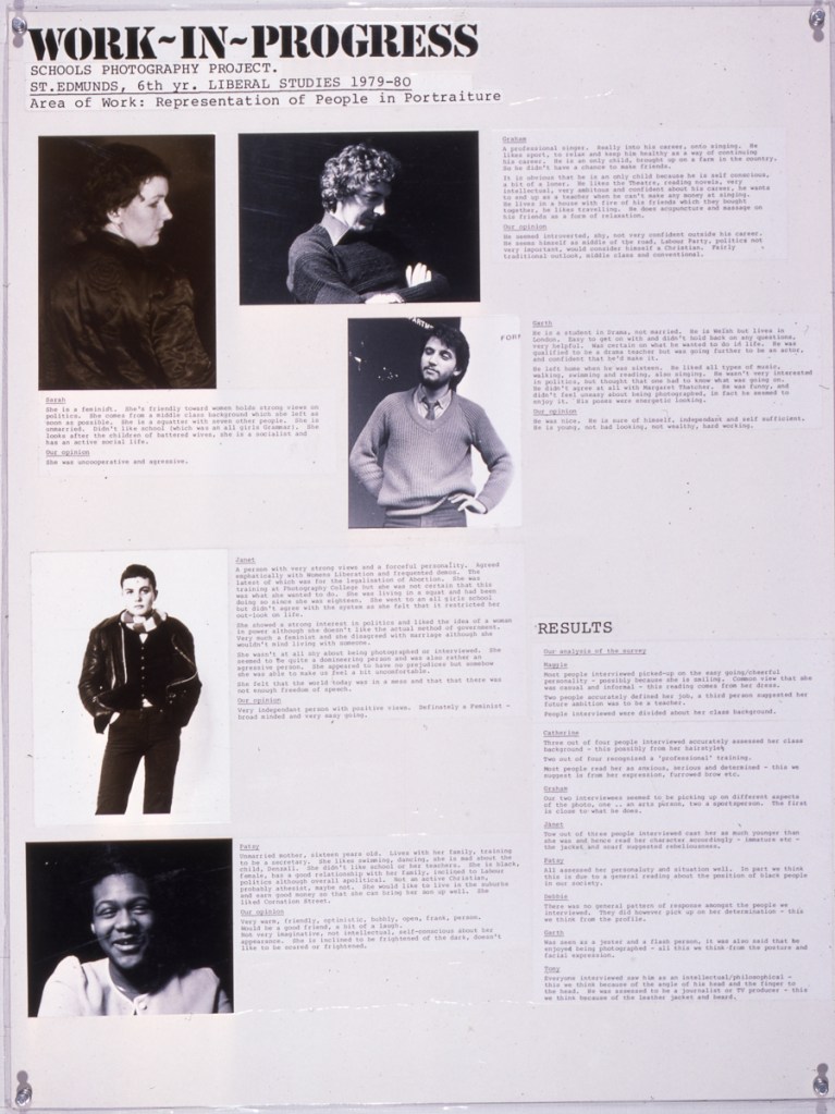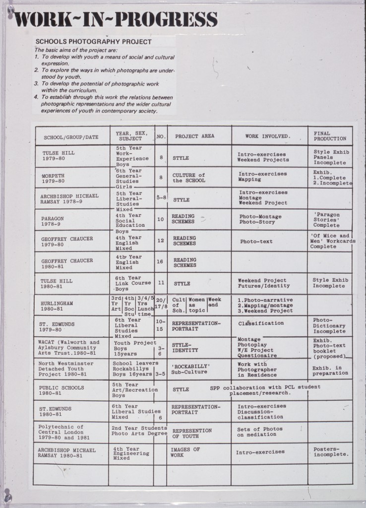 The exhibition typically carried a lot of typed text which attempted to give some of the educational thinking behind each project. Exhibited at the Cockpit Gallery under the title of ‘Cultural Studies Open Week’ it has never been shown again. A booklet was produced to coincide with the exhibition which was the Pilot report of the Schools Photography Project, entitled Youth, Class and Schooling.