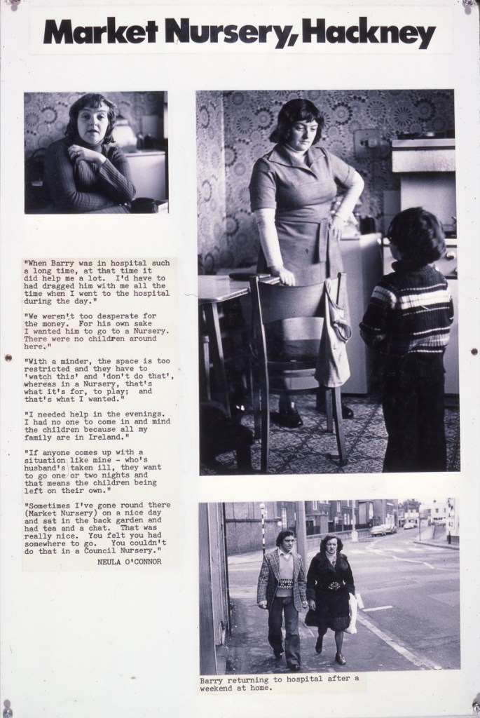 ” The collective’s original aim was to document women in Hackney, with the intention of making visible the invisible, thereby validating women’s experience and demonstrating women’s unrecognised contribution to the economy”. The collective photographed a cross-section of working women in Hackney, in factories, nurseries, shops and sweatshops; including Home-workers, childminders, school teachers and parents. The pictures were linked with text which gave the current unequal pay statistics and showed how women were fighting back.