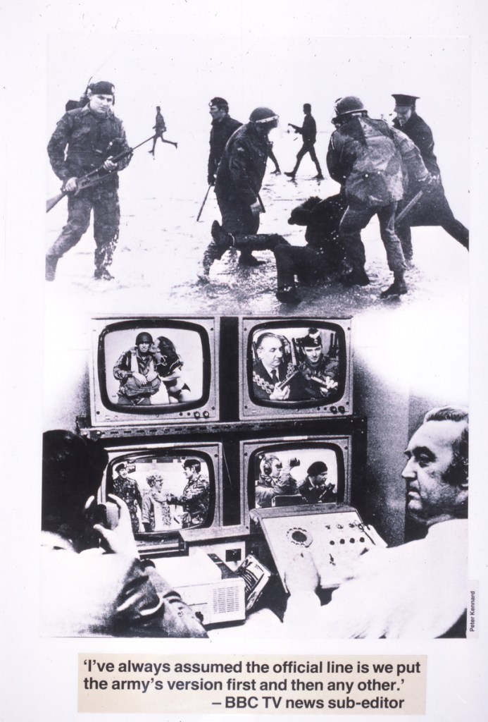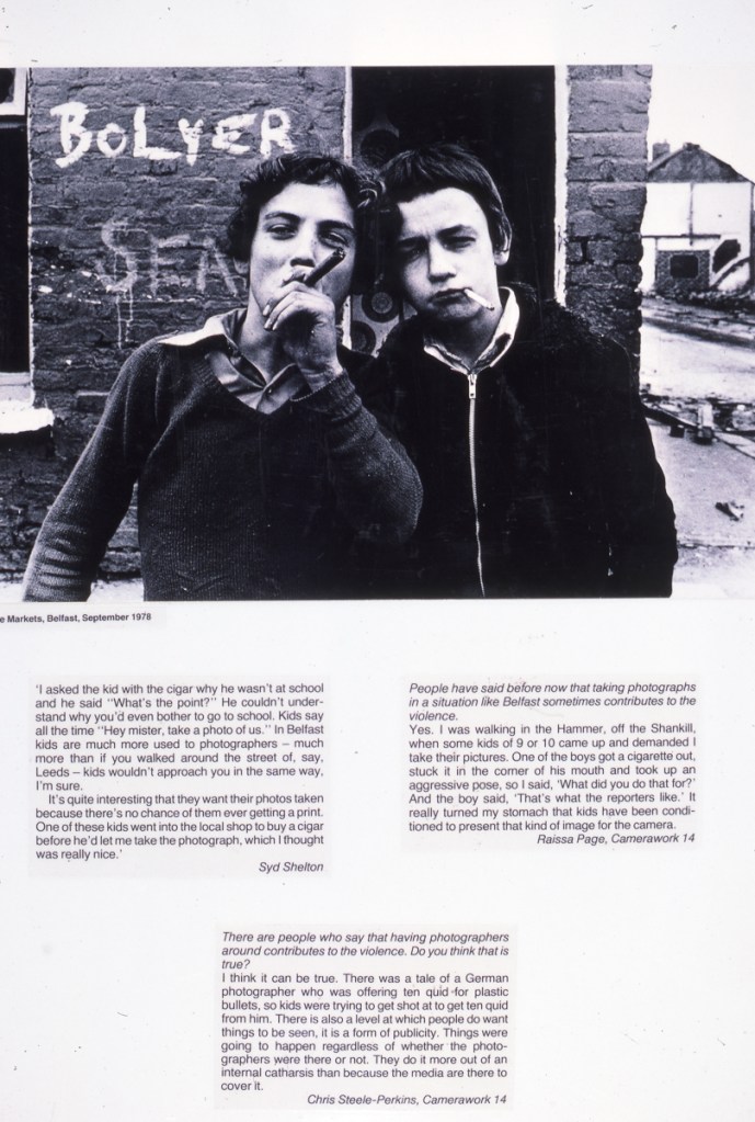 SYNOPSIS: The exhibition was based on issue 14 of Camerawork magazine: “Reporting on Northern Ireland”. It begins with a history section and has further sections on housing, unemployment, the security forces, demonstrations, and the role of the British media.