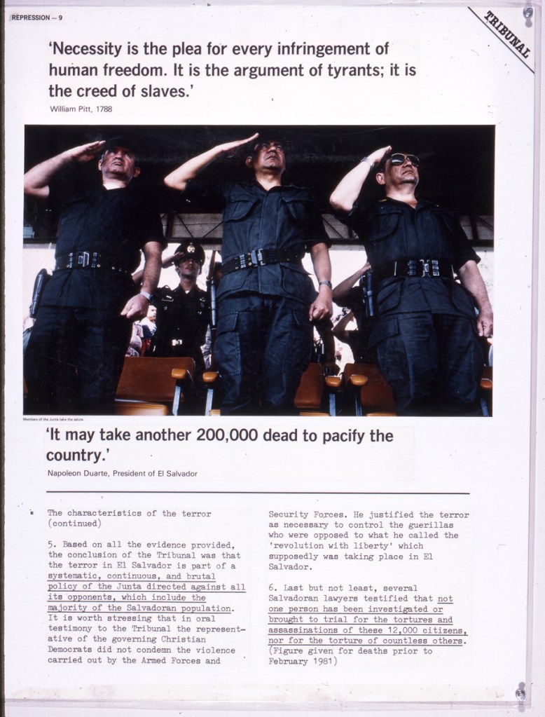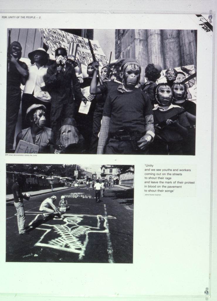 SYNOPSIS: “Over 100 black and white and colour photographs, mostly from British, American and French photojournalists and filmmakers accompanied by informative text. Photos and text panels were broken into a number of sub-sections dealing with the history, socio-economic background, US intervention, repression, the role of the junta, the church, women and children and the rise of the FDR and the FMLN. It was aimed at providing very basic information since at that time very little was known publically about events in Central America.