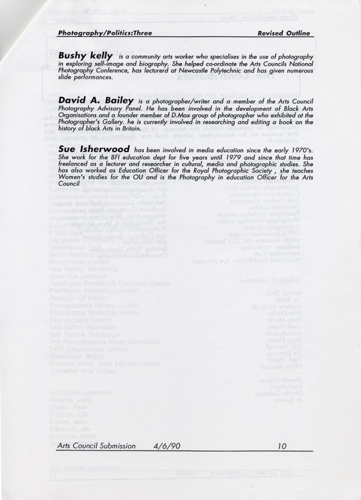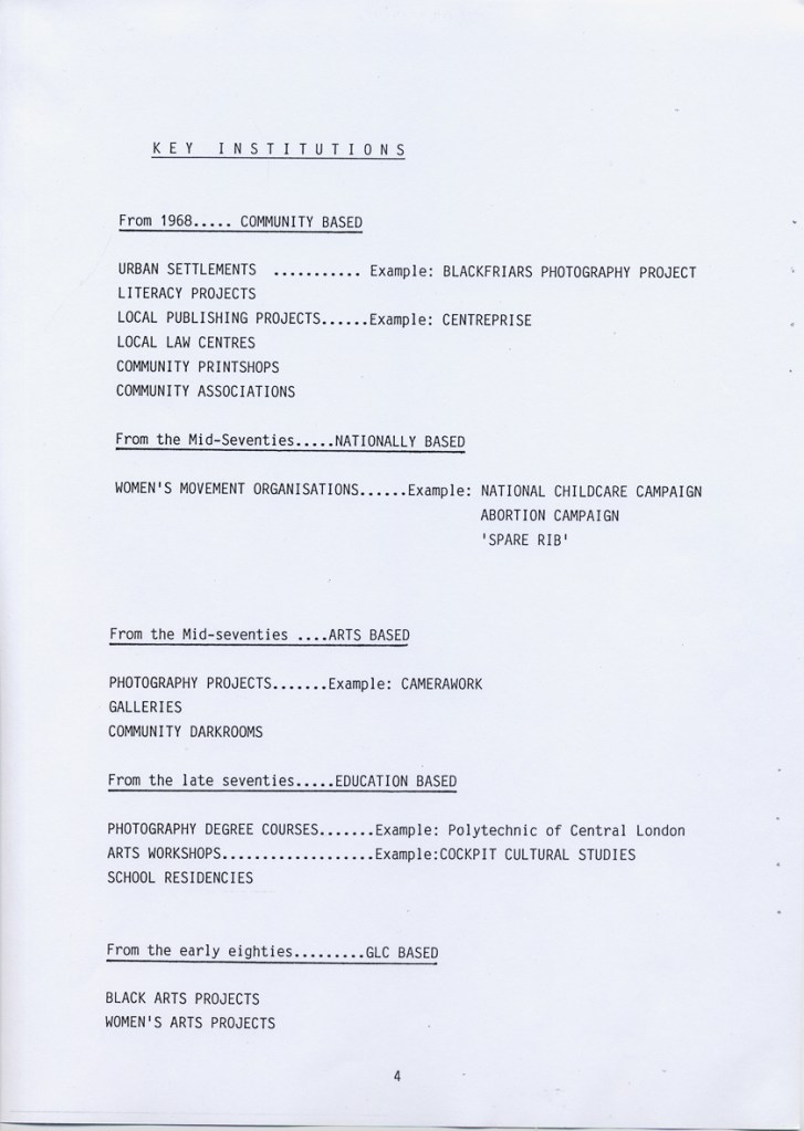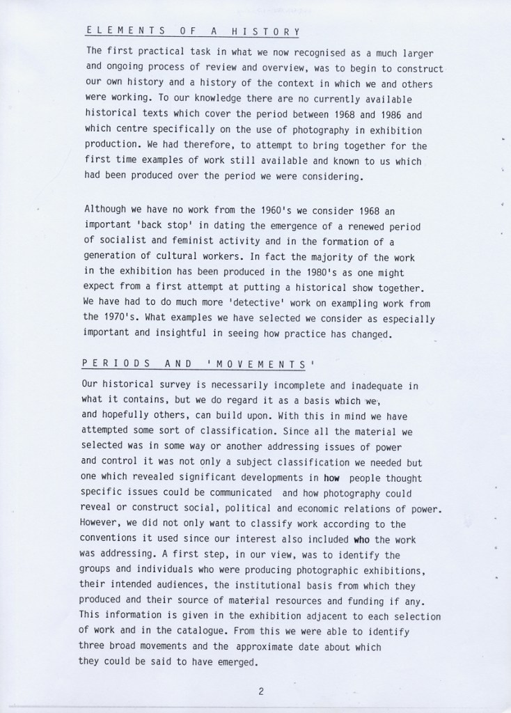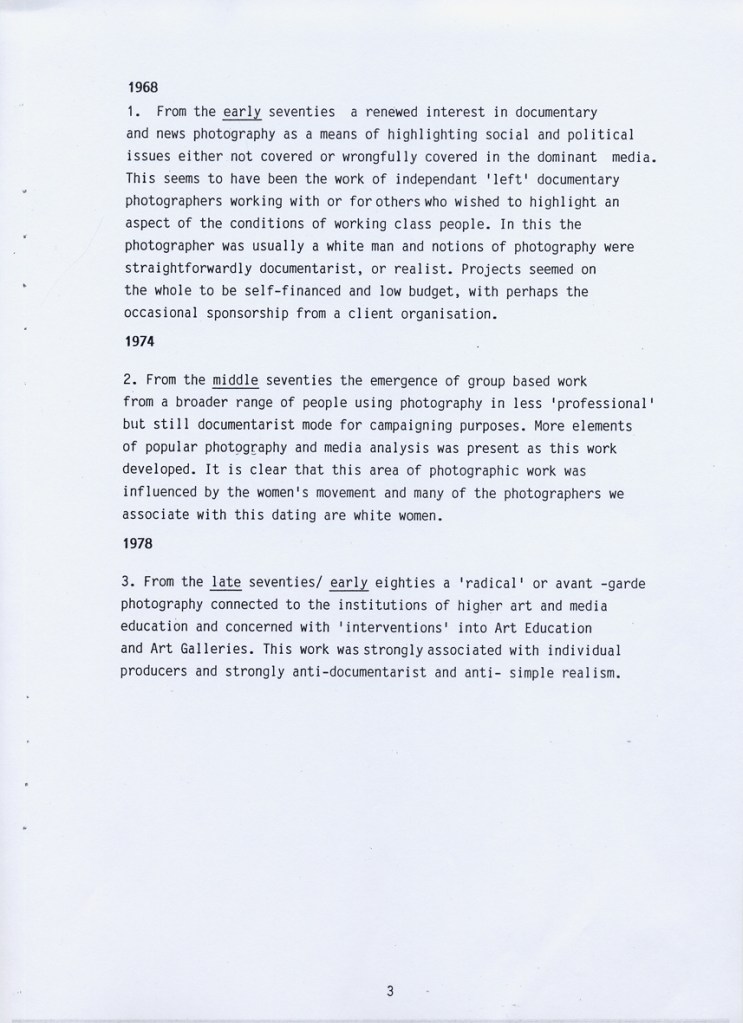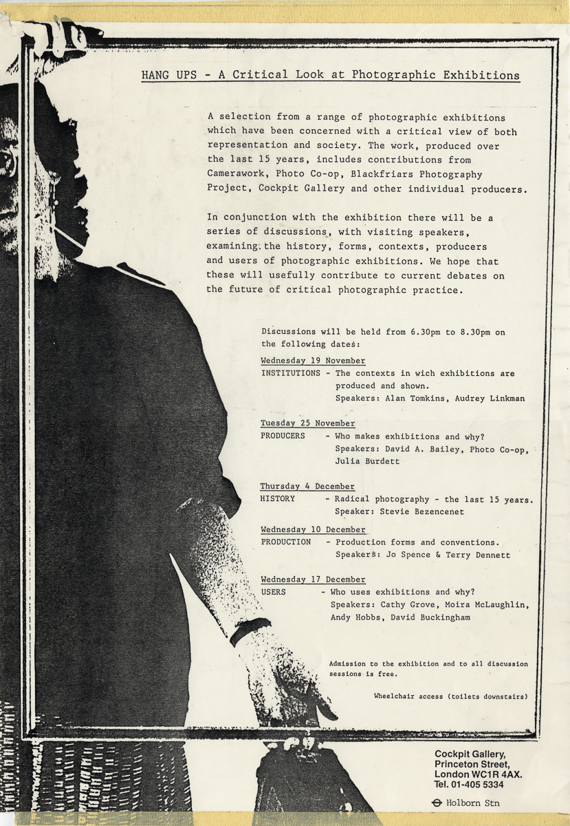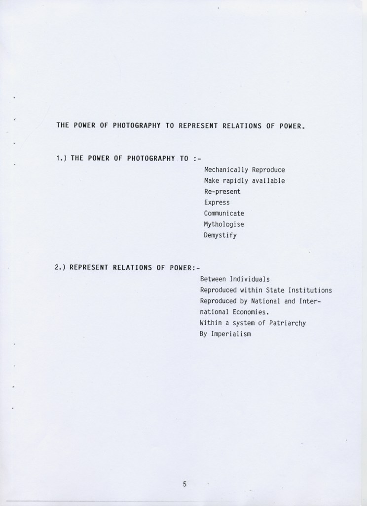 A selection from a range of photographic exhibitions which have been concerned with a critical view of both representation and society. The work, produced over the last 15 years, includes contributions from Camerawork, Photo Co-op, Blackfriars Photography Project, Cockpit Gallery and other individual producers.