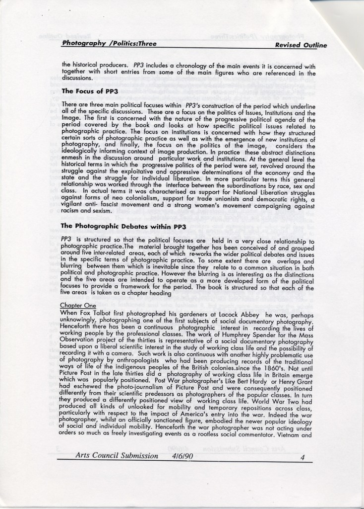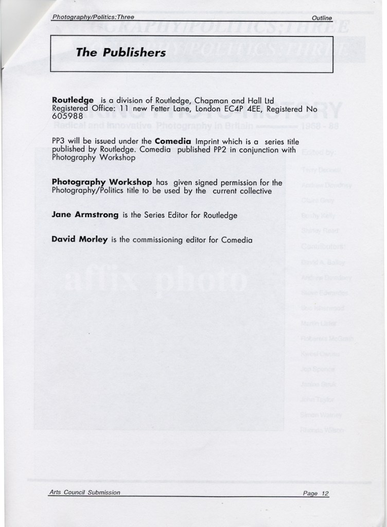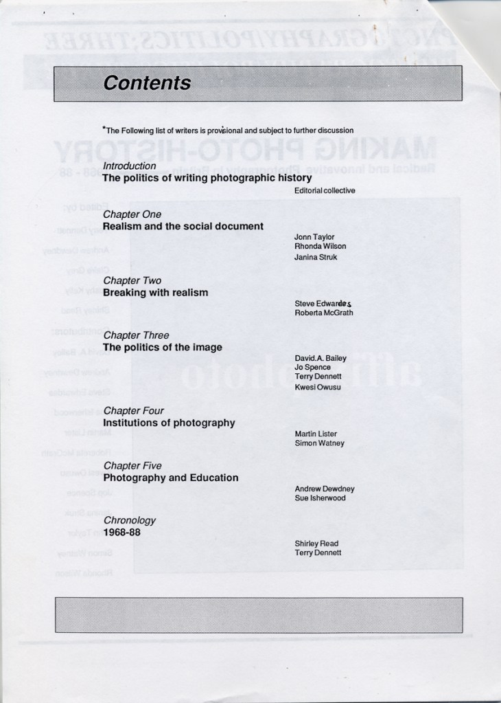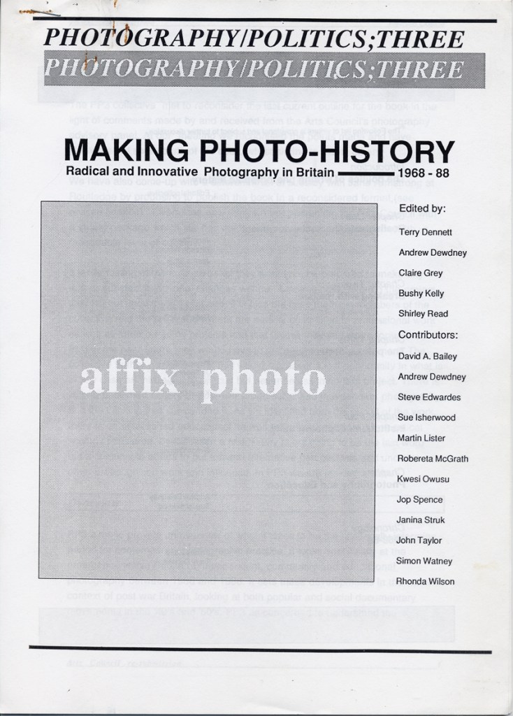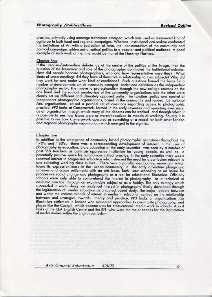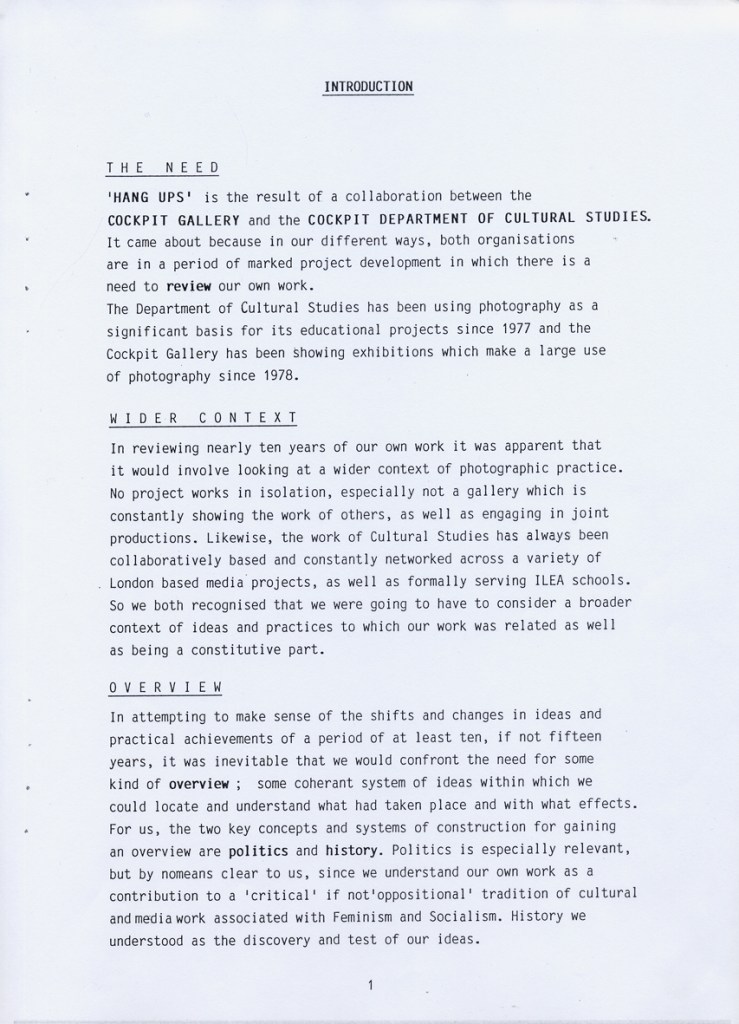 After the Hang Ups exhibition it was decided to expand on the history and make it into a book. An editorial group was formed which included Terry Dennett. Photography Workshop agreed that Hang Ups could become the next issue of Photography Politics. Photography Politics One had been published by Jo Spence and Terry in September 1979. Photography Politics Two edited by Patricia Holland, Jo Spence and Simon Watney was published in 1986. It included an article by Andrew Dewdney and Martin Lister describing the Cockpit’s Schools Photography Project. The Cockpit employed Shirley Read to research an extensive chronology of political and photographic events covering three decades which would form a key part of the book. Terry produced the illustrations based in part on the Hang Ups exhibition. Despite having the backing of Routledge the proposal failed to receive funding from the Arts Council twice. The second submission gives an idea of the concept which had to be abandoned when the Cockpit closed in 1990.