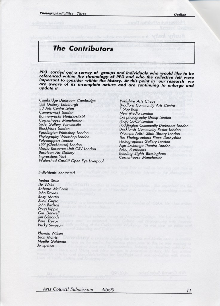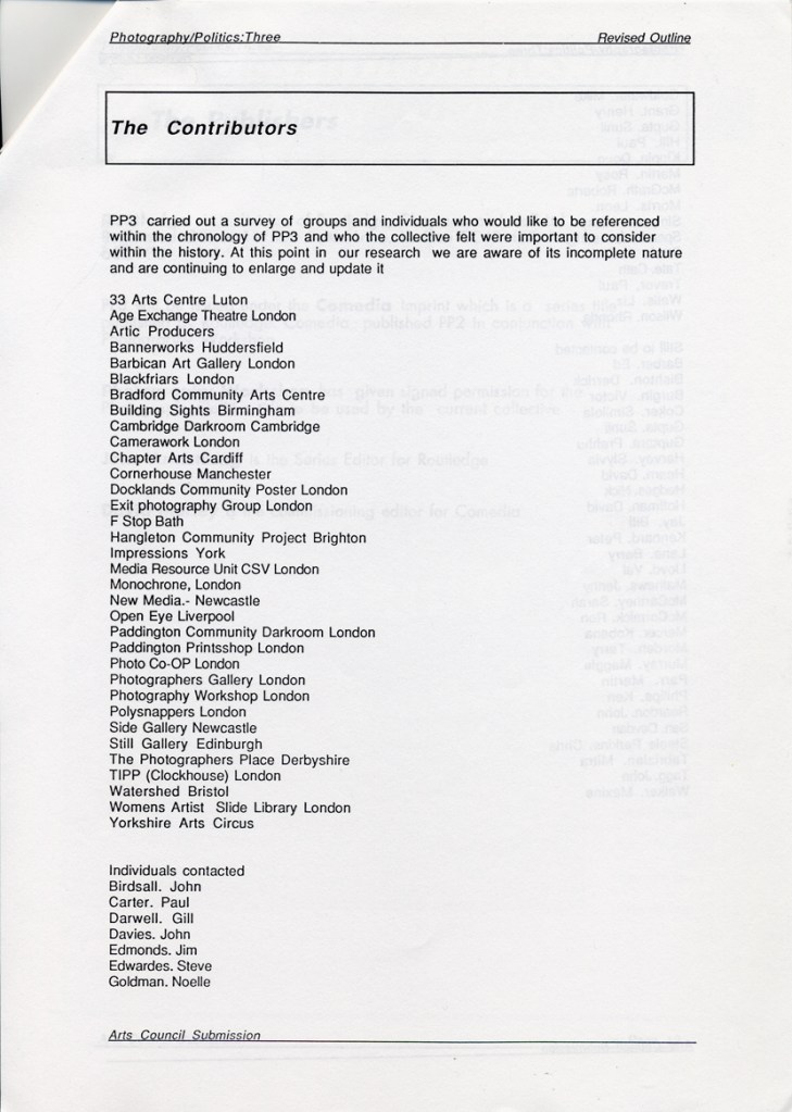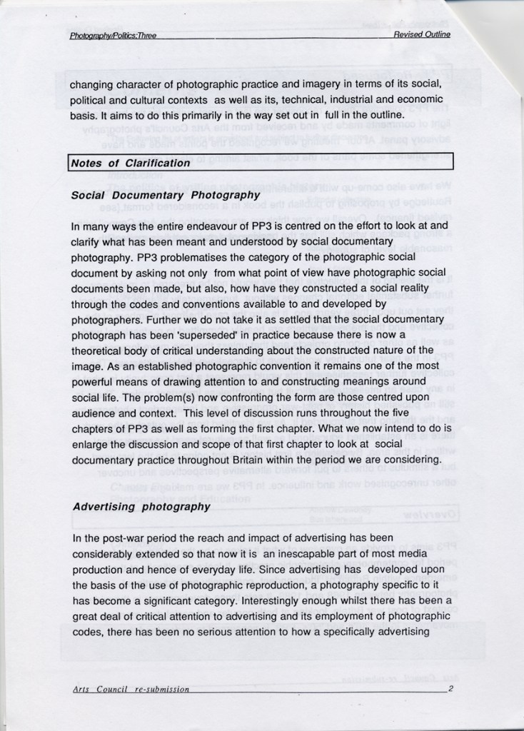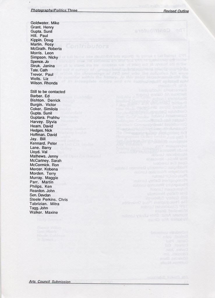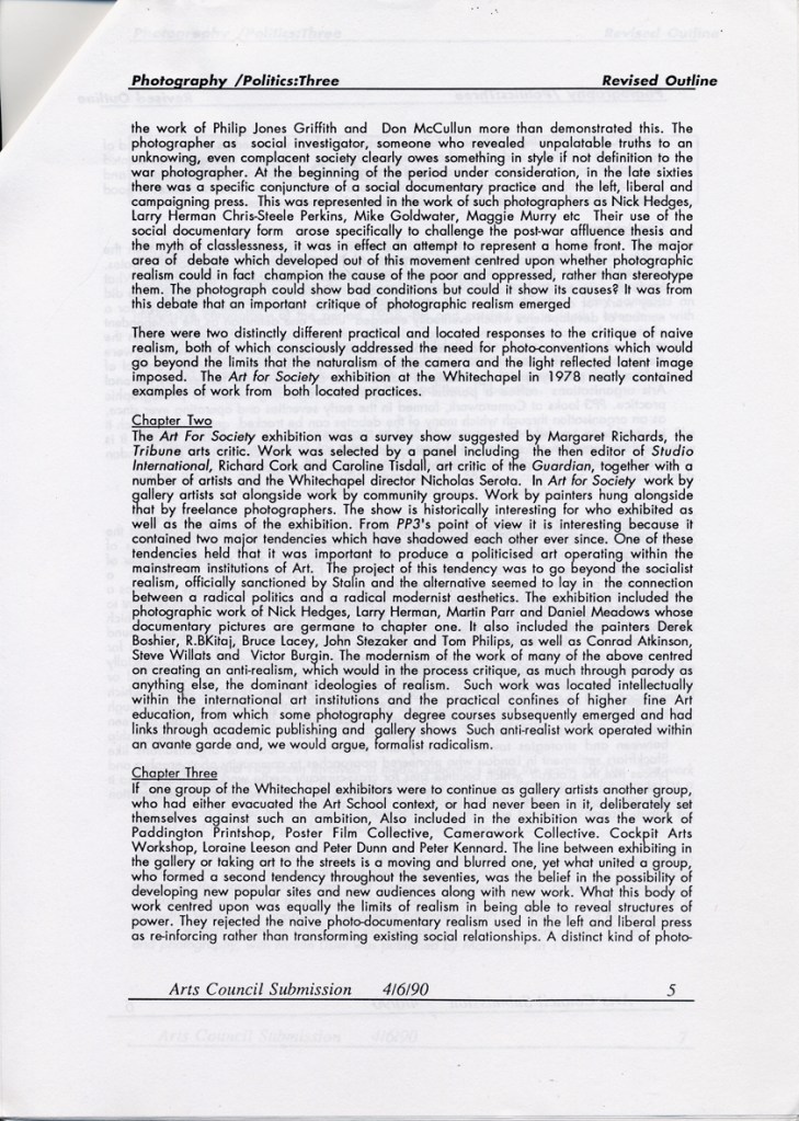 After the Hang Ups exhibition it was decided to expand on the history and make it into a book. An editorial group was formed which included Terry Dennett. Photography Workshop agreed that Hang Ups could become the next issue of Photography Politics. Photography Politics One had been published by Jo Spence and Terry in September 1979. Photography Politics Two edited by Patricia Holland, Jo Spence and Simon Watney was published in 1986. It included an article by Andrew Dewdney and Martin Lister describing the Cockpit’s Schools Photography Project. The Cockpit employed Shirley Read to research an extensive chronology of political and photographic events covering three decades which would form a key part of the book. Terry produced the illustrations based in part on the Hang Ups exhibition. Despite having the backing of Routledge the proposal failed to receive funding from the Arts Council twice. The second submission gives an idea of the concept which had to be abandoned when the Cockpit closed in 1990.