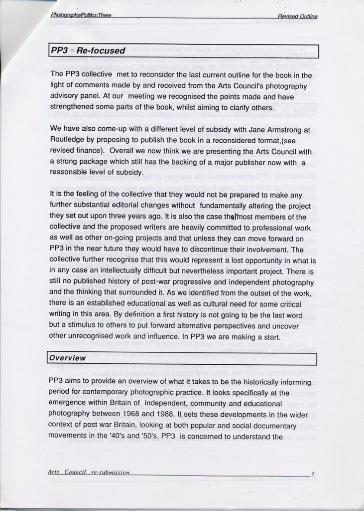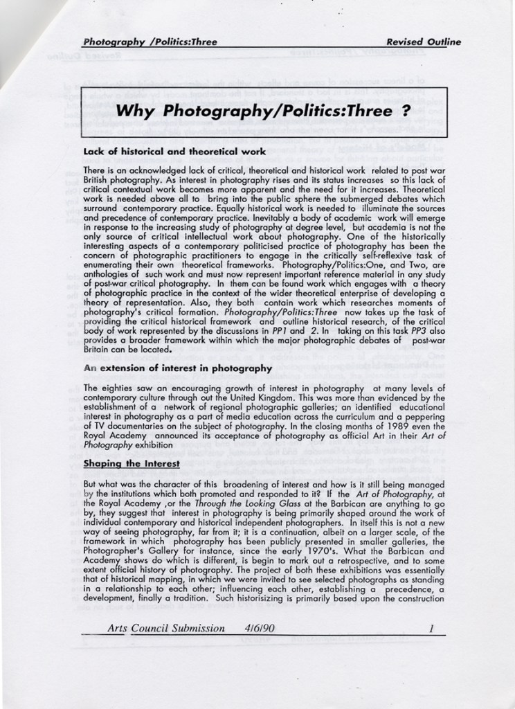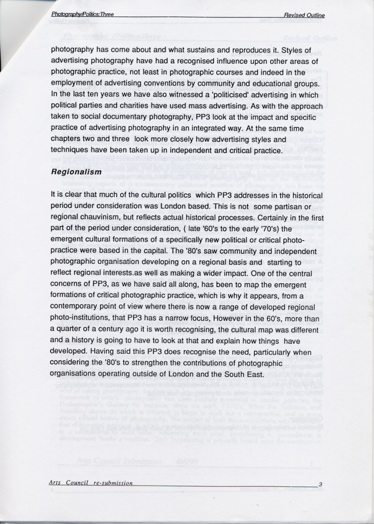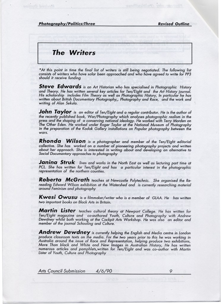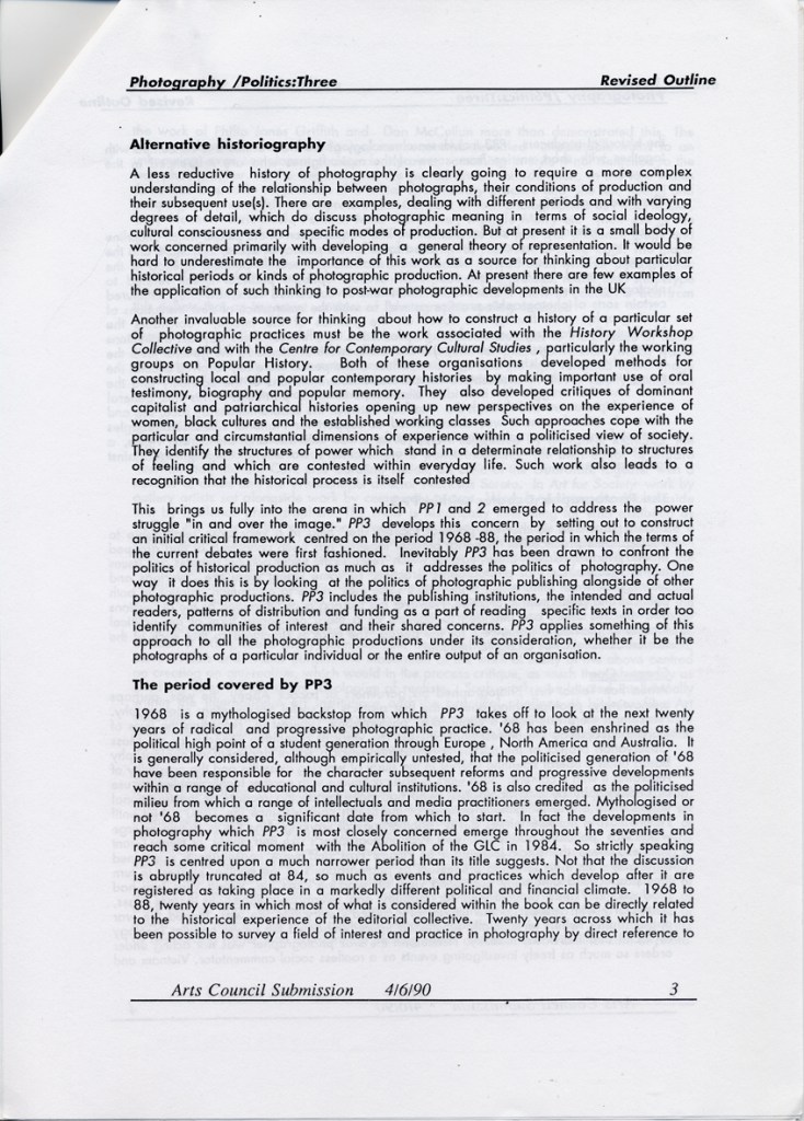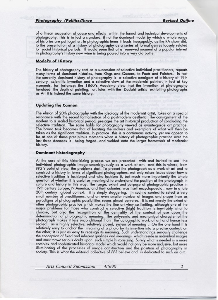 After the Hang Ups exhibition it was decided to expand on the history and make it into a book. An editorial group was formed which included Terry Dennett. Photography Workshop agreed that Hang Ups could become the next issue of Photography Politics. Photography Politics One had been published by Jo Spence and Terry in September 1979. Photography Politics Two edited by Patricia Holland, Jo Spence and Simon Watney was published in 1986. It included an article by Andrew Dewdney and Martin Lister describing the Cockpit’s Schools Photography Project. The Cockpit employed Shirley Read to research an extensive chronology of political and photographic events covering three decades which would form a key part of the book. Terry produced the illustrations based in part on the Hang Ups exhibition. Despite having the backing of Routledge the proposal failed to receive funding from the Arts Council twice. The second submission gives an idea of the concept which had to be abandoned when the Cockpit closed in 1990.