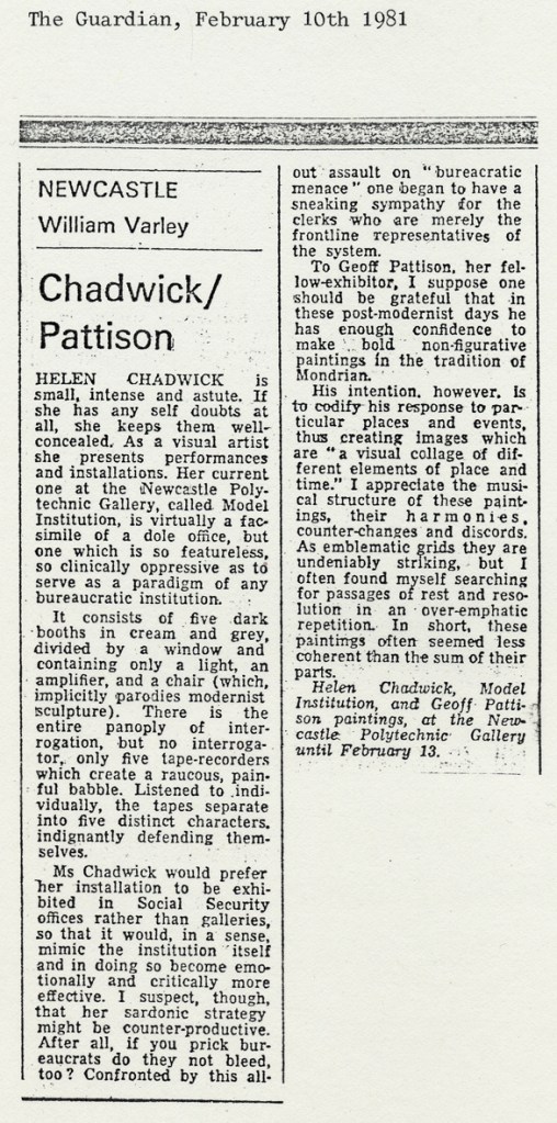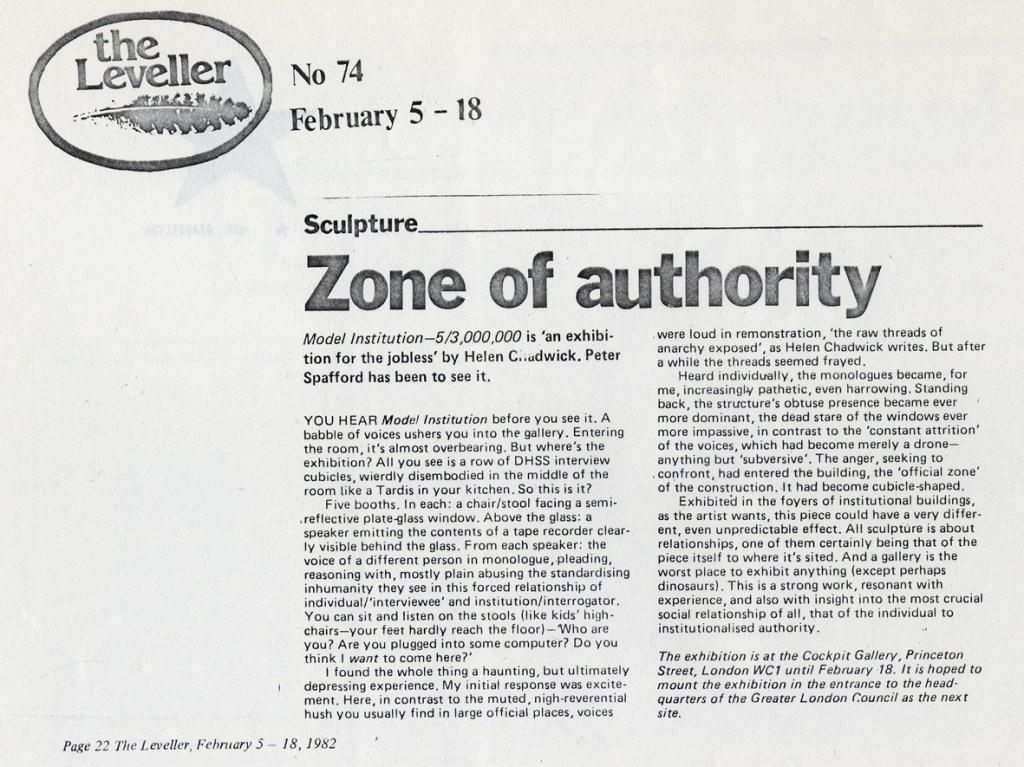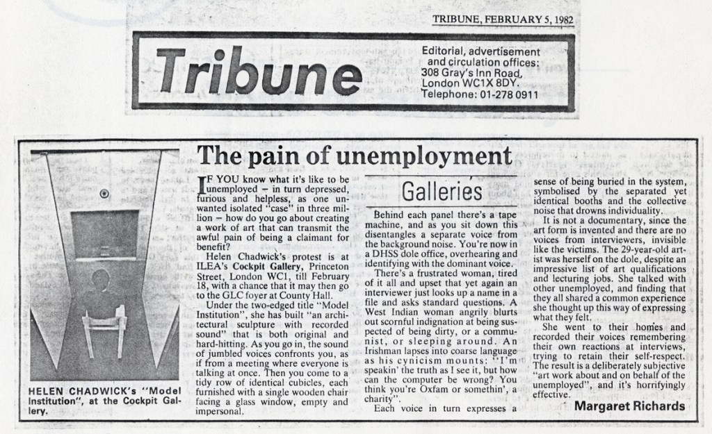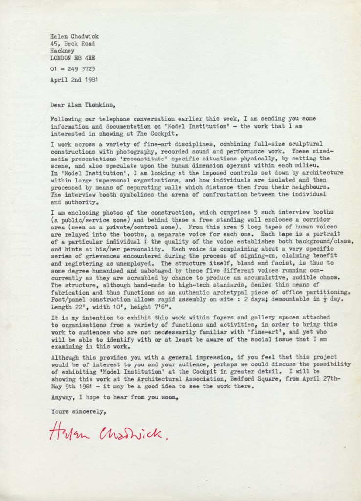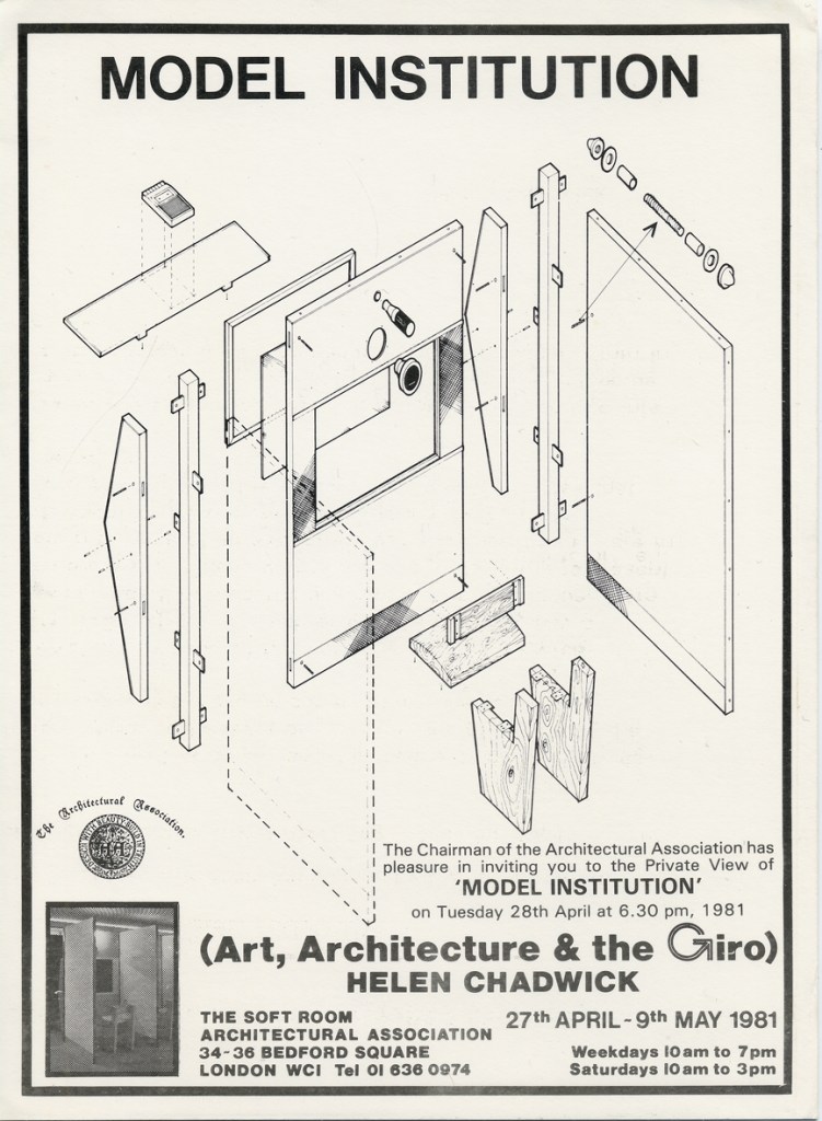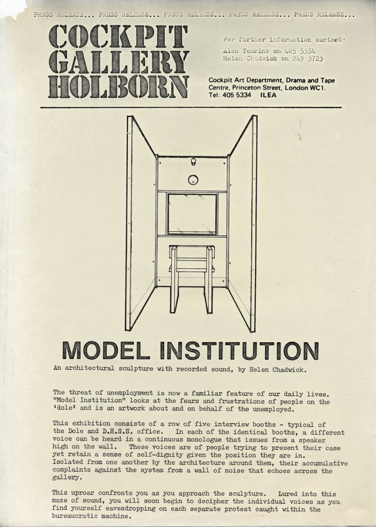 Helen Chadwick made two exhibitions which were shown at the Cockpit Gallery. Model Institution in 1982 and Growing Up an Artists in Schools project in 1983.