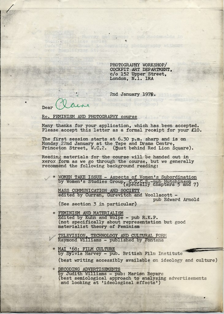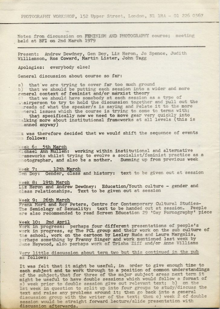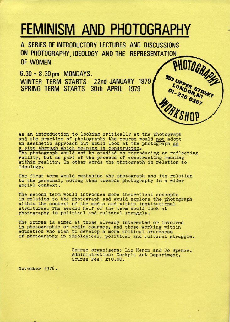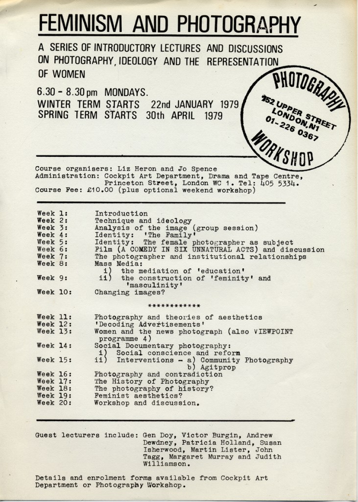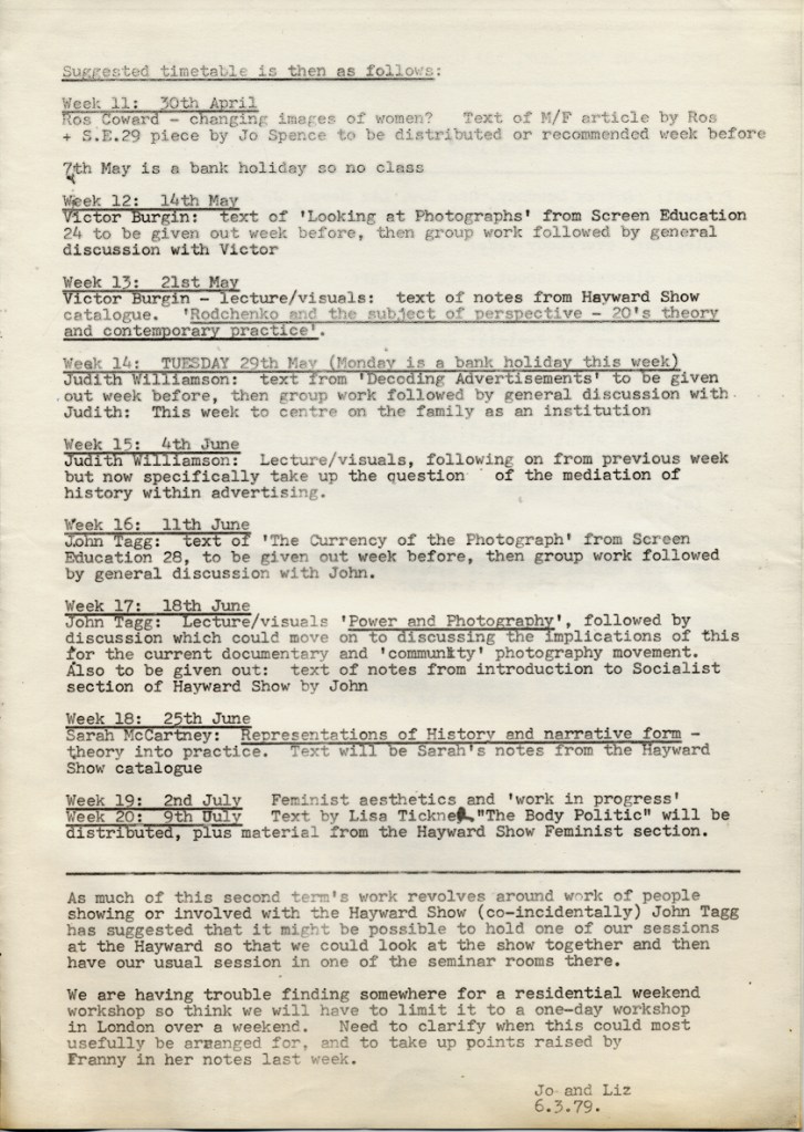In 1979 Jo Spence and Liz Heron with Andrew Dewdney and Martin Lister from the Cockpit ran the course. The reading list included Photography / Politics One which was about to be published.
