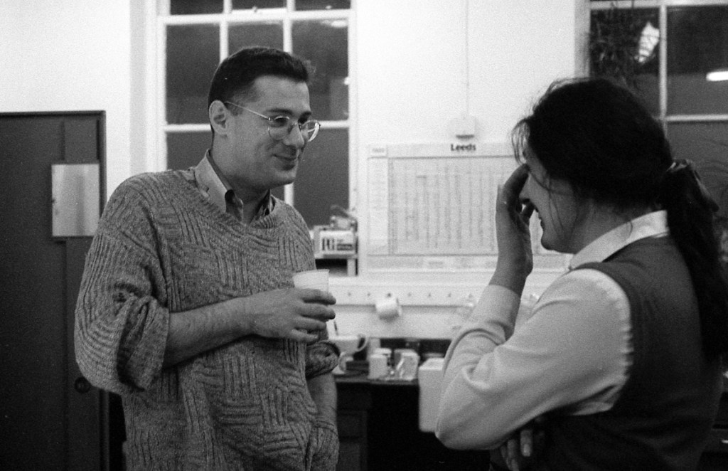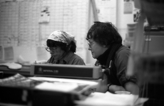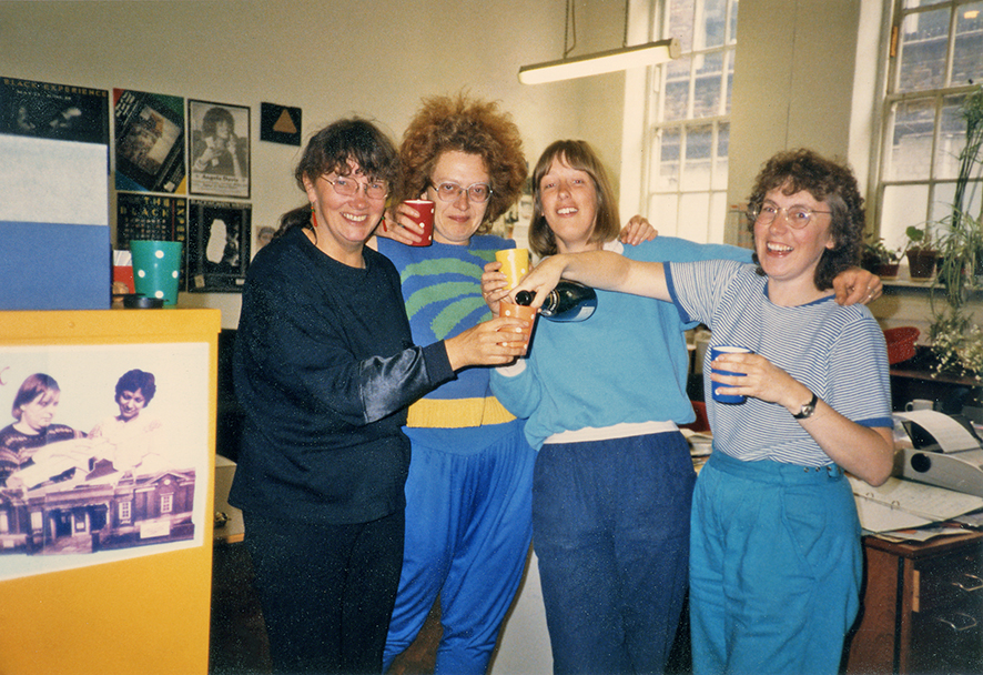 Jo, Rosy, Jude and Claire in the gallery office celebrating something in 1986.