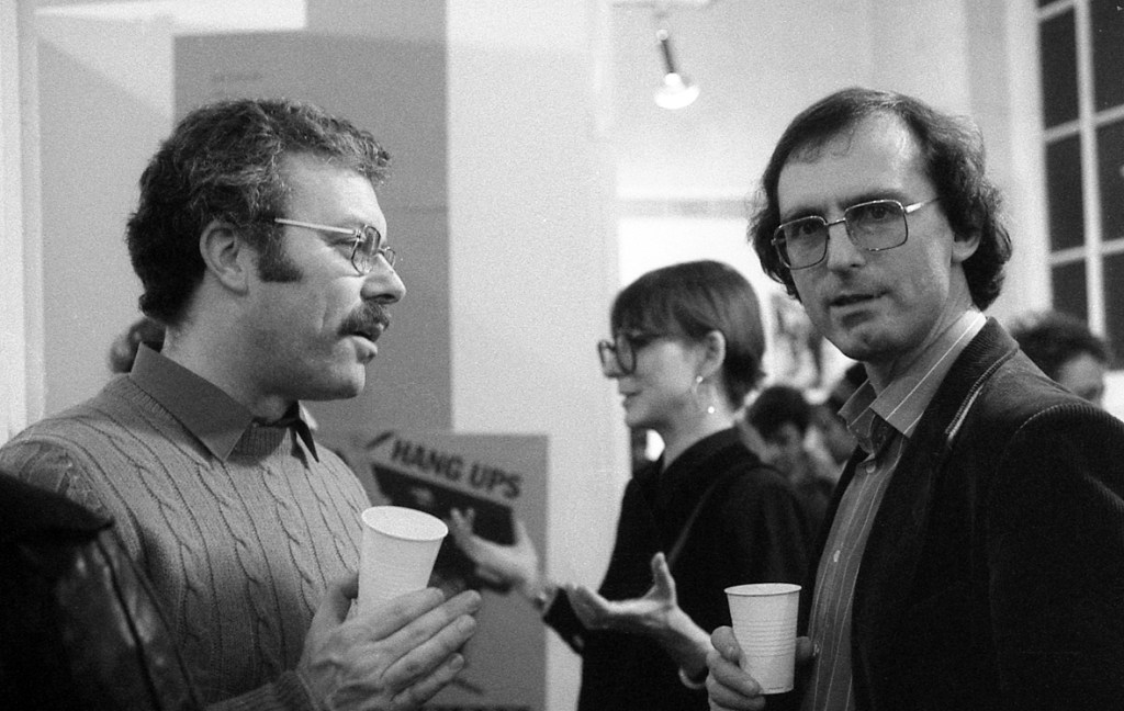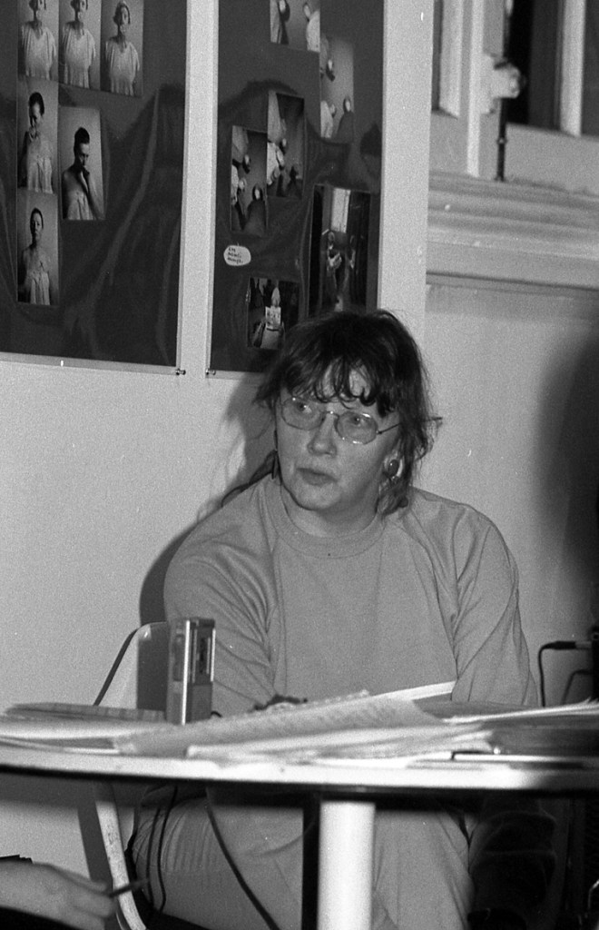 Jo with Rosy giving a talk about the exhibition The Picture of Health? in 1986