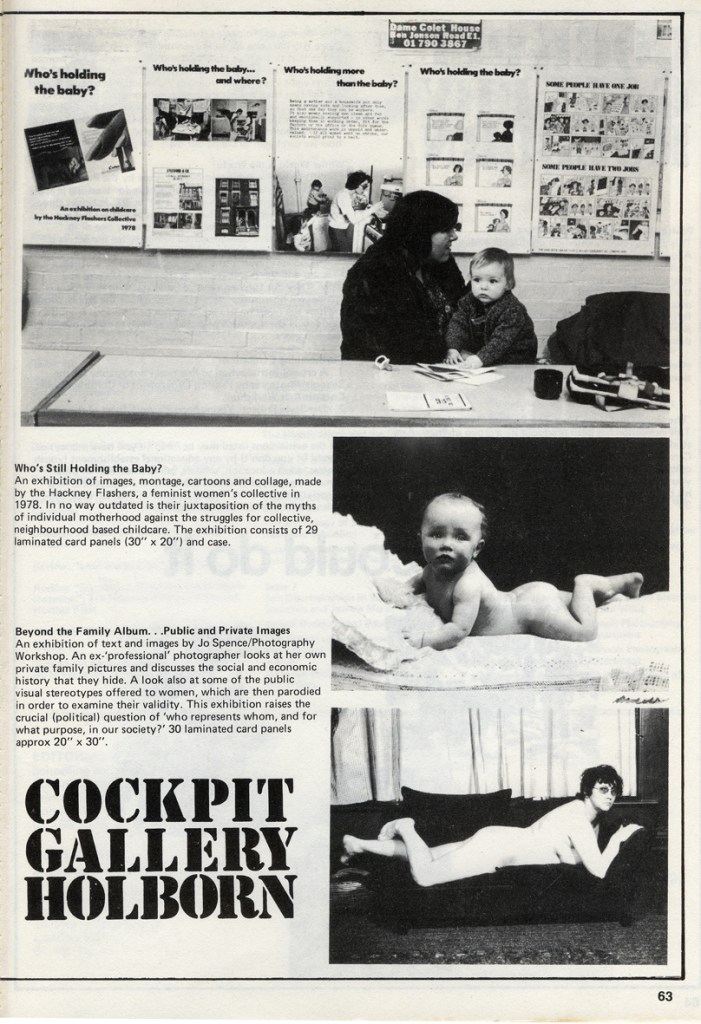 Jo’s exhibition Beyond the Family Album was one of the first that the Cockpit Gallery made available for hire in 1980. As a member of the Hackney Flashers she contributed to the exhibition Who’s Still Holding the Baby? made in 1978 and shown in and toured by the Gallery in 1980.