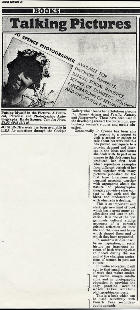 The National Photography Conference at Salford University April 3-5, 1987 was chaired by Alan Tomkins. Jo opened the proceedings with a paper titled “Questioning Documentary Practice” in which she argued for inclusivity and against “guilt tripping insults about hierarchies of oppression”. Some black delegates felt excluded by this, the opposite of what she had wanted. July’s Artists Newsletter covered the debate.