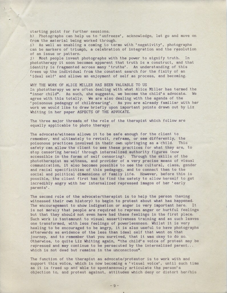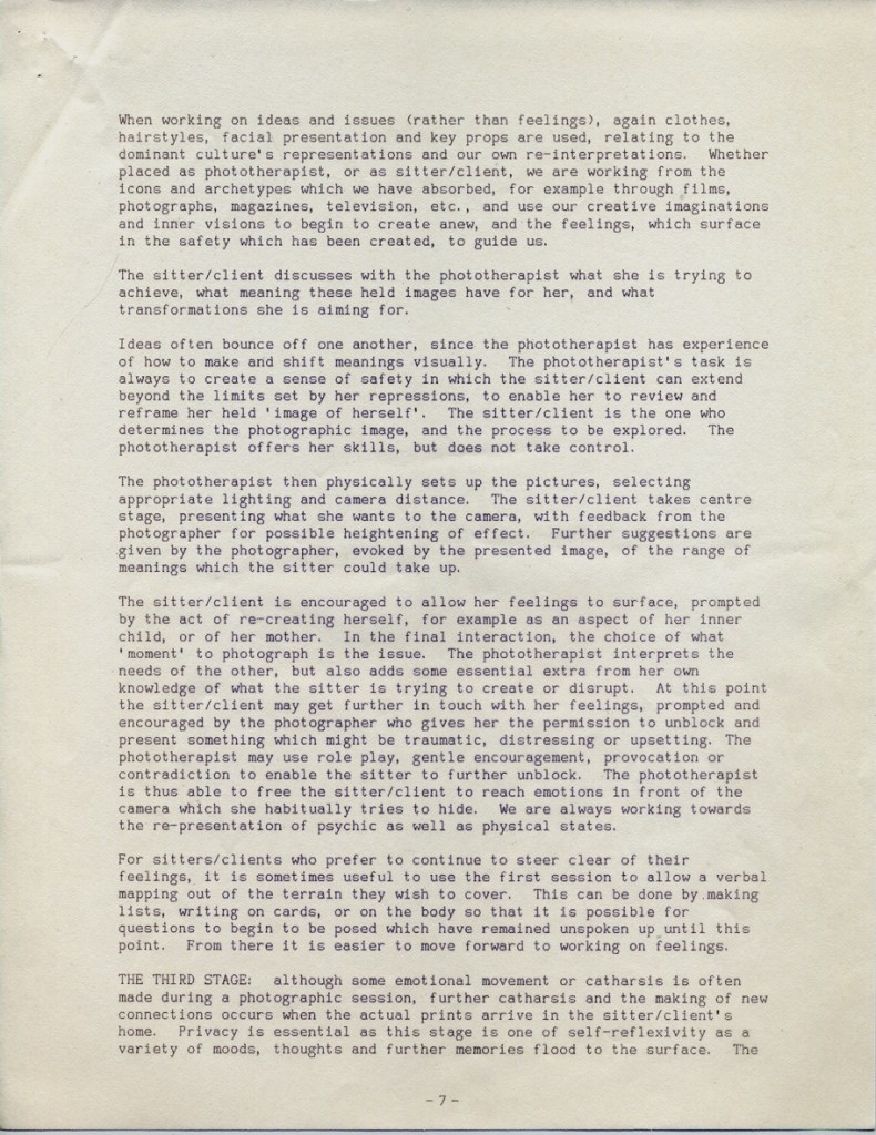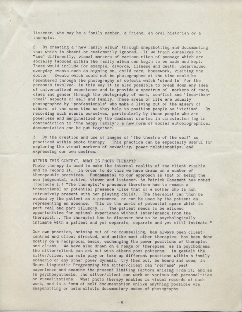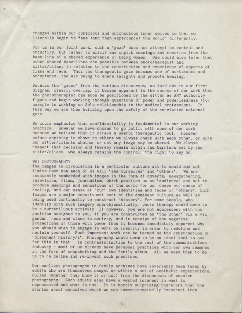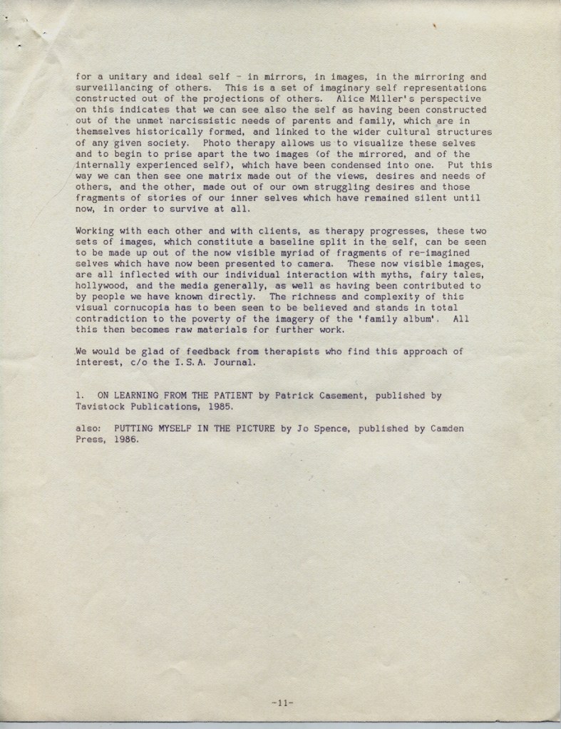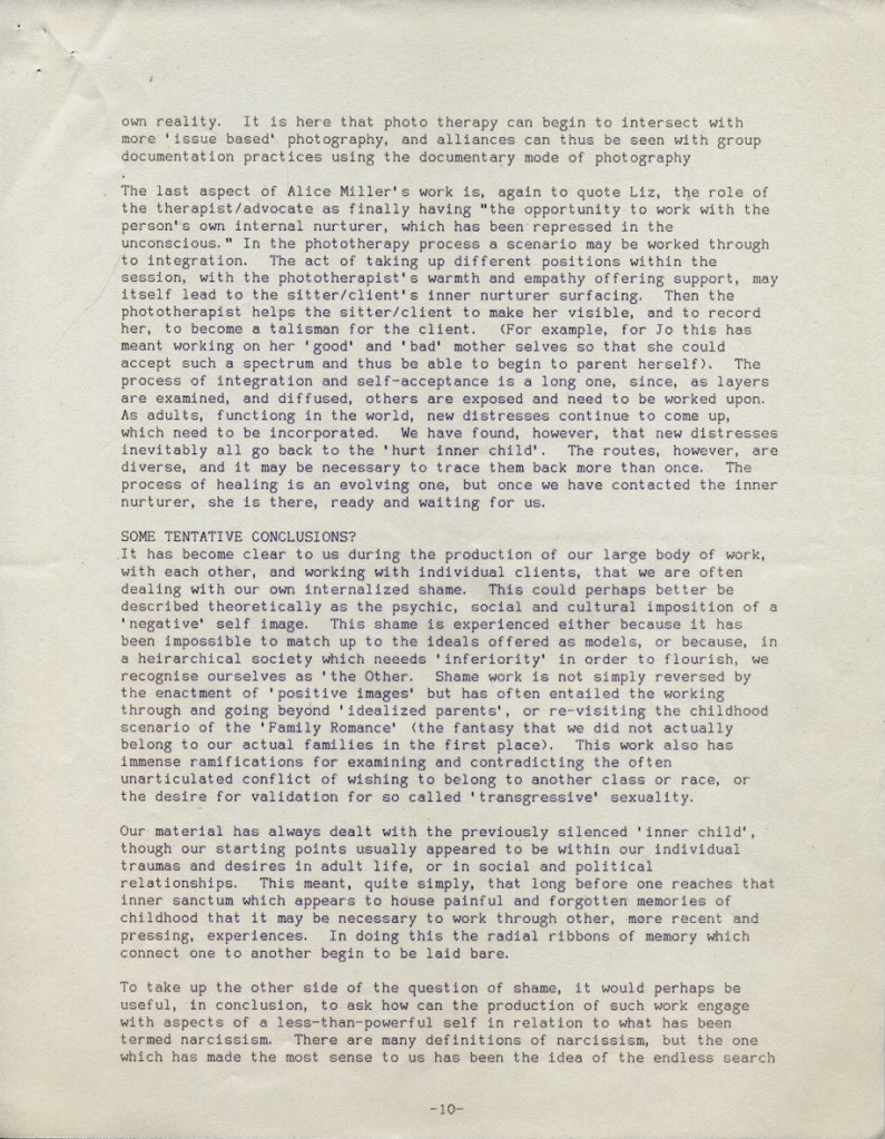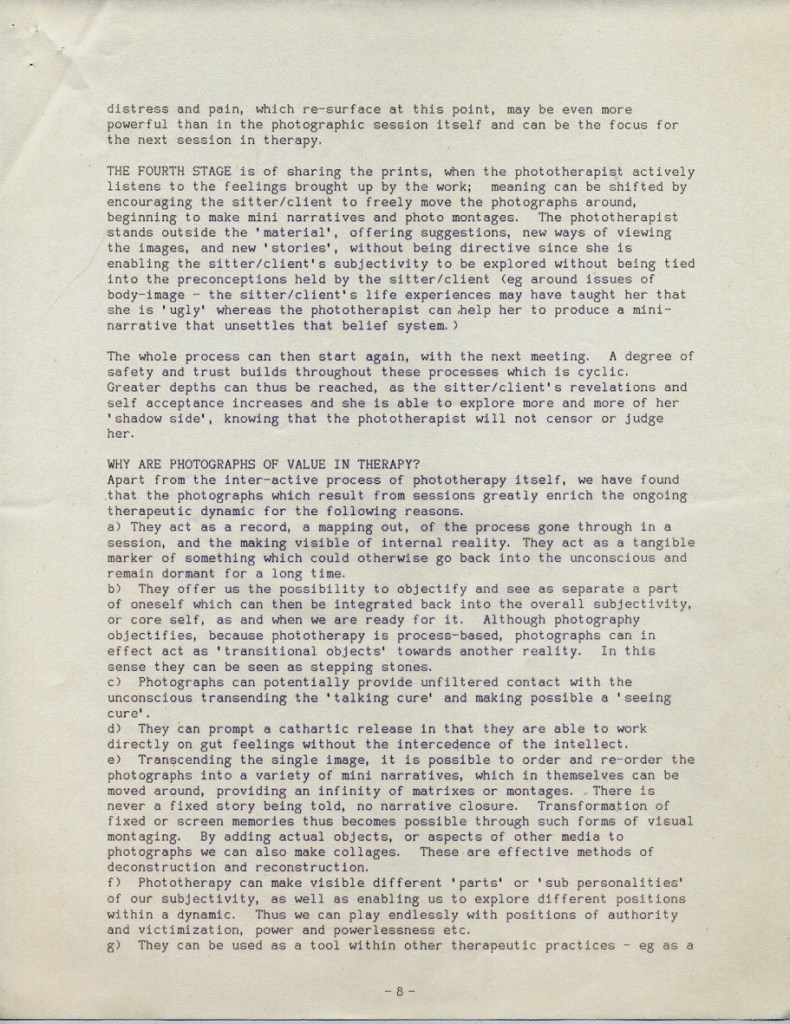 Paper on Photo Therapy by Rosy and Jo dated 7 February 1988. A version of this was published in Ten.8 Magazine, Autumn 1988, No. 30 pps 2-17.