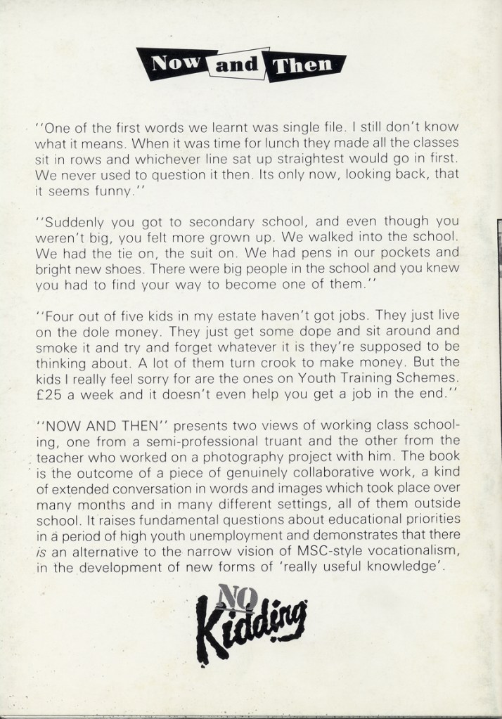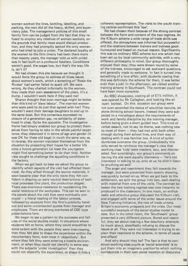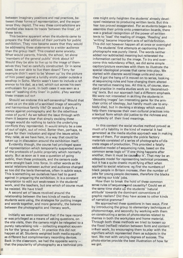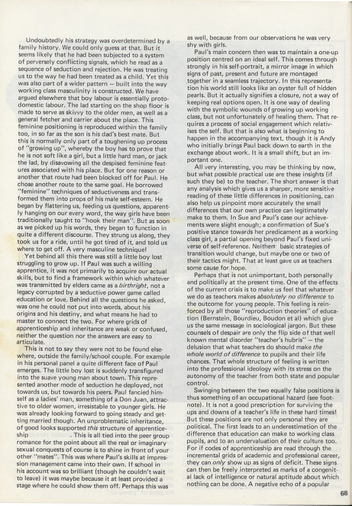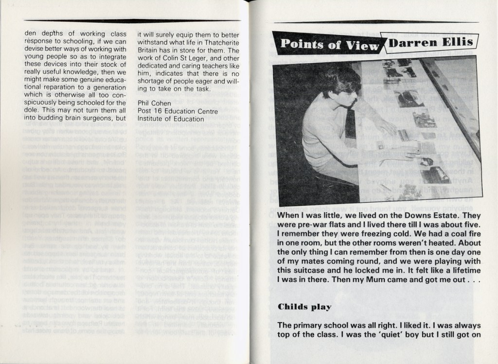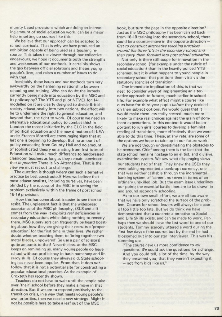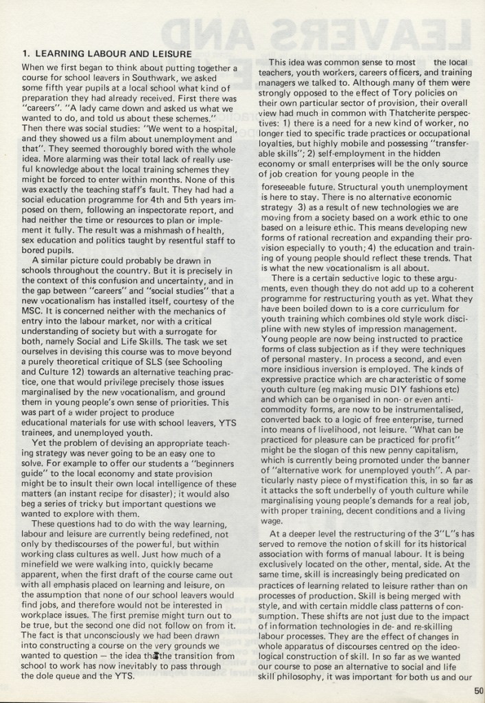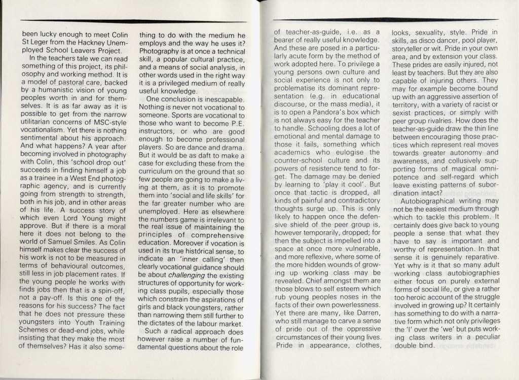 Philip Cohen and Adrian Chappell wrote about their exhibition Leavers Believers? in Schooling and Culture Issue 13 – Summer 1983