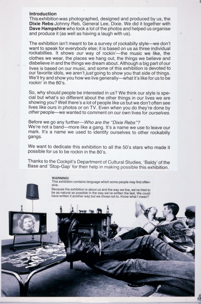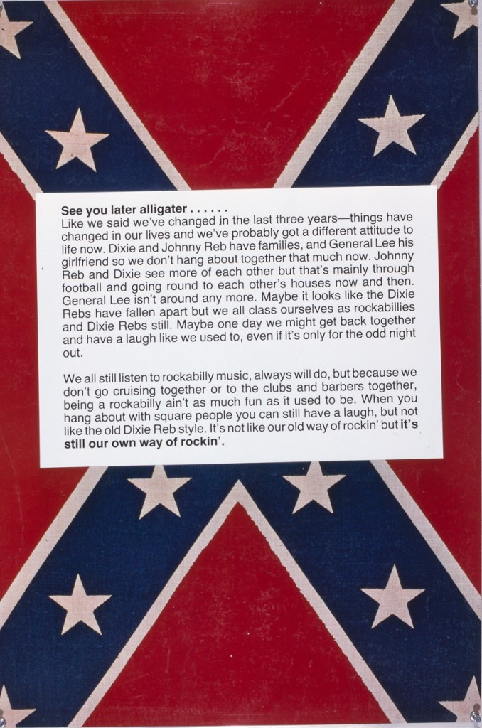 An exhibition by the Dixie Rebs with Dave Hampshire. The exhibition of photographs, photomontages and text is the result of a three-year collaboration between a group of rockabillies and the Cockpit photographer in residence, Dave Hampshire. Unlike other exhibitions about subculture, it has actually been produced by the people that it is about.