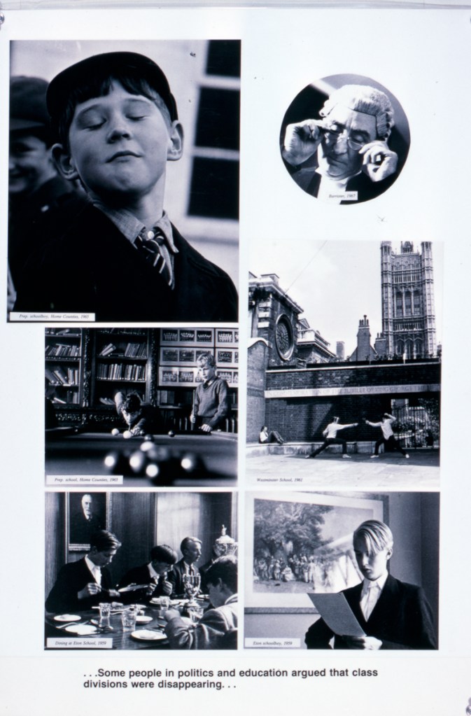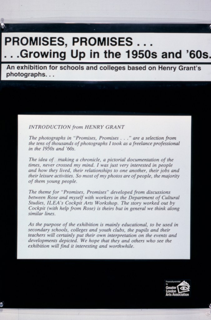 The exhibition charts post-war developments in schooling and popular culture and was loosely based on the thinking of the CENTRE FOR CONTEMPORARY CULTURAL STUDIES, Education Group, as written in their book Unpopular Education. The panels contain selections of Henry’s photos with a simple narrative caption running through the exhibition. It was made with secondary pupils in mind.