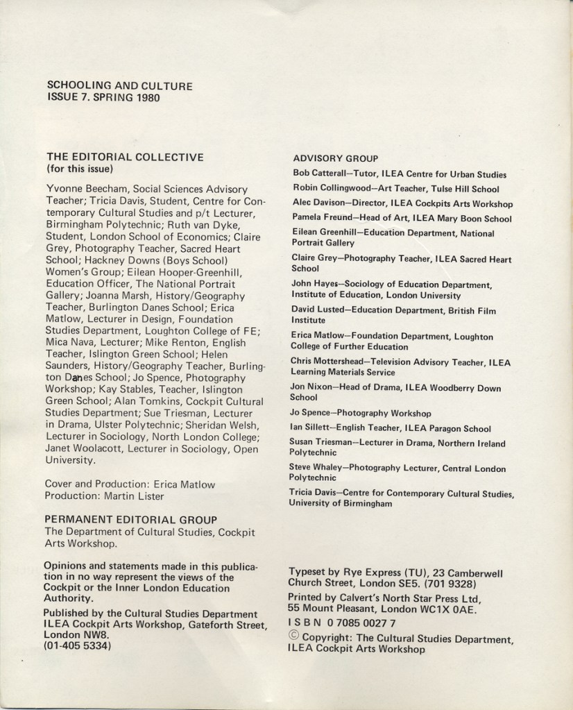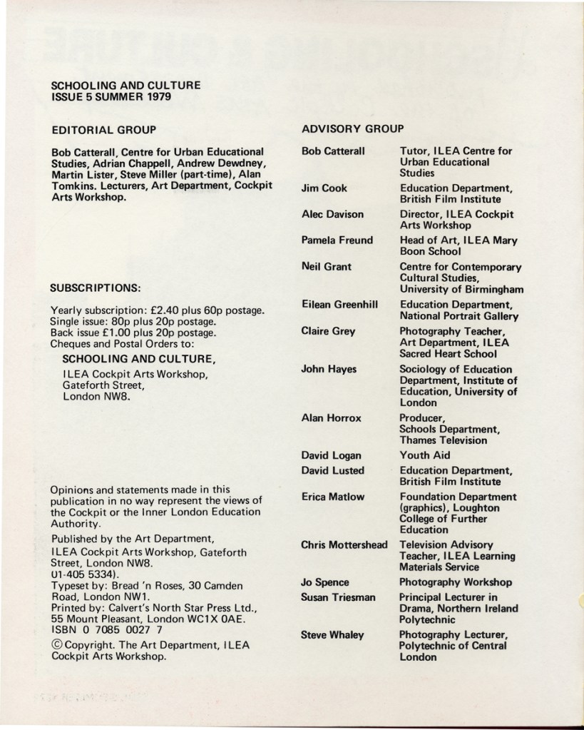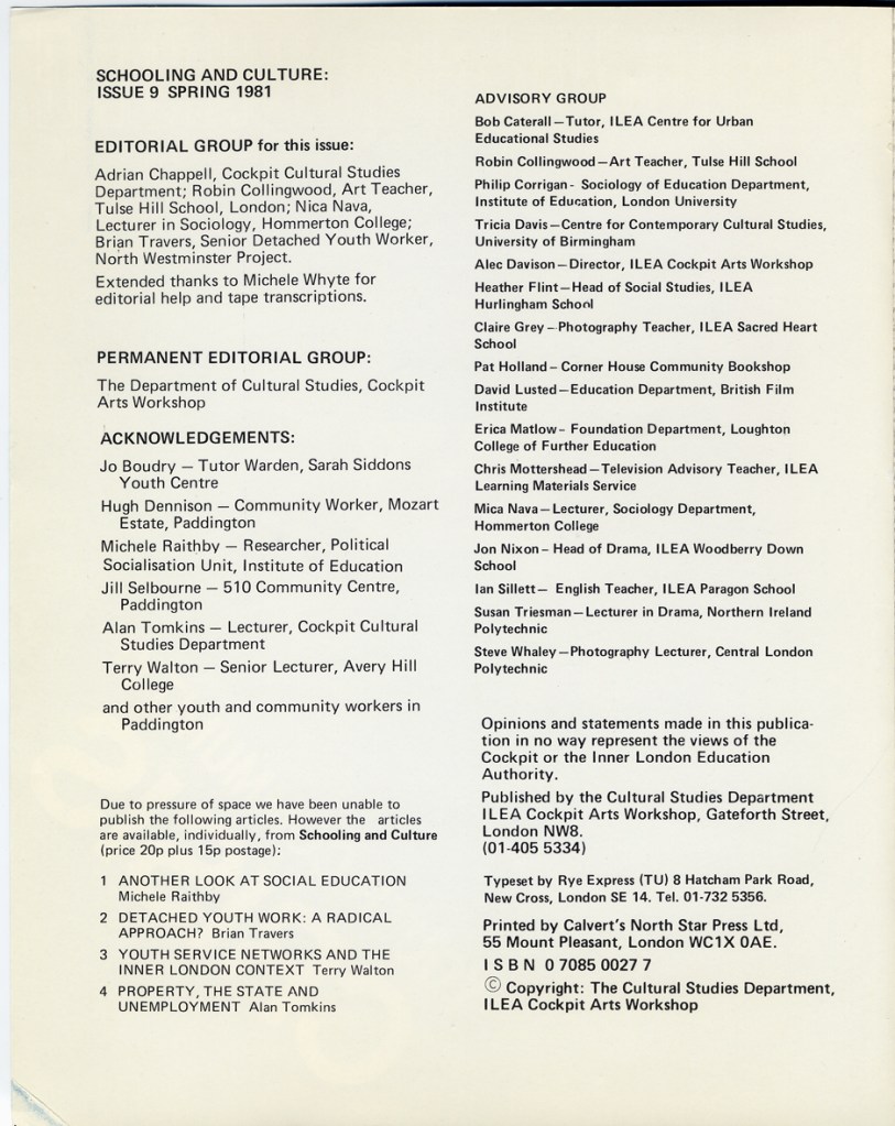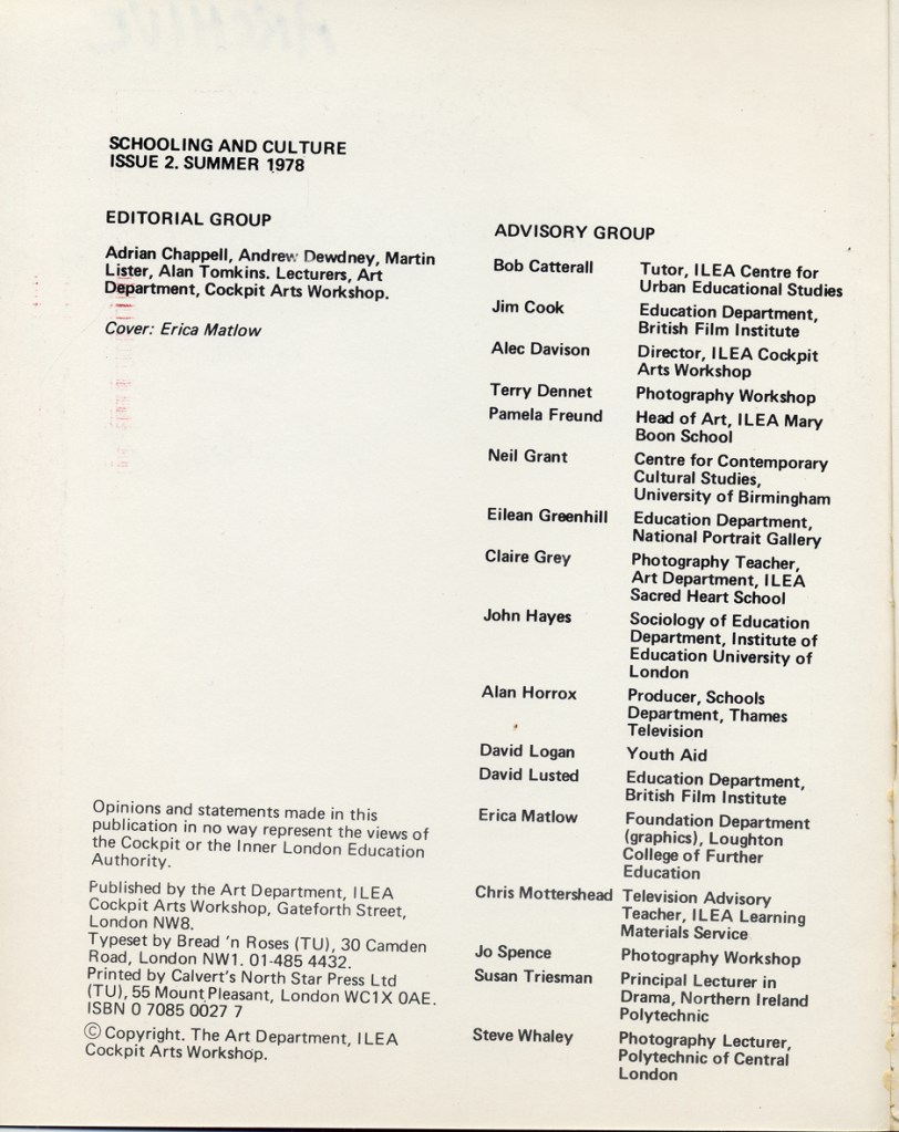 Adrian Chappell: ILEA Cockpit Cultural Studies Department Lynda Haddock: Peckham Urban Studies Centre