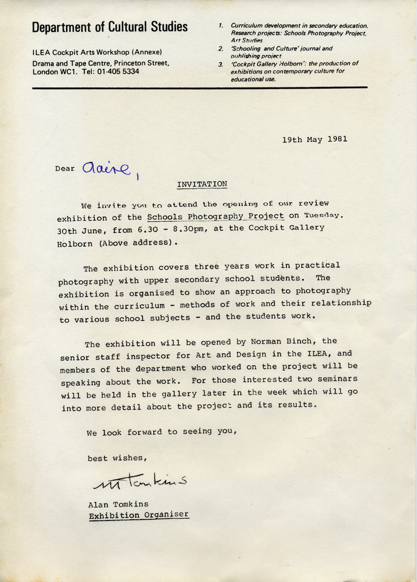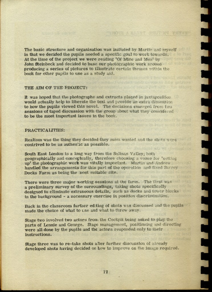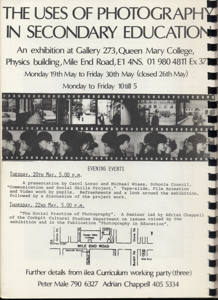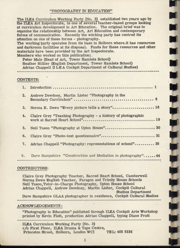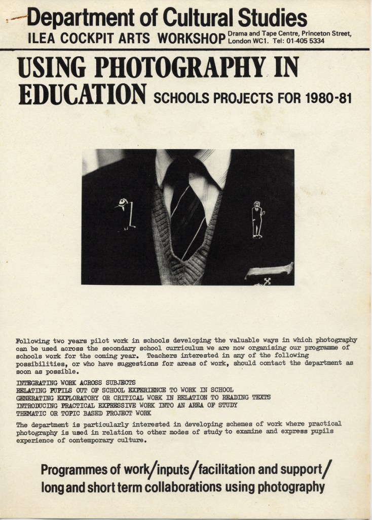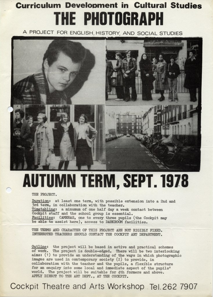 In May 1980 Photography in Education was produced by the ILEA Curriculum Working Party No.3. It included articles by the Cockpit Team which covered the background to their ideas, a reading list and a write-up of the photography projects at different institutions.