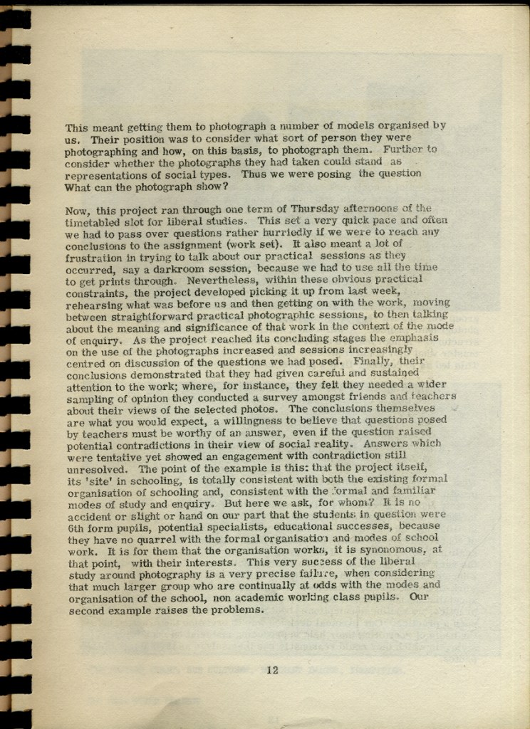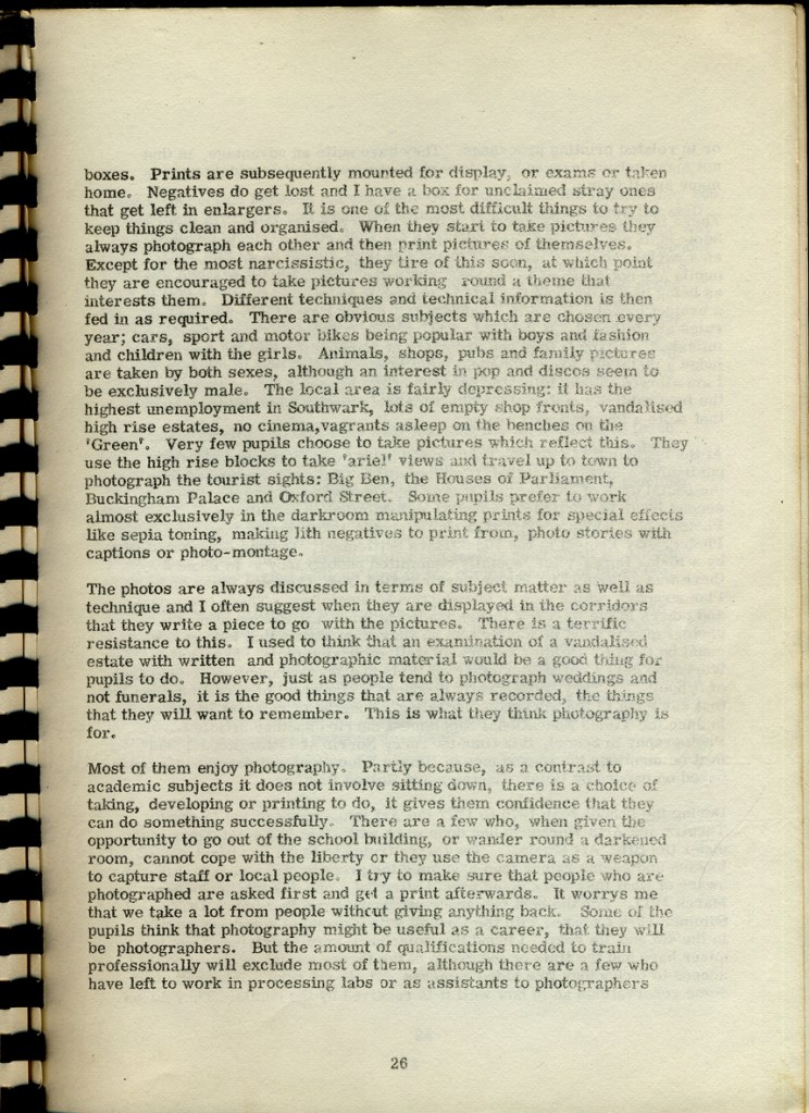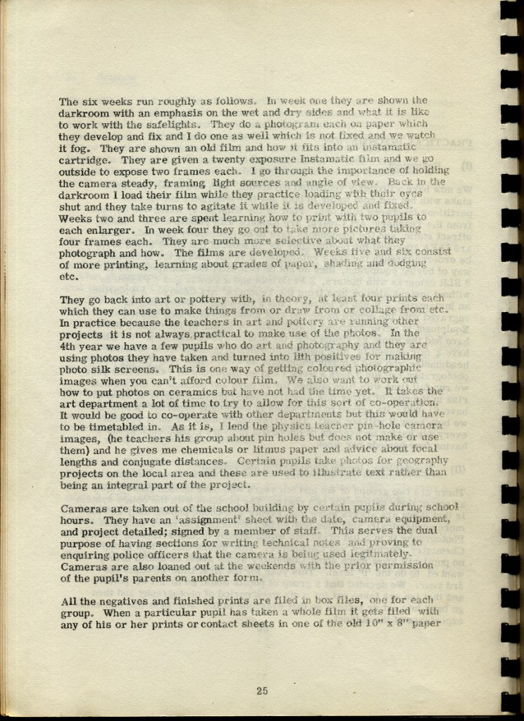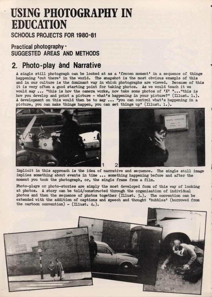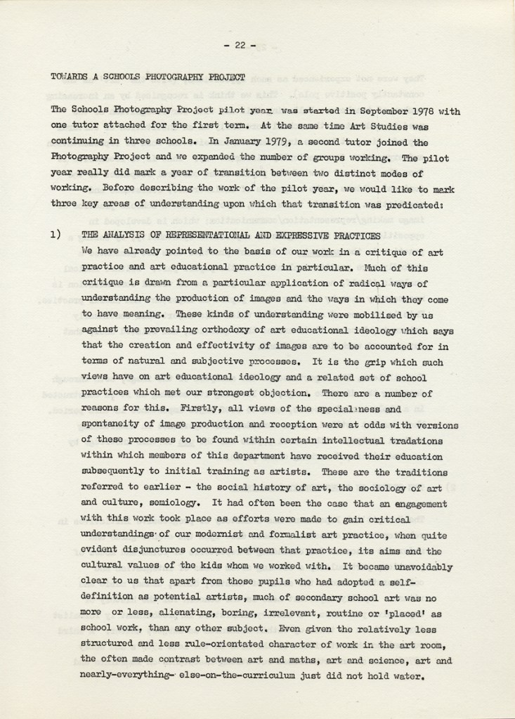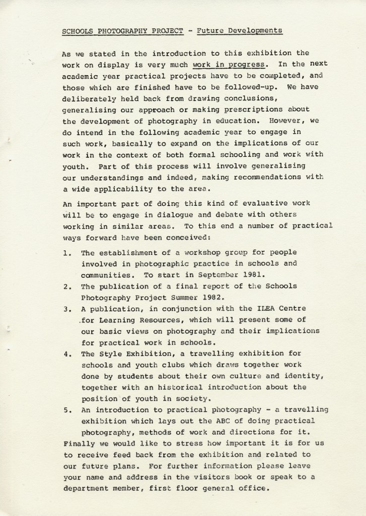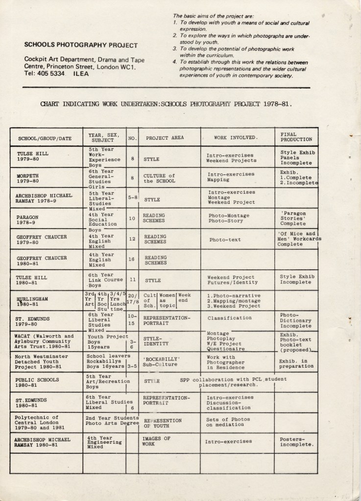 Out of the Art Studies work grew the Schools Photography Project. The pilot year ran from 1978-79.