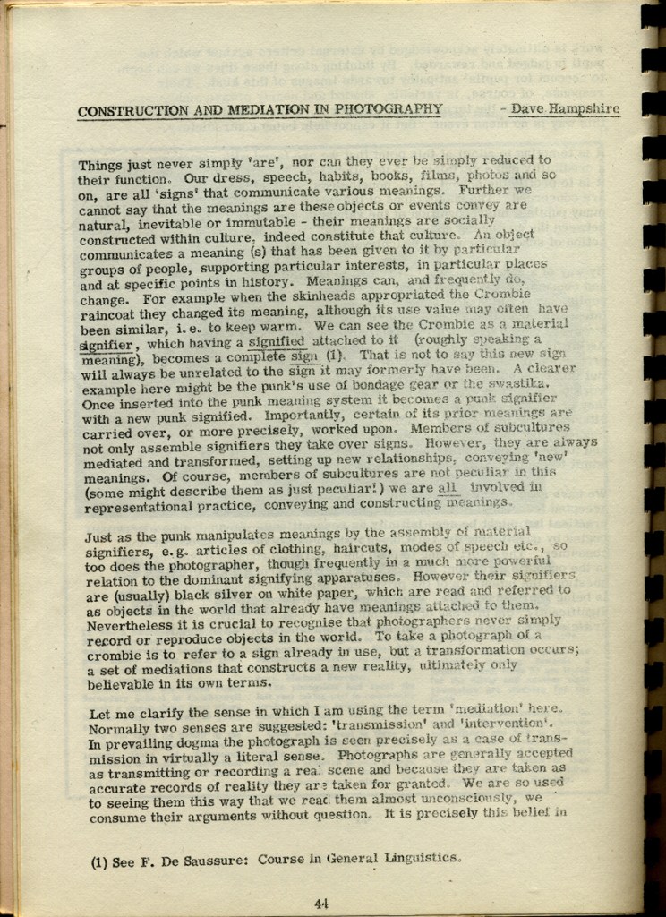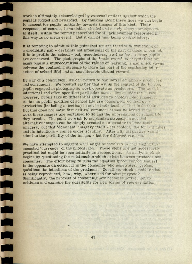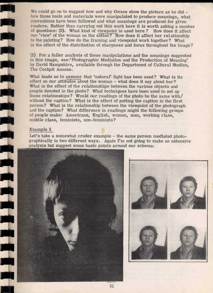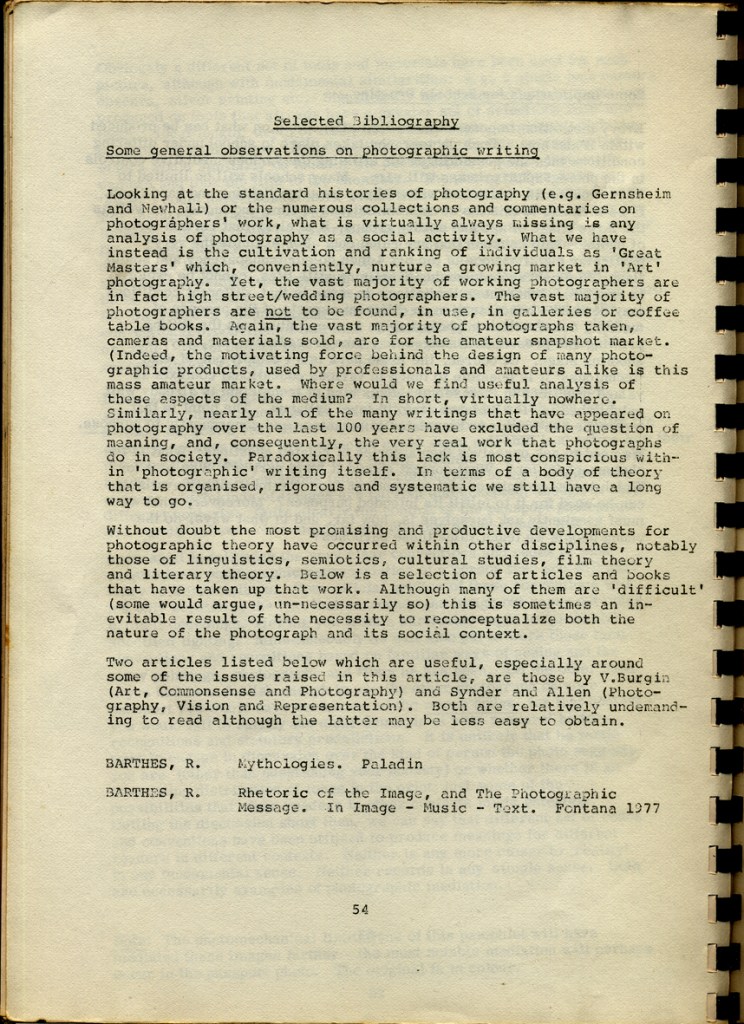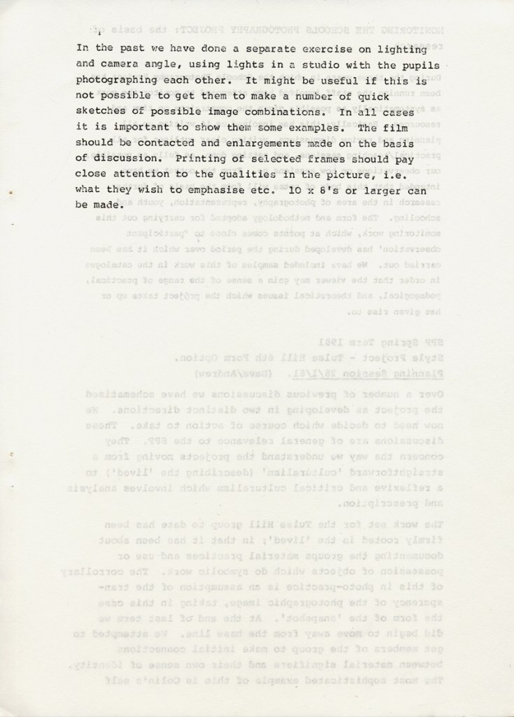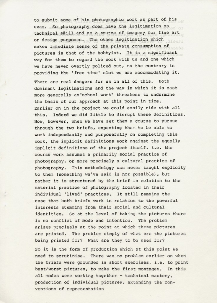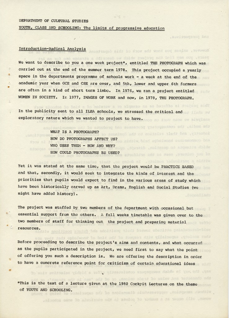 In the summer term of 1978 the department ran a one week project called The Photograph. An analysis of it was given as a lecture and written up in Photography Class and Schooling by Andrew Dewdney and Martin Lister in March 1980.