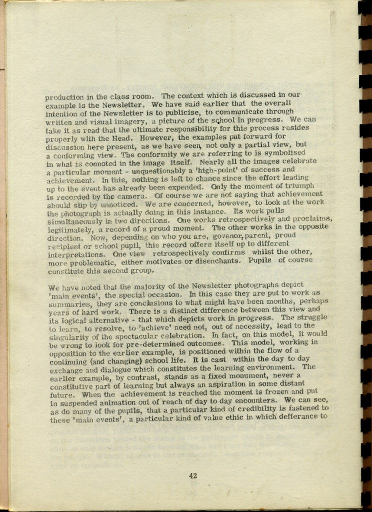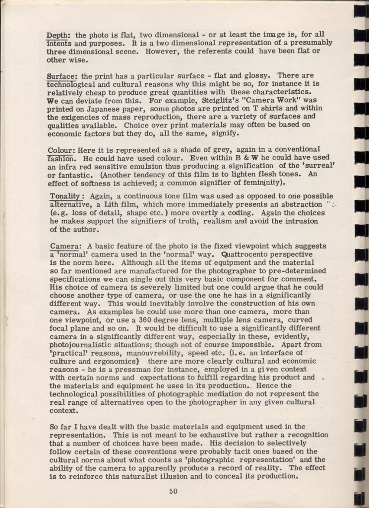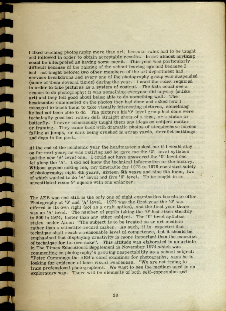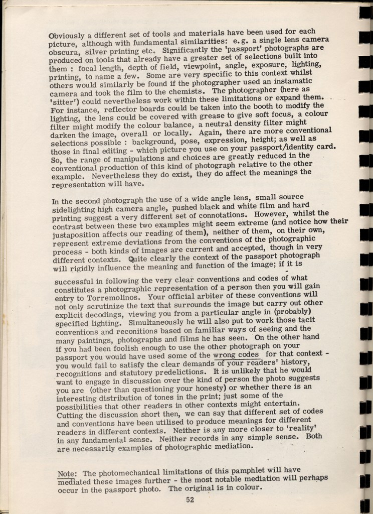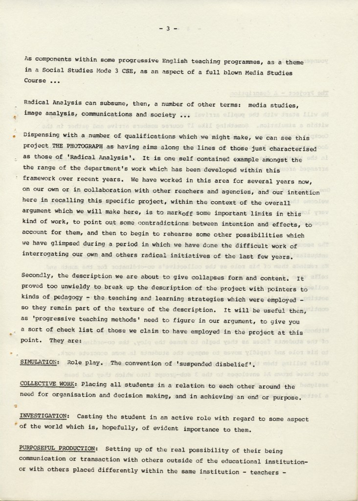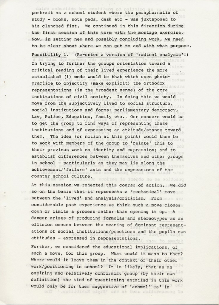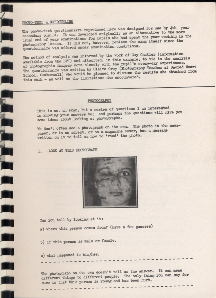 In the summer term of 1978 the department ran a one week project called The Photograph. An analysis of it was given as a lecture and written up in Photography Class and Schooling by Andrew Dewdney and Martin Lister in March 1980.