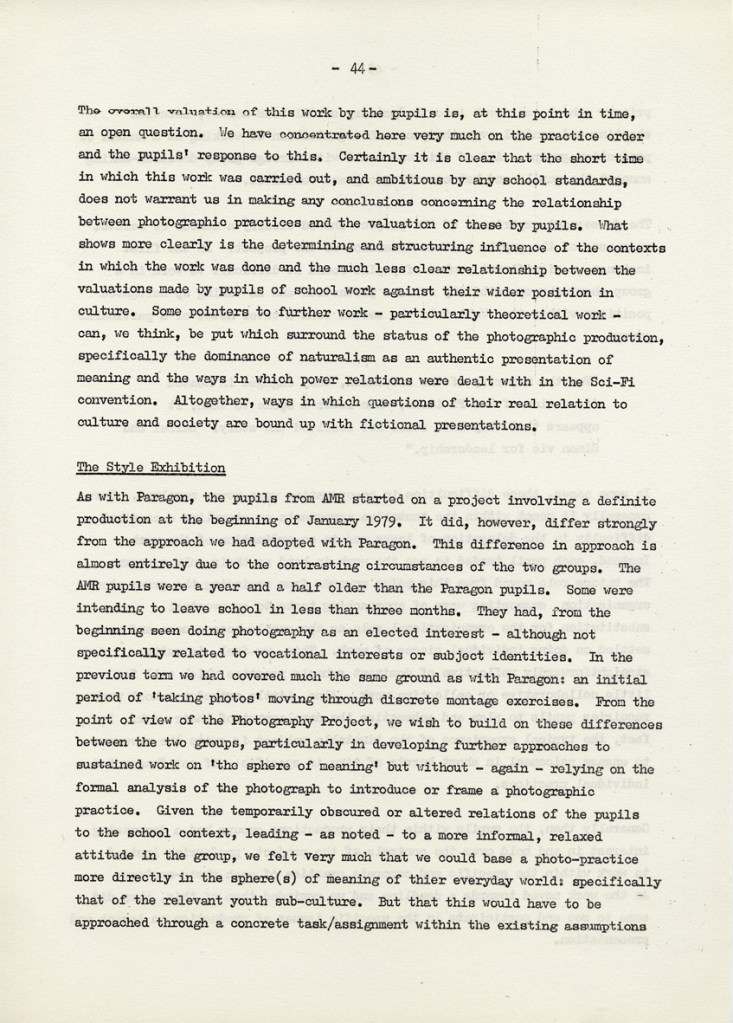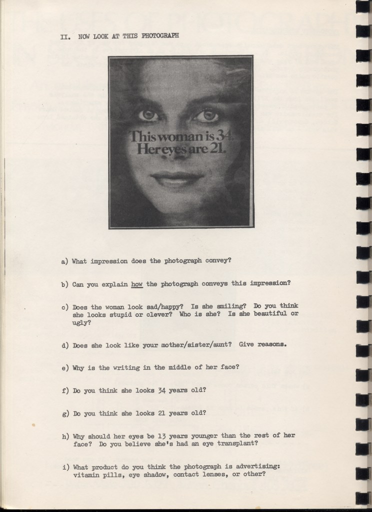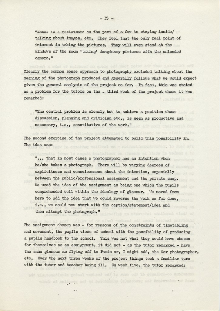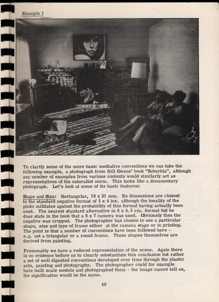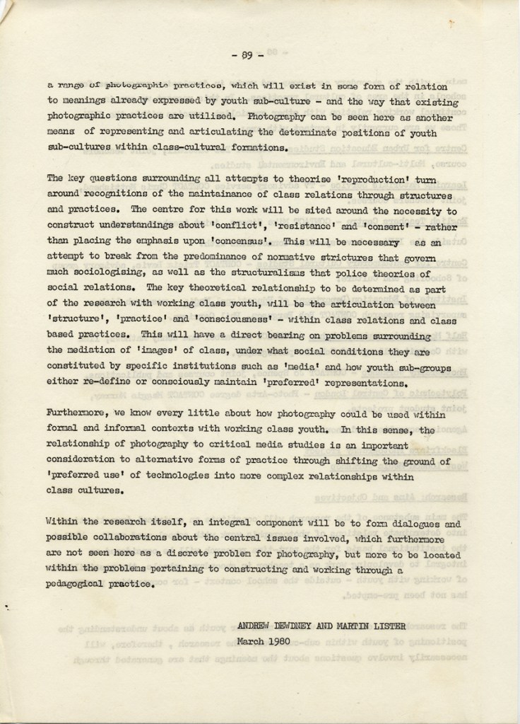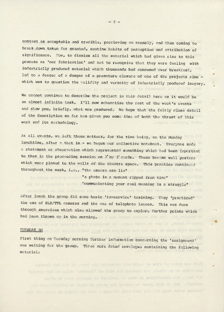 In the summer term of 1978 the department ran a one week project called The Photograph. An analysis of it was given as a lecture and written up in Photography Class and Schooling by Andrew Dewdney and Martin Lister in March 1980.