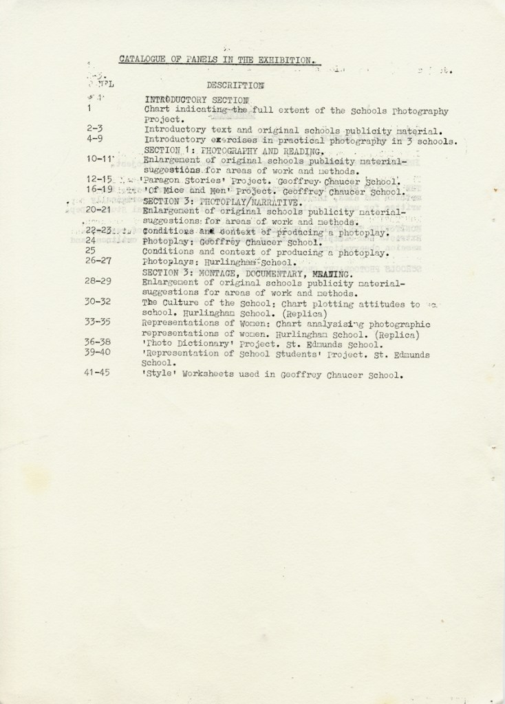 Schools Photography Project Work in Progress 78 – 81 was the catalogue of an exhibition held in 1981 which had 101 panels. The 15 organisations that they worked with were listed on the inside page.