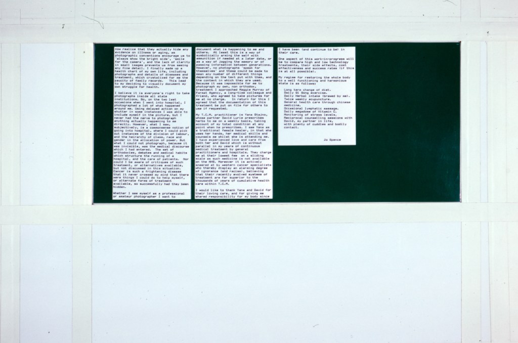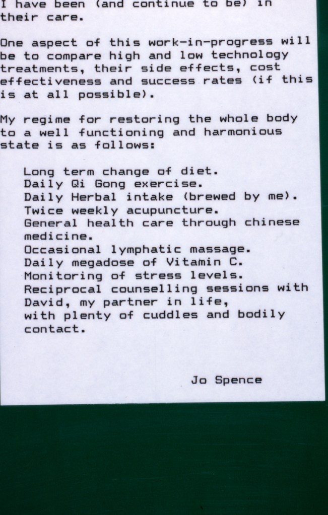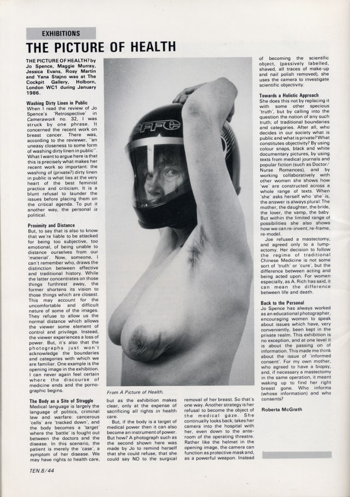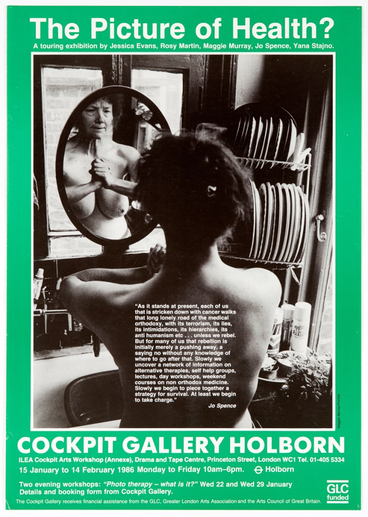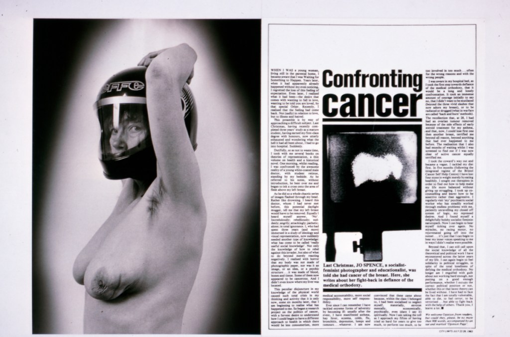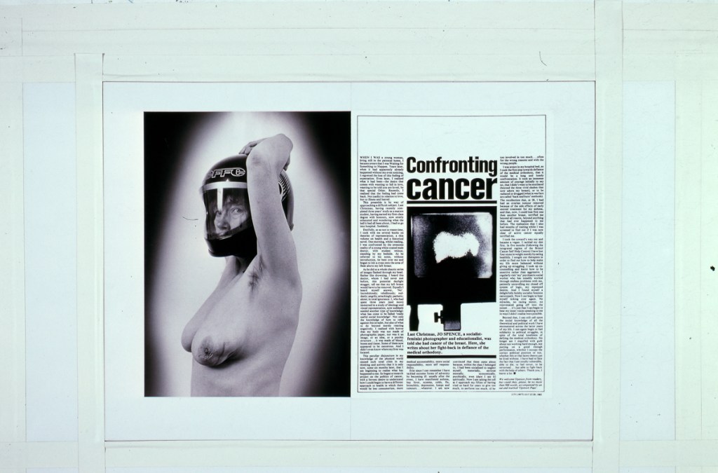 Continuing her visual autobiography, Jo Spence, working with Rosy Martin and Maggie Murray, records her struggle with breast cancer, finding new ways to heal herself outside orthodox medicine. The photo-therapy section shows the process of how her mind and body began to change, and the exhibition as a whole raises important ideological and political questions. Available in long or short versions.