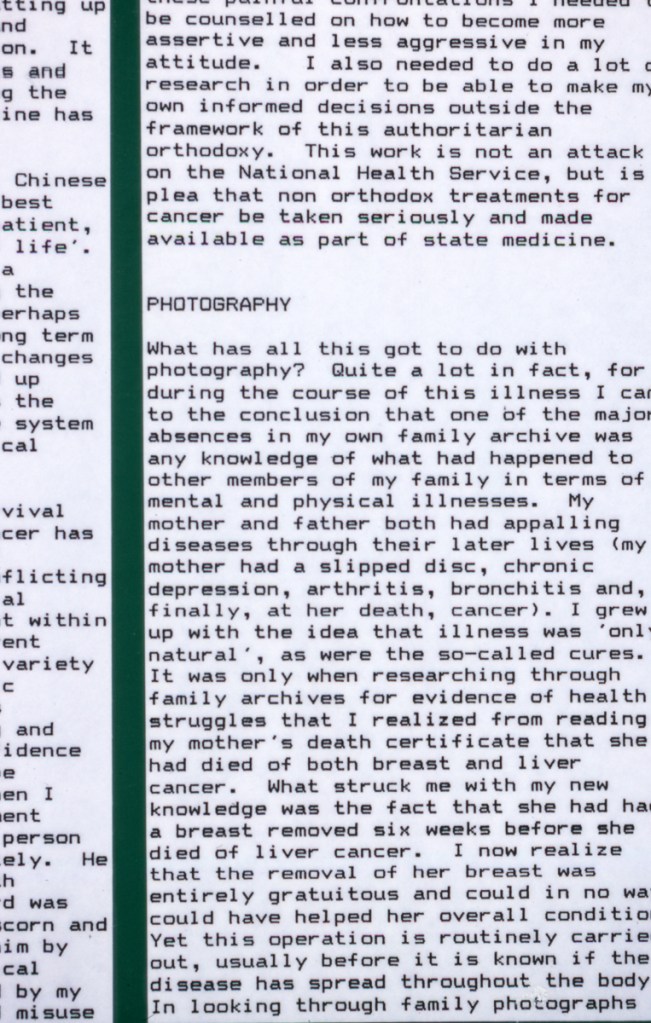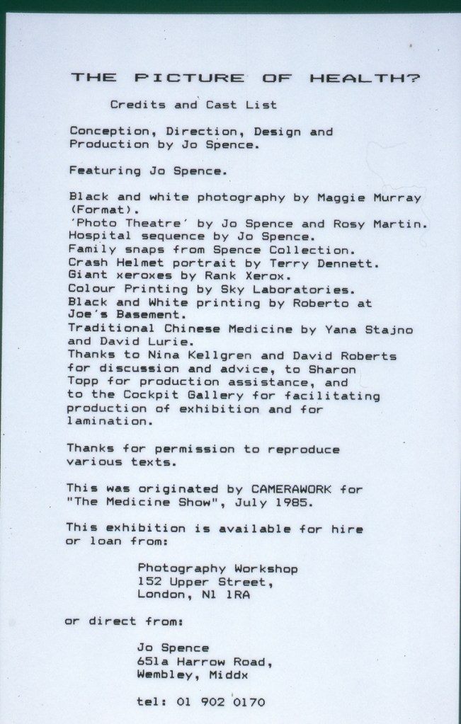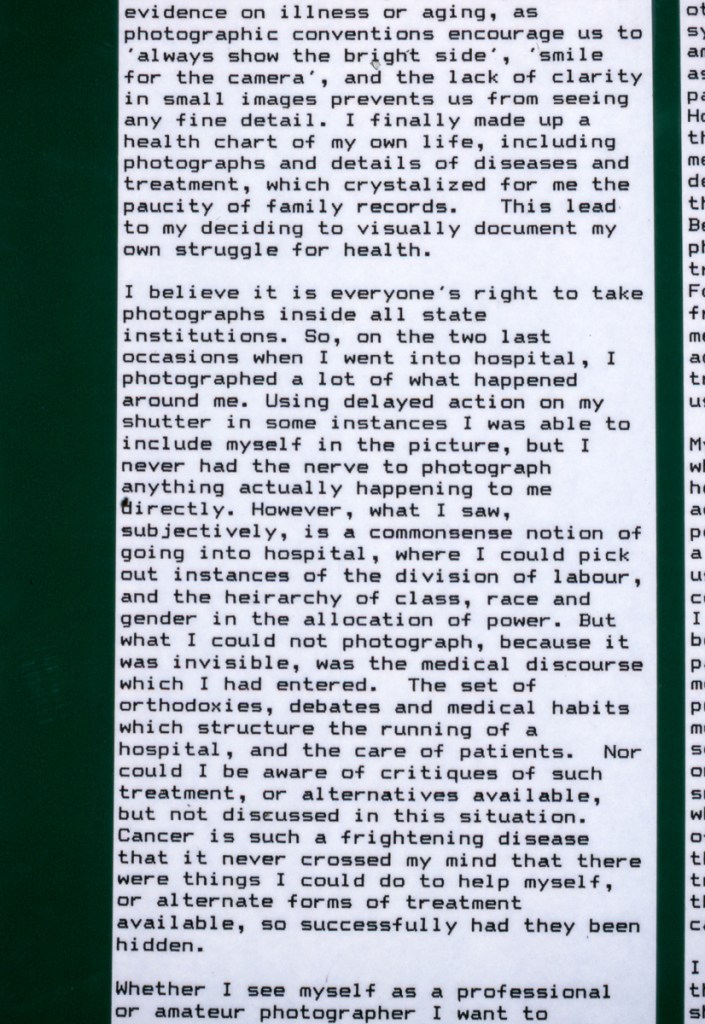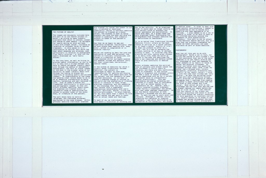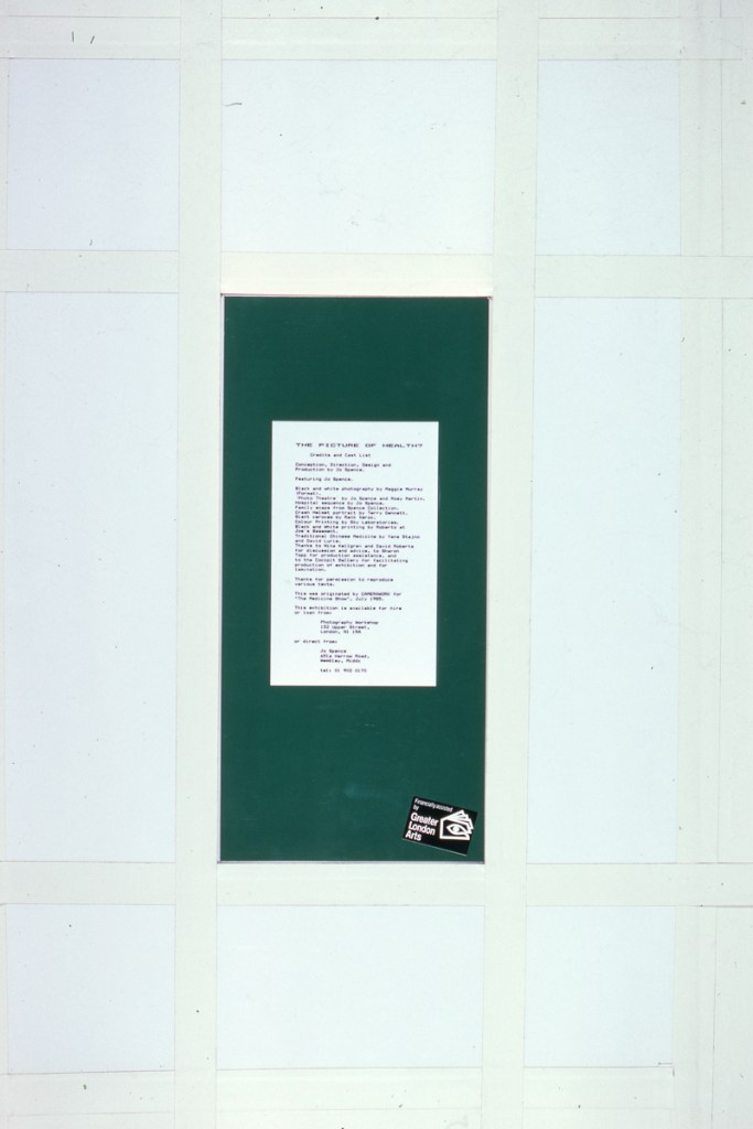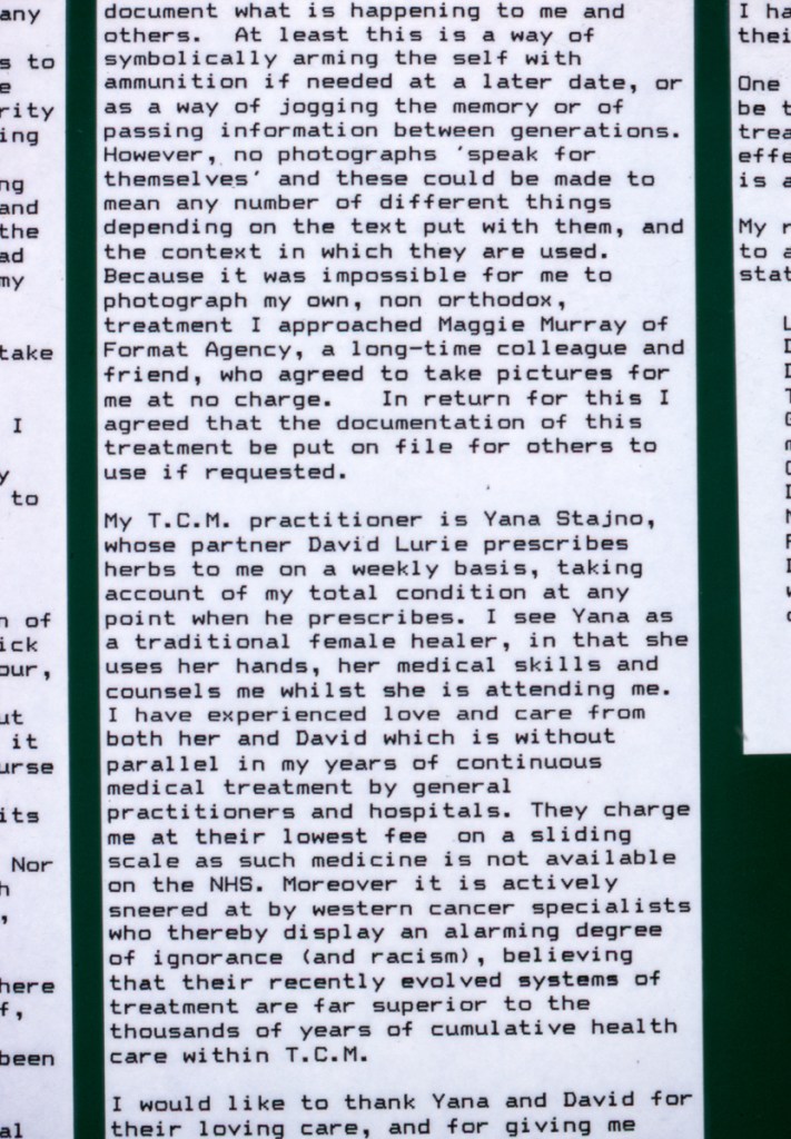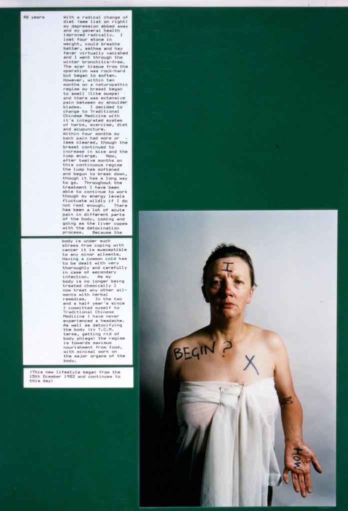 Continuing her visual autobiography, Jo Spence, working with Rosy Martin and Maggie Murray, records her struggle with breast cancer, finding new ways to heal herself outside orthodox medicine. The photo-therapy section shows the process of how her mind and body began to change, and the exhibition as a whole raises important ideological and political questions. Available in long or short versions.