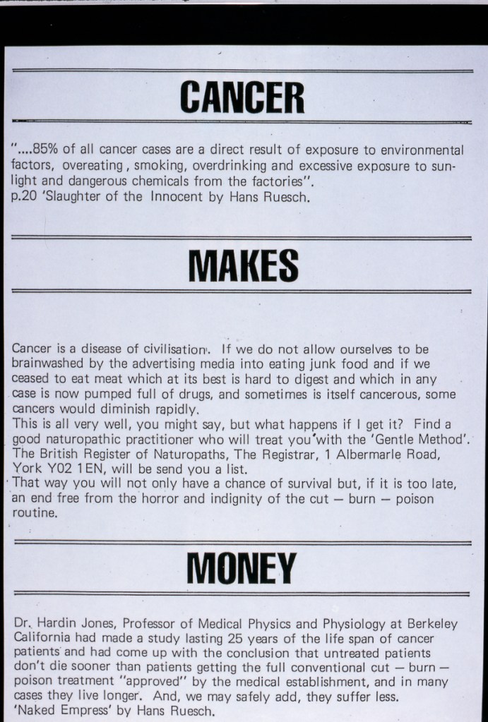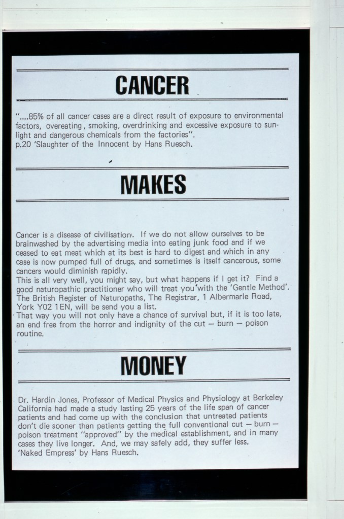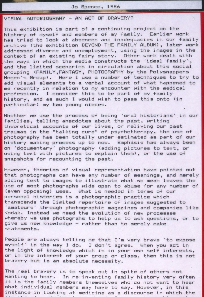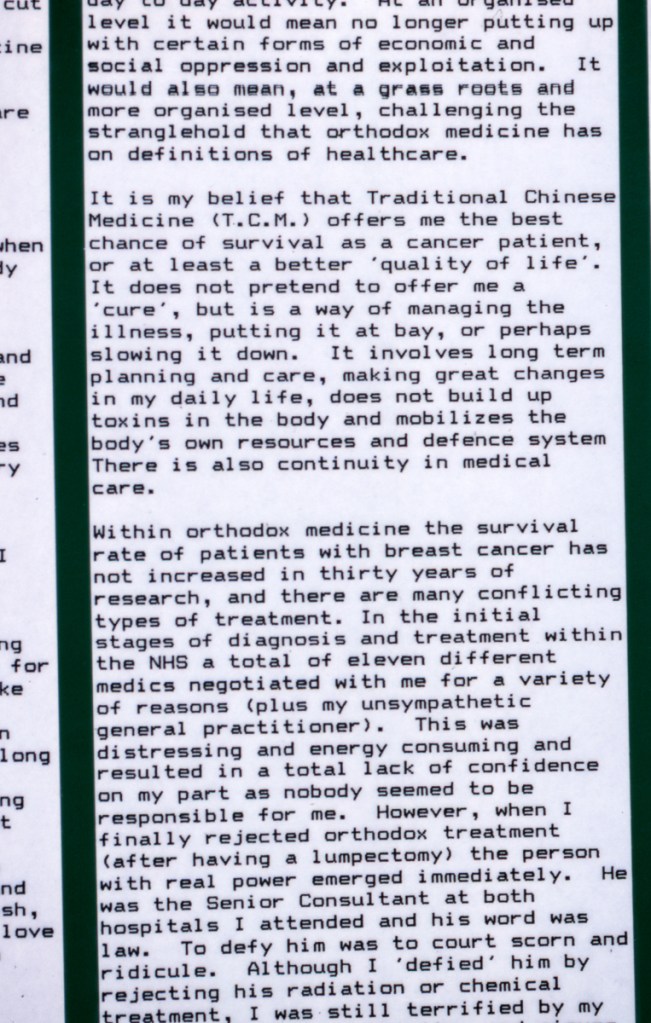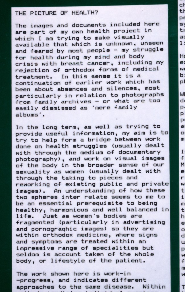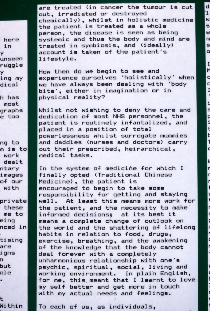 Continuing her visual autobiography, Jo Spence, working with Rosy Martin and Maggie Murray, records her struggle with breast cancer, finding new ways to heal herself outside orthodox medicine. The photo-therapy section shows the process of how her mind and body began to change, and the exhibition as a whole raises important ideological and political questions. Available in long or short versions.