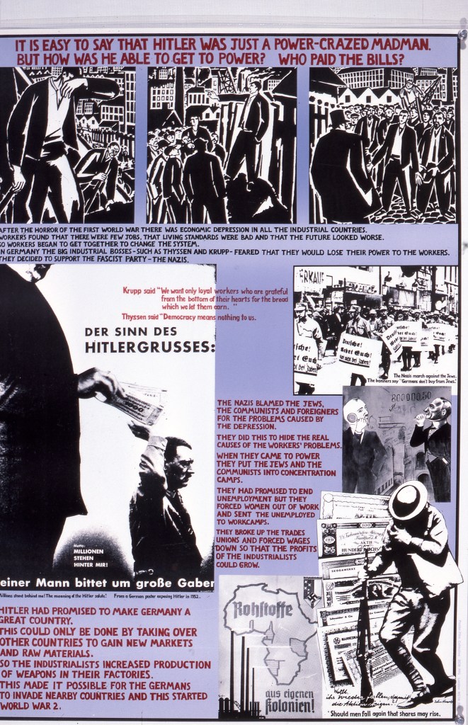 The posters present history as experienced by workers, peasants and slaves rather than as the story of heroes and kings. They put forward ways of understanding why there is an unequal distribution of wealth throughout the world, showing how the question of racism cannot be separated from the worldwide development of Western economic power over the last 400 years.
